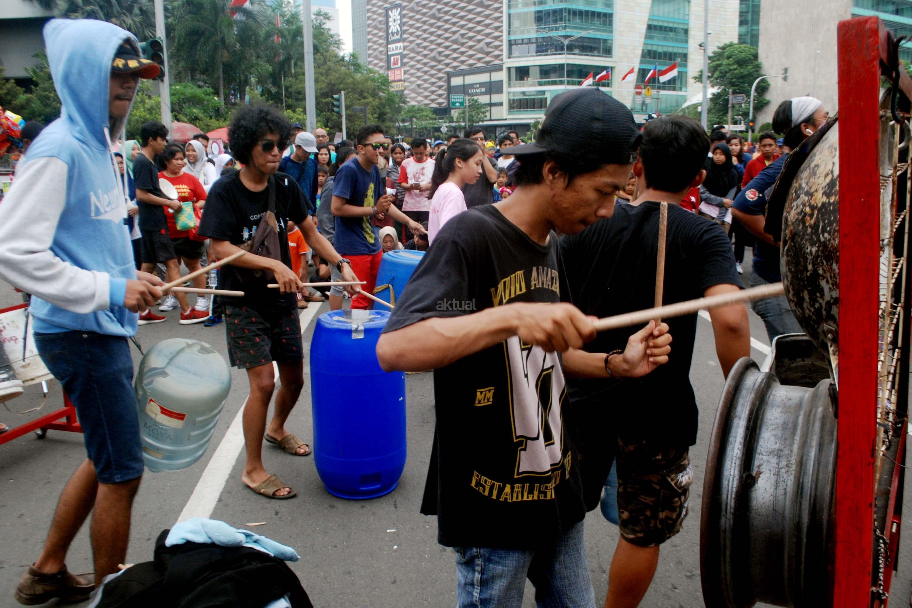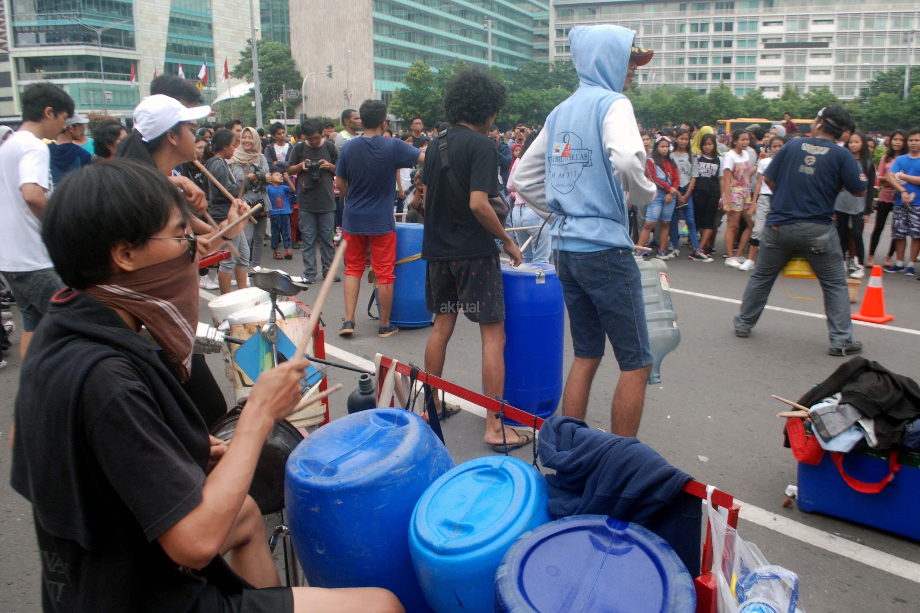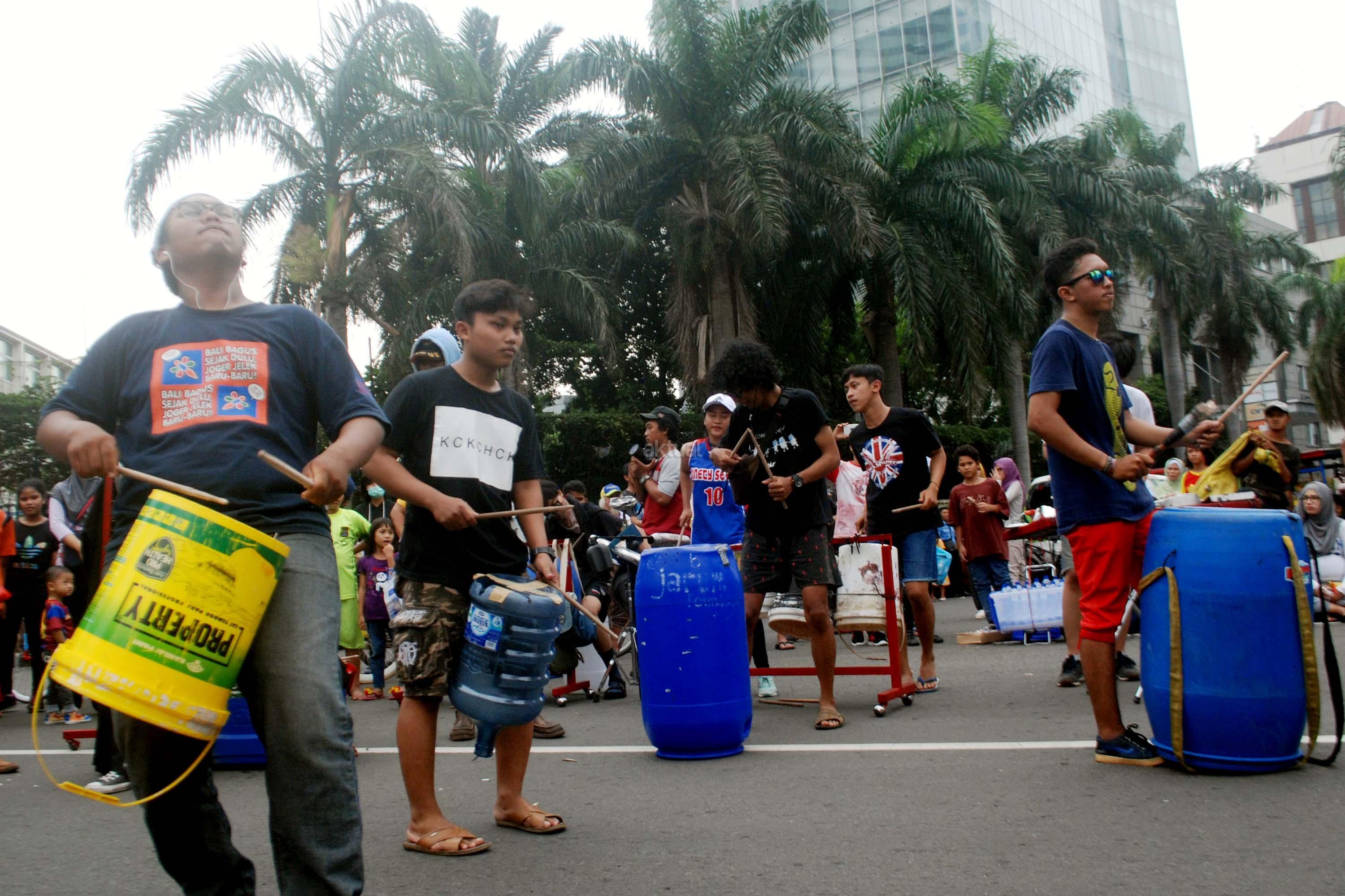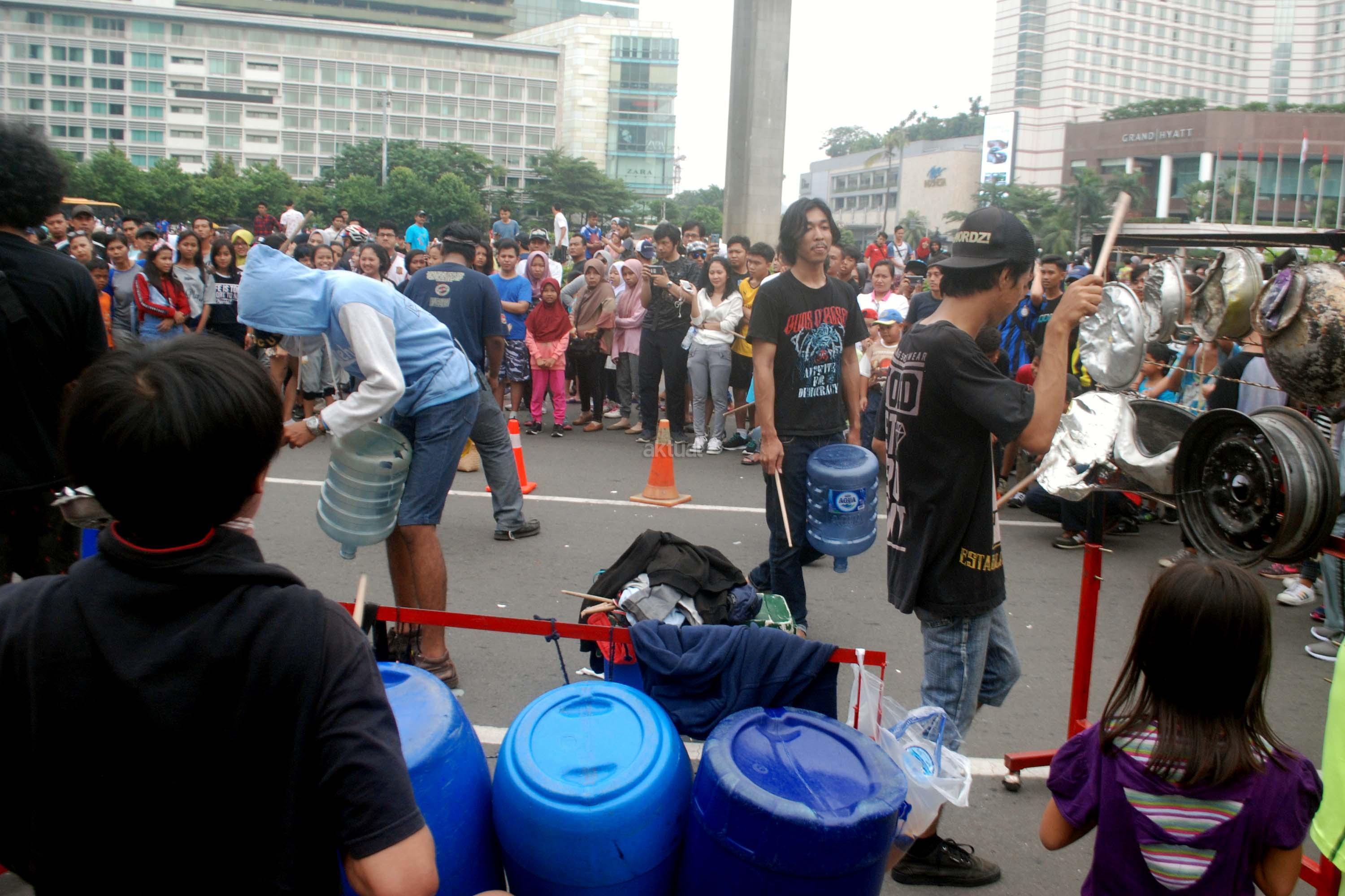 Sejumlah mahasiwa dari Institut Ilmu Sosial dan Ilmu Politik (IISIP) yang tergabung dalam Kreasi Musik Mahasiswa IISIP (Kremmasi) memainkan alat musik dari barang bekas di kawasan Bundaran HI, Jakarta, Minggu (14/5/2017).Pertujukan itu juga mengajak masyarakat untuk memanfaatkan barang bekas sebaik mungkin. AKTUAL/Munzir