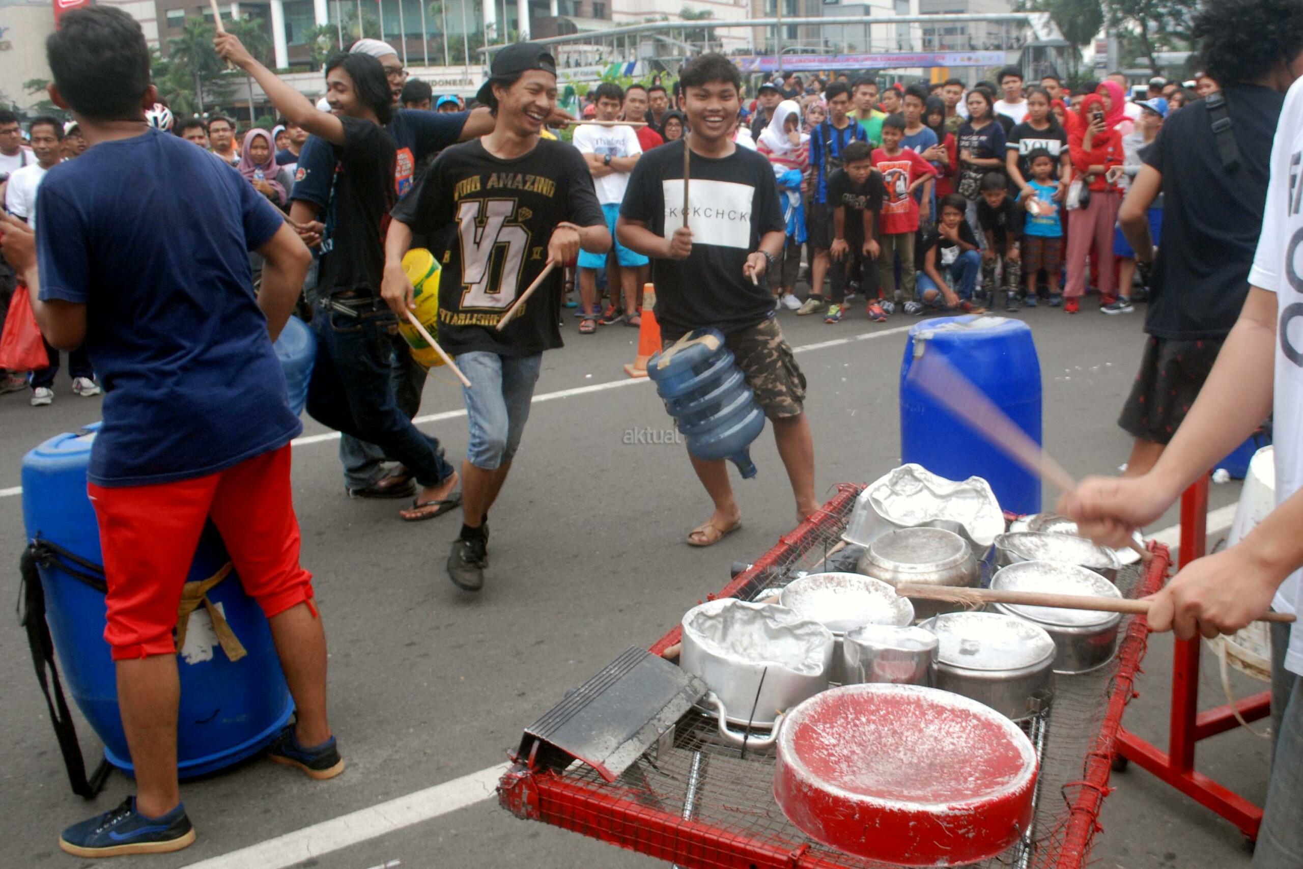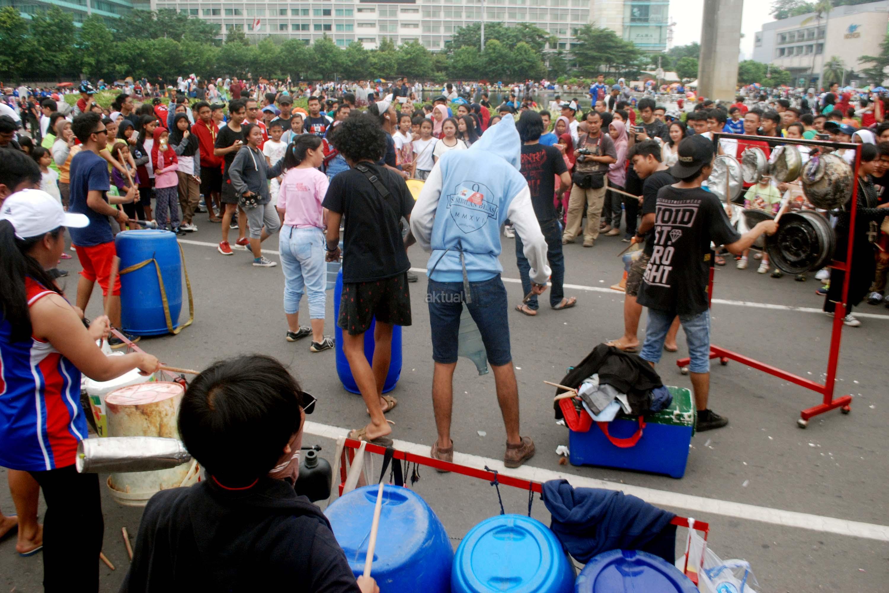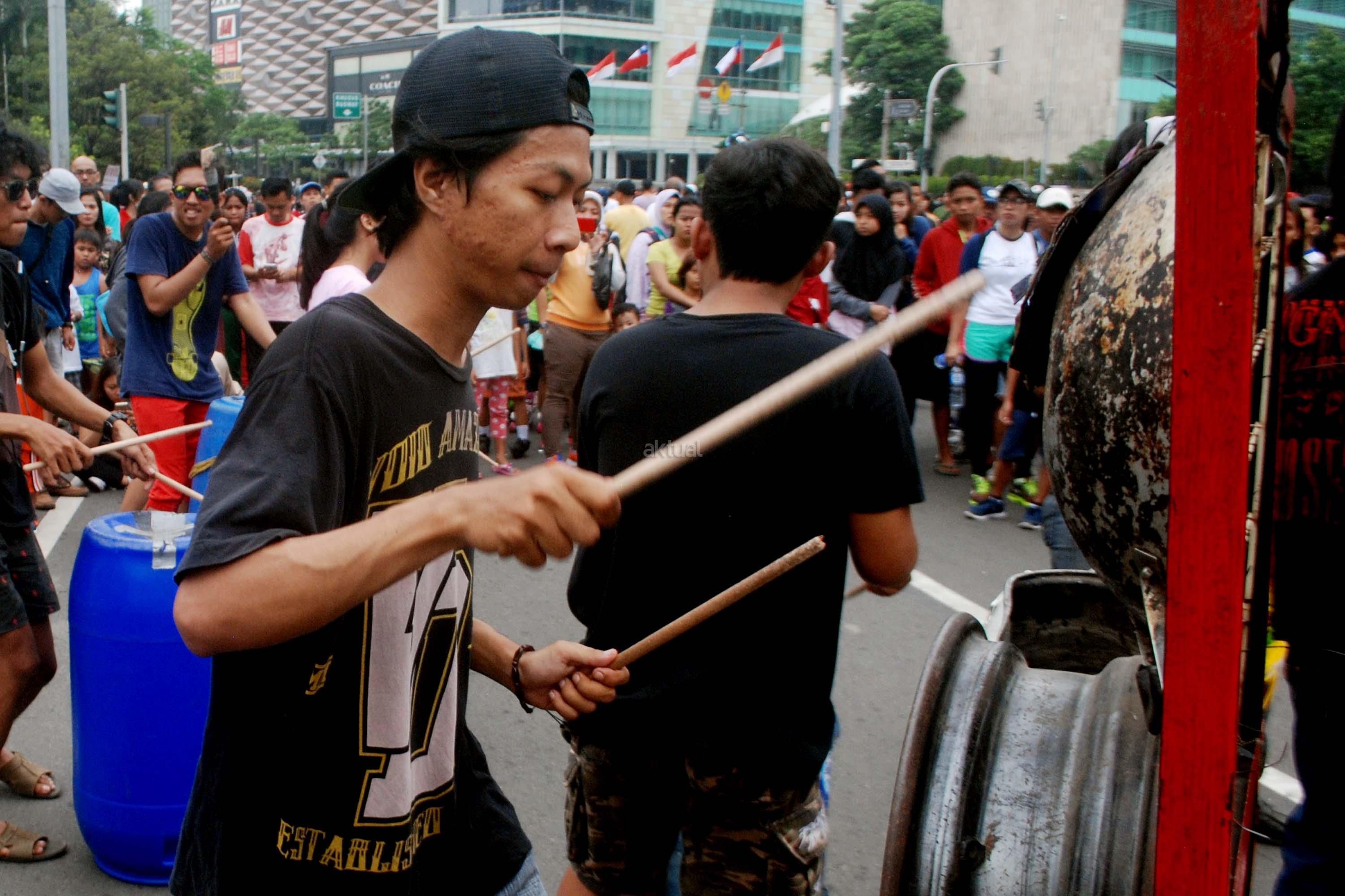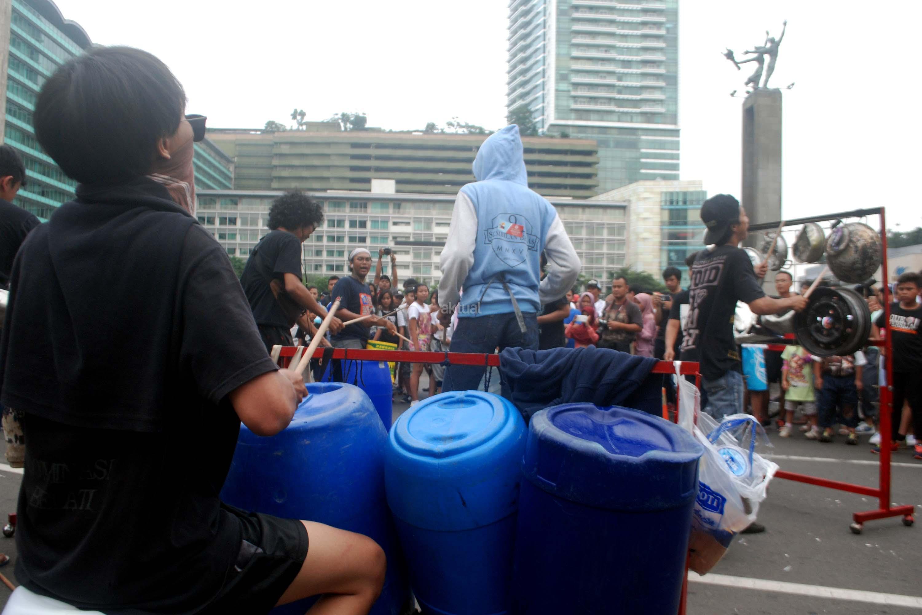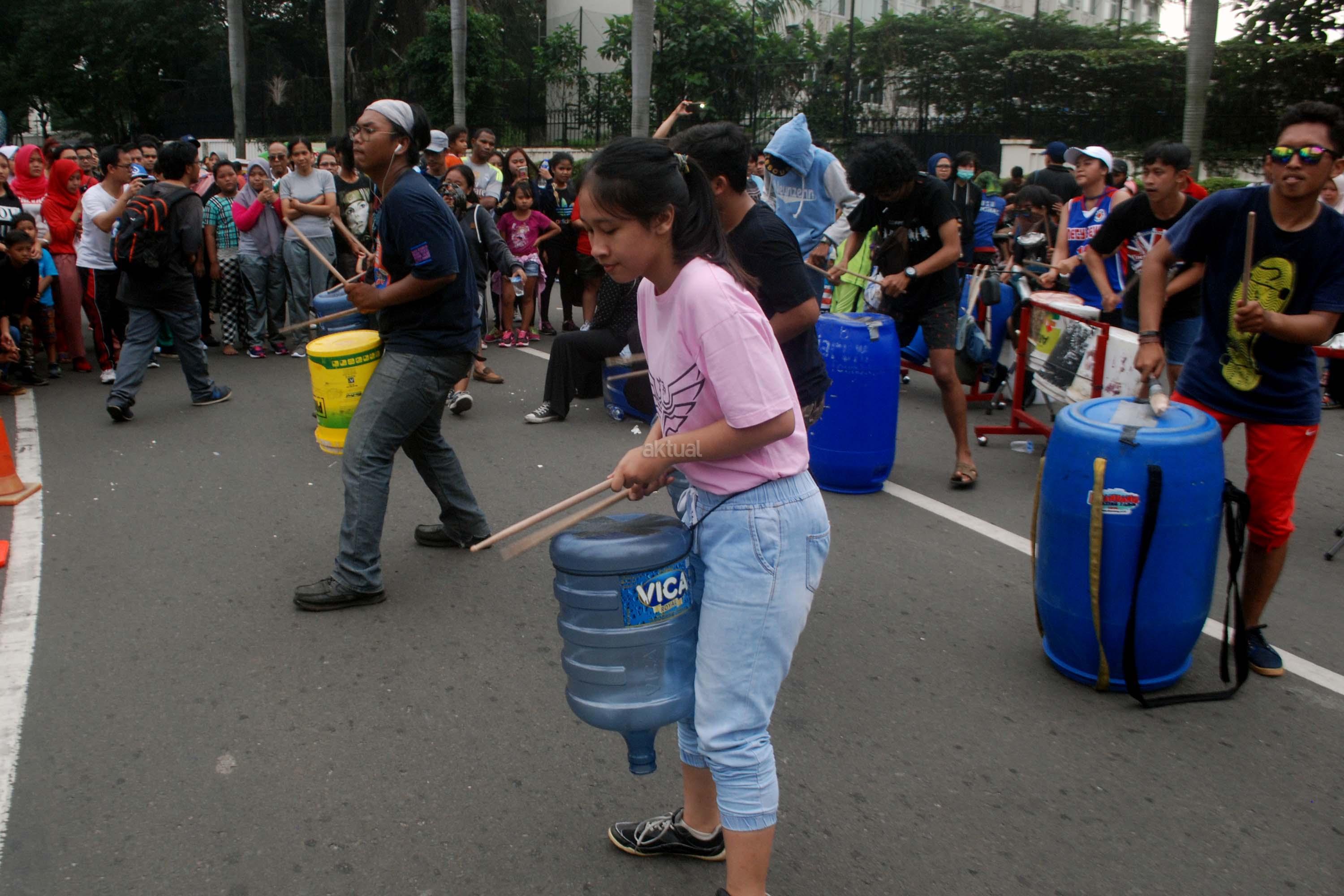 Sejumlah mahasiwa dari Institut Ilmu Sosial dan Ilmu Politik (IISIP) yang tergabung dalam Kreasi Musik Mahasiswa IISIP (Kremmasi) memainkan alat musik dari barang bekas di kawasan Bundaran HI, Jakarta, Minggu (14/5/2017).Pertujukan itu juga mengajak masyarakat untuk memanfaatkan barang bekas sebaik mungkin. AKTUAL/Munzir