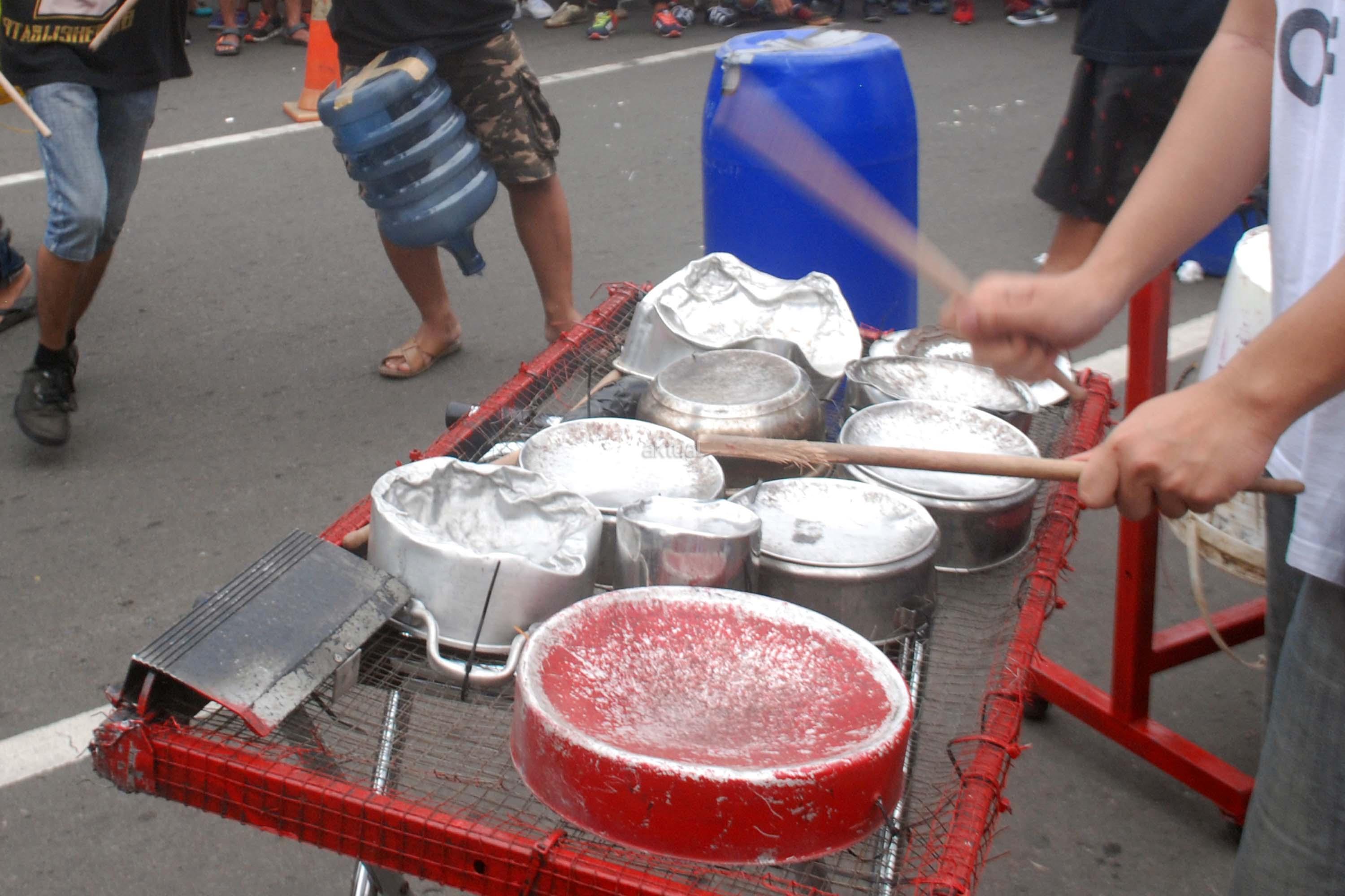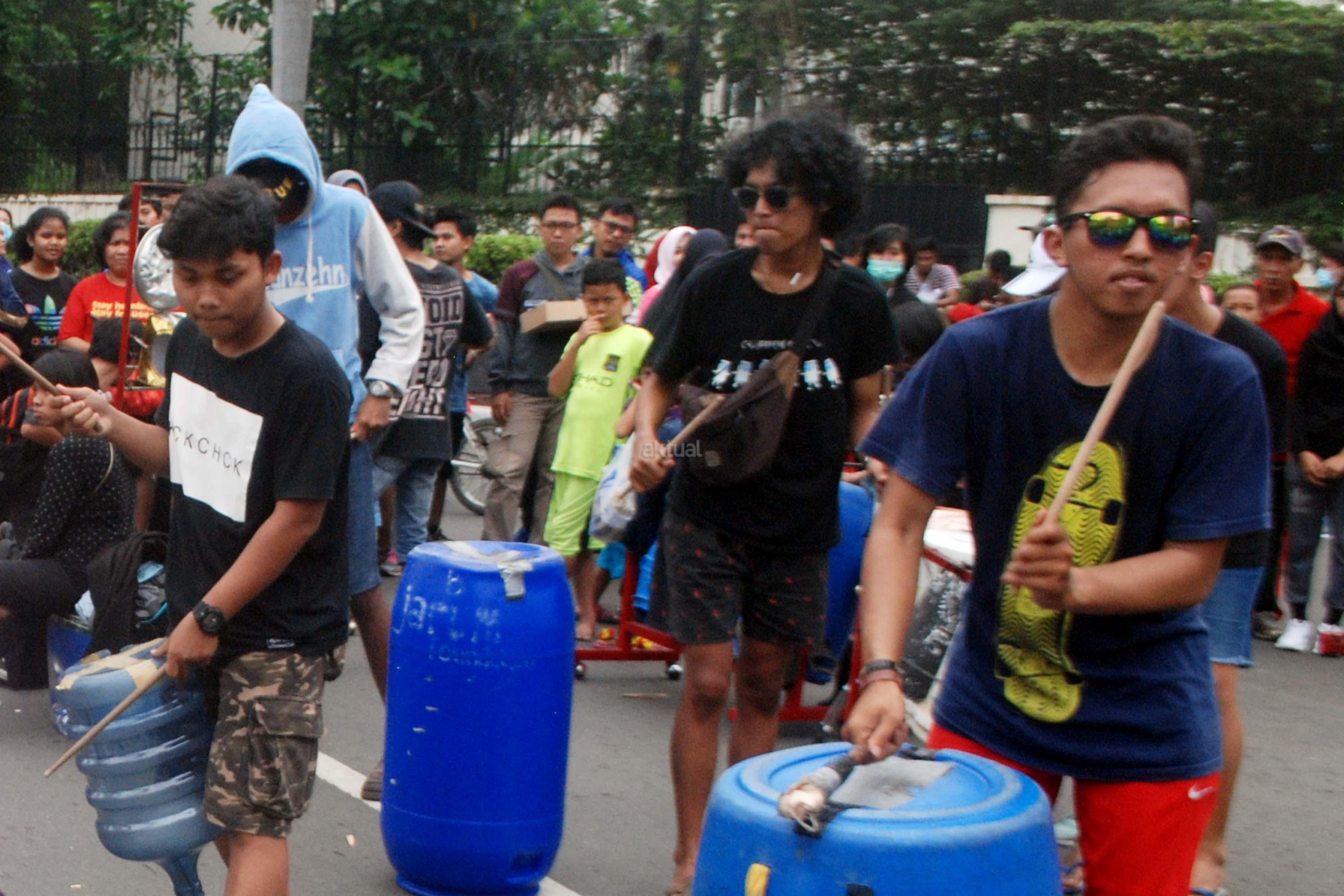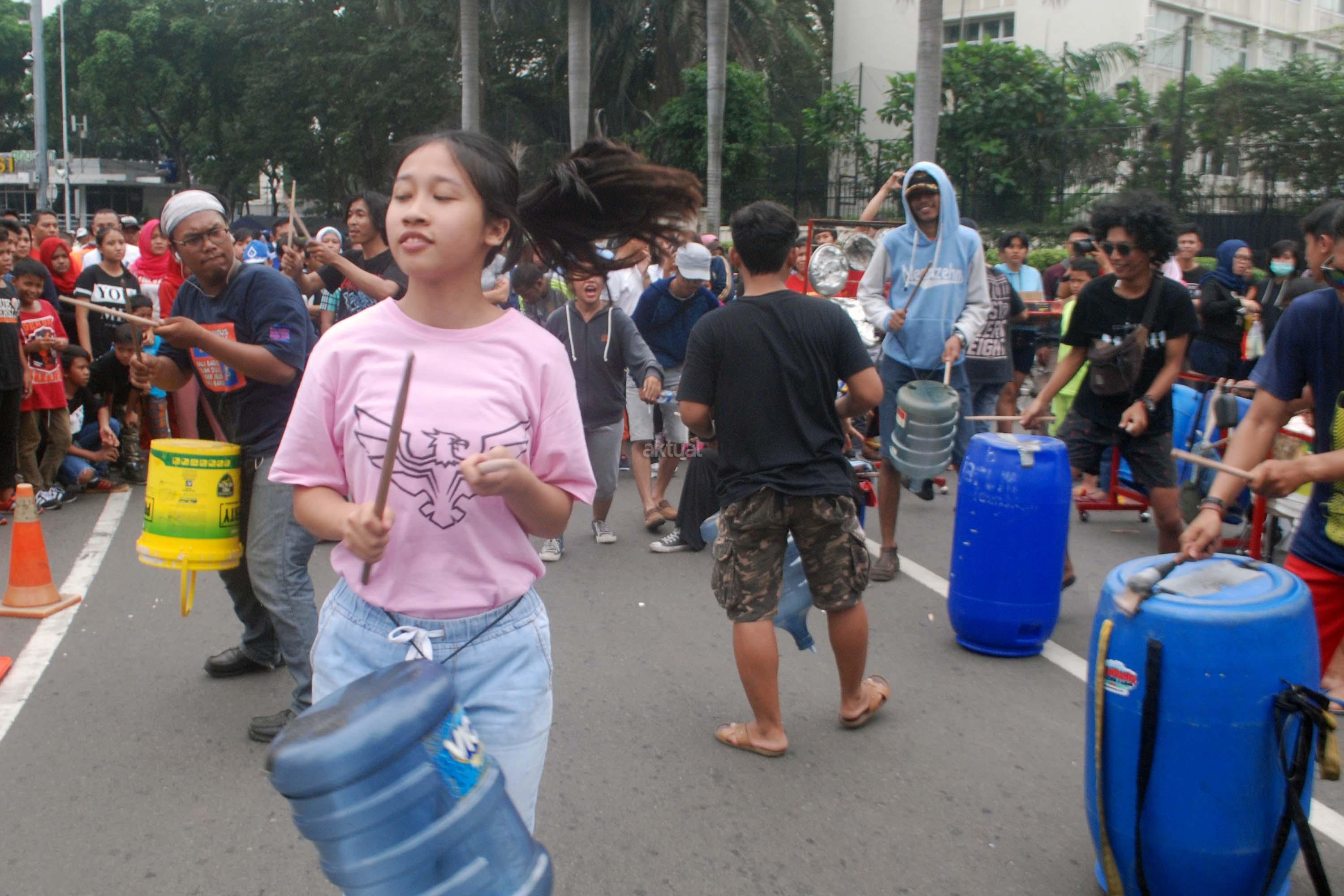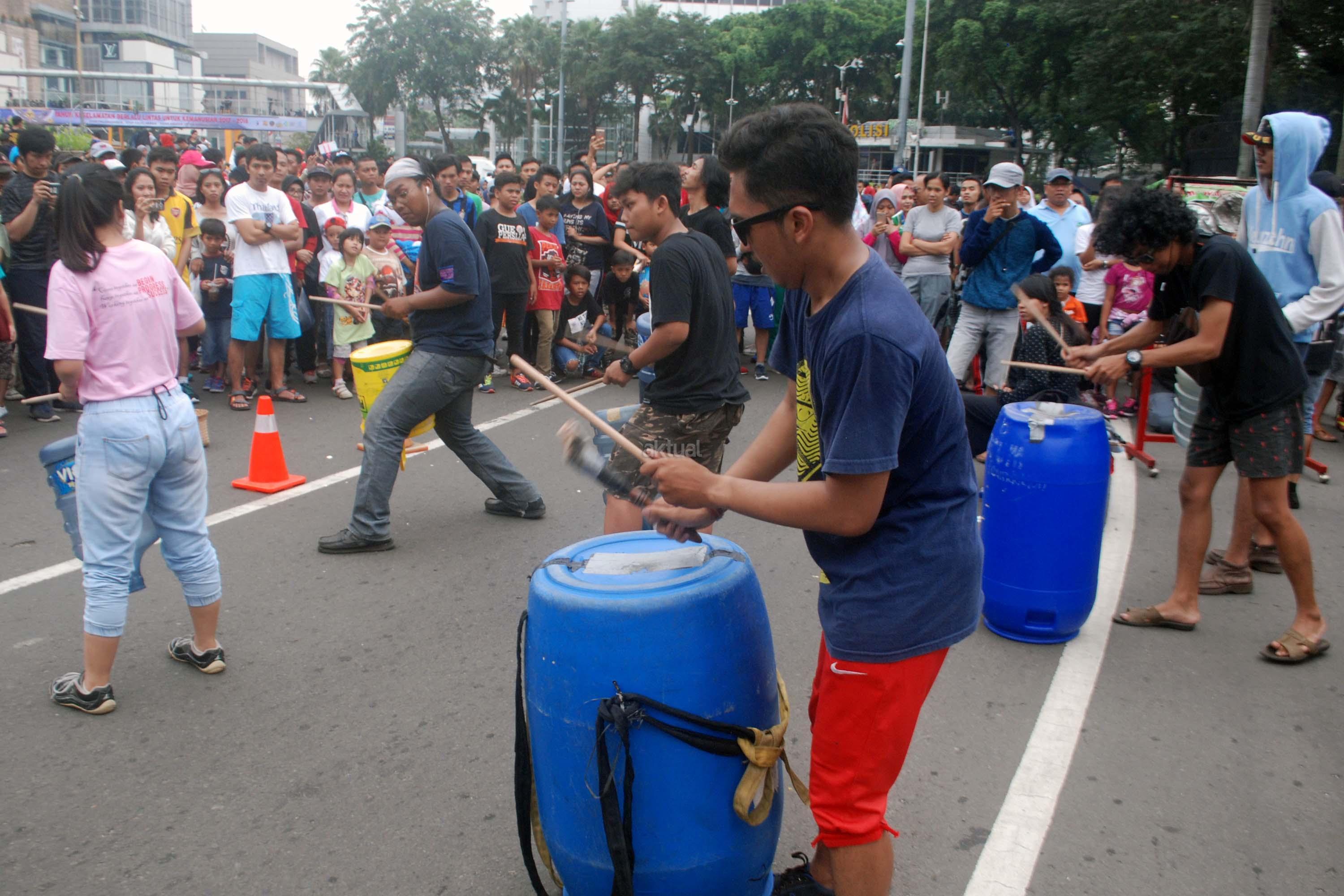Sejumlah mahasiwa dari Institut Ilmu Sosial dan Ilmu Politik (IISIP) yang tergabung dalam Kreasi Musik Mahasiswa IISIP (Kremmasi) memainkan alat musik dari barang bekas di kawasan Bundaran HI, Jakarta, Minggu (14/5/2017).Pertujukan itu juga mengajak masyarakat untuk memanfaatkan barang bekas sebaik mungkin. AKTUAL/Munzir