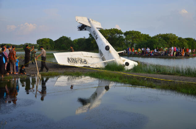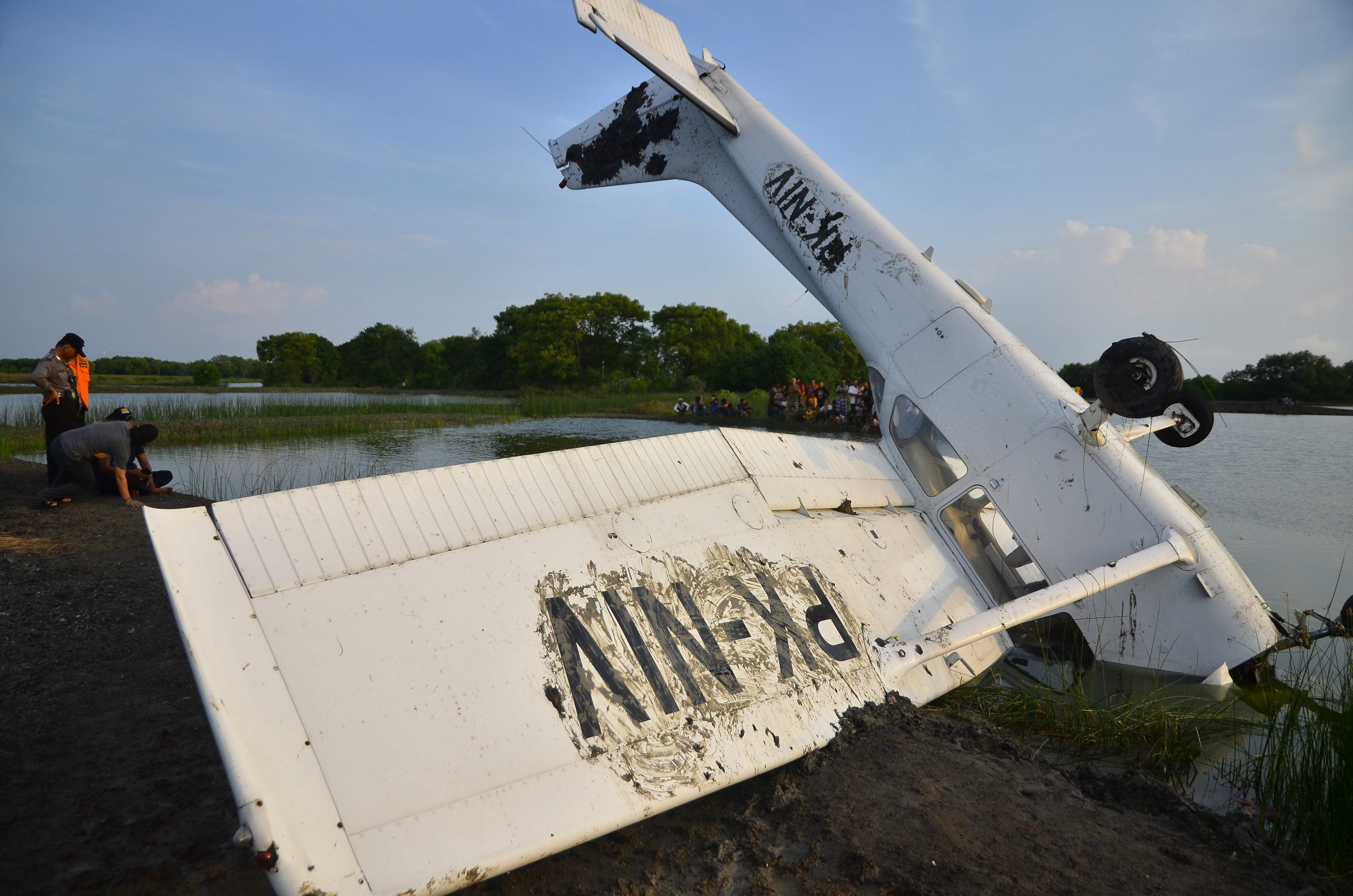 Warga menyaksikan pesawat yang mengalami kecelakaan di area Tambak Nggojoyo, Desa Wedung, Demak, Jawa Tengah, Senin (20/6). Pesawat terbang latih jenis CESNA 172 PK-NIV milik sekolah penerbangan PT Nusa Fliying Internasional (NFI) tersebut mengalami kecelakaan saat sedang latihan terbang, dalam kejadian itu Pilot Boby Sinatra (20) dan Co Pilot Joshua Adolf Wamena (20) mengalami luka ringan. ANTARA FOTO/Yusuf Nugroho/pd/16.