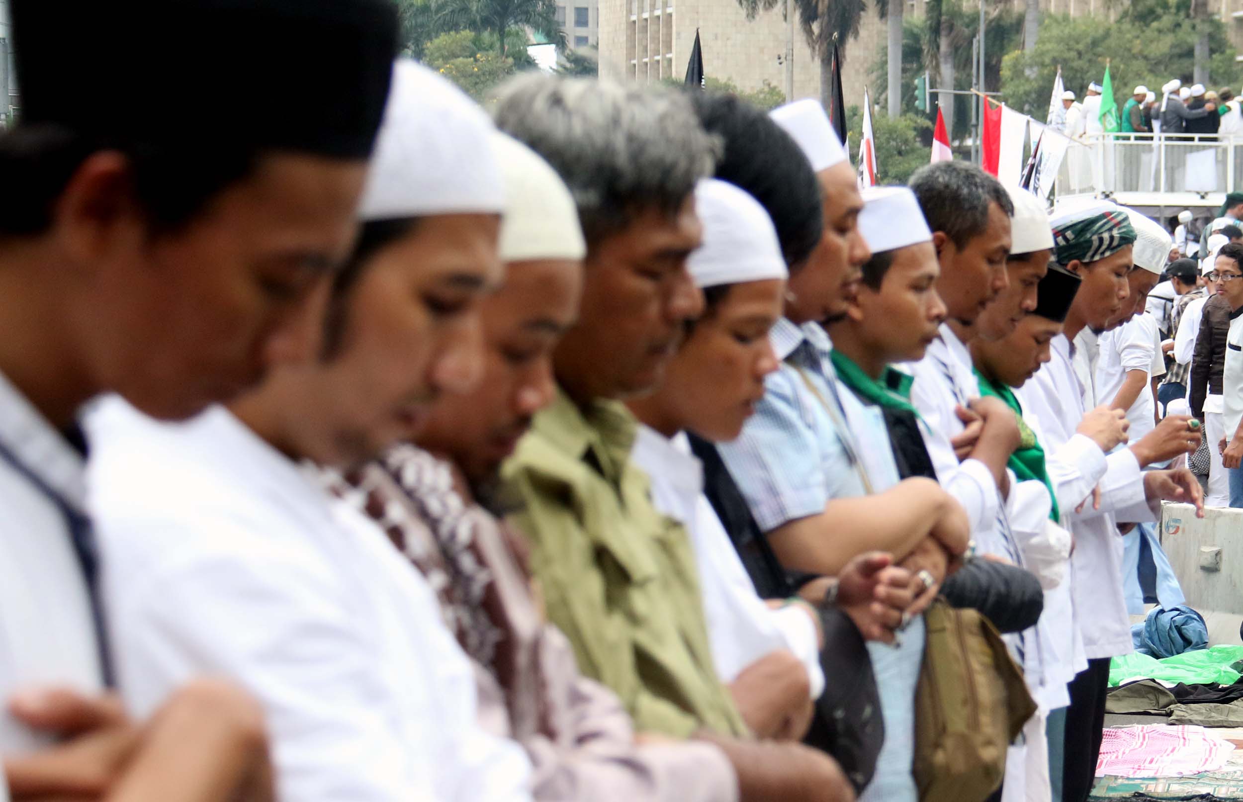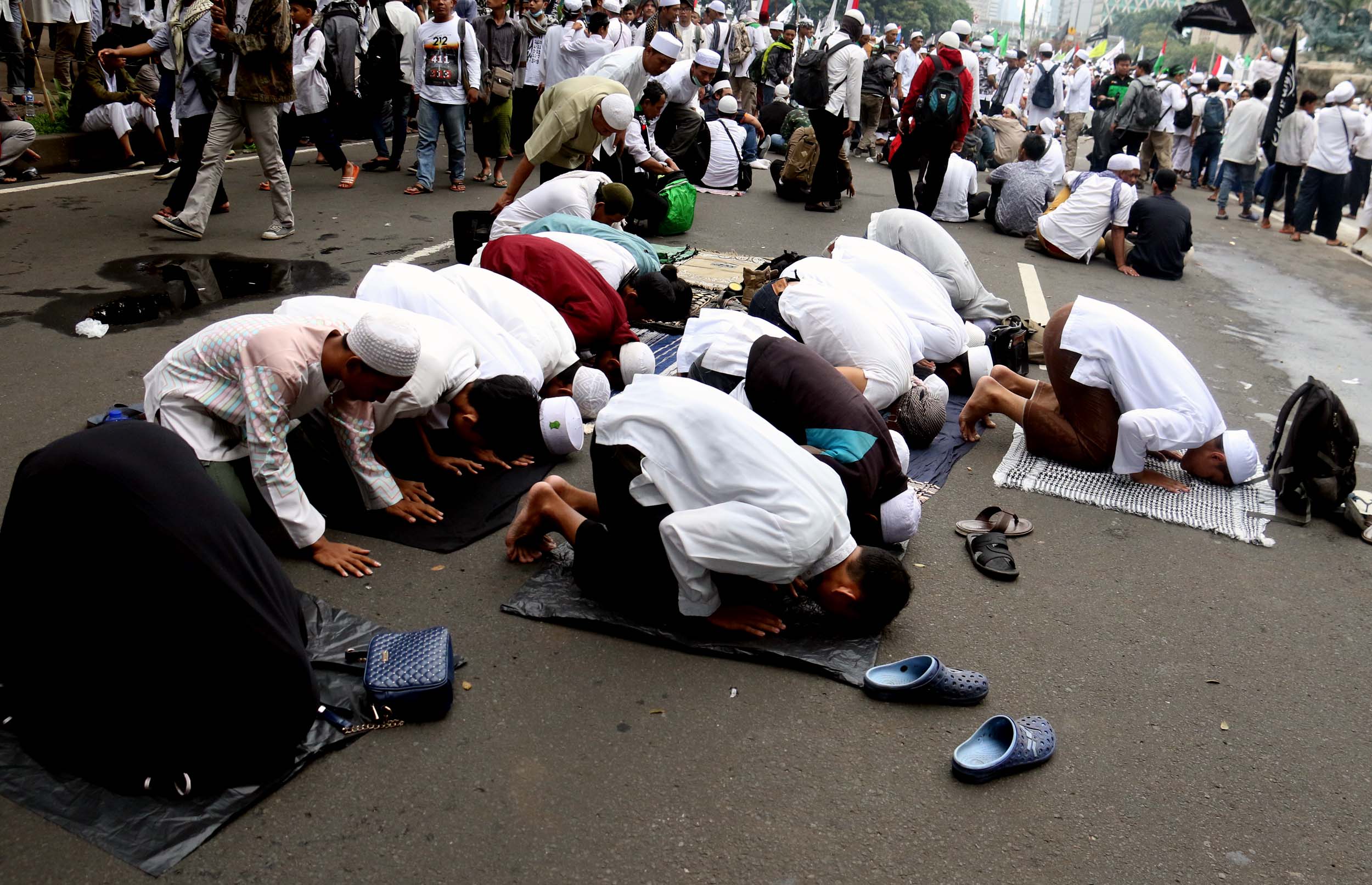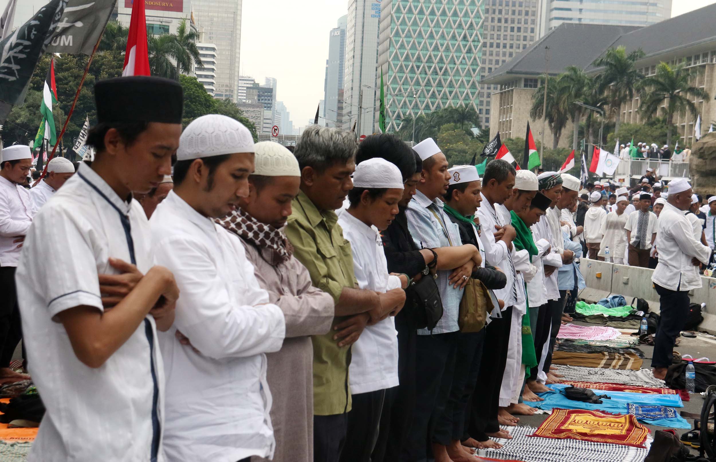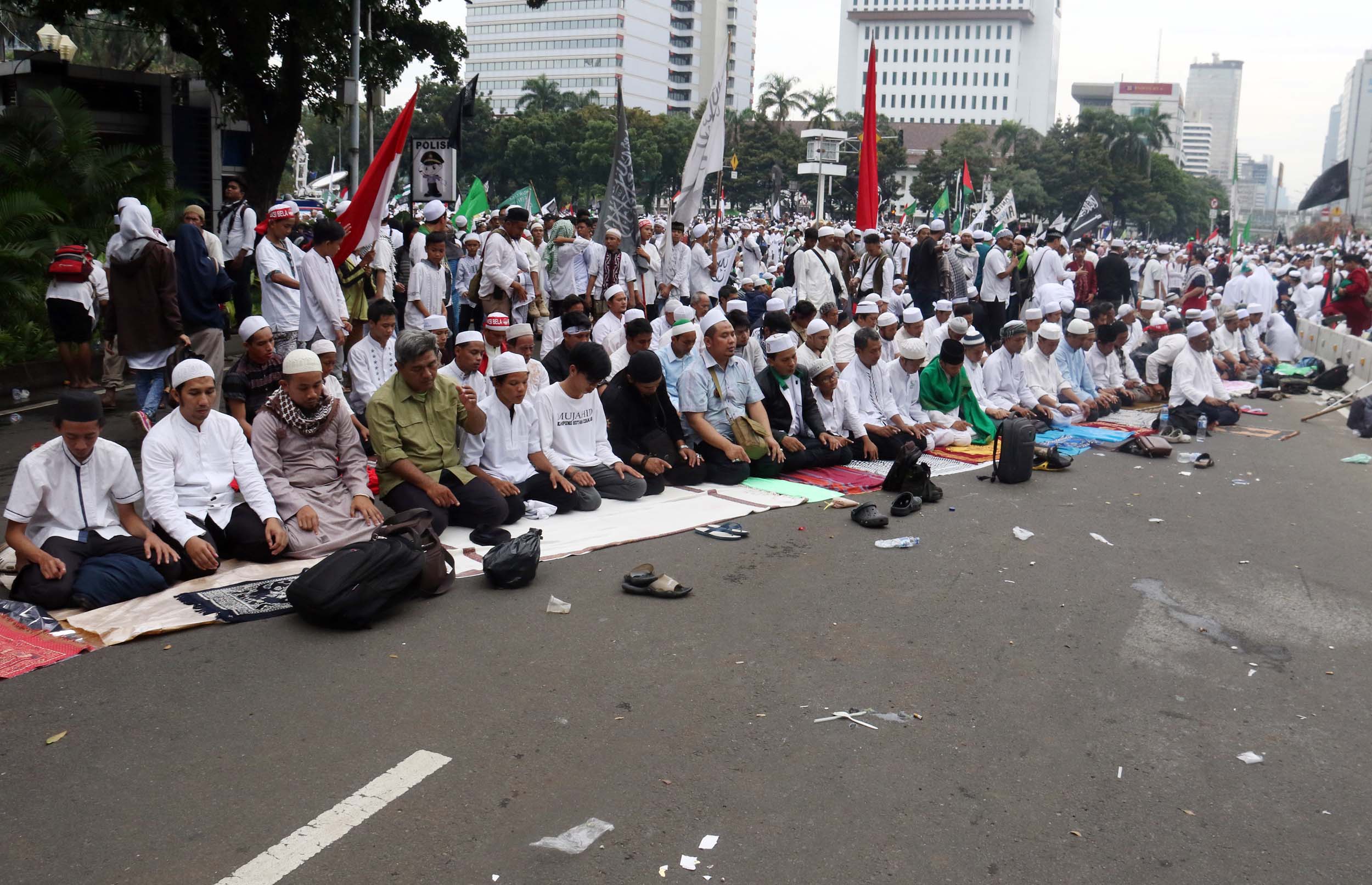 Sejumlah peserta Aksi 313 melakukan solat Ashar berjamaah di kawasan Bundaran Patung Kuda, Jakarta, Jumat (31/3/2017). Mereka mendesak pemerintah mencopot Basuki T. Purnama dari jabatan gubernur DKI Jakarta karena sudah menjadi terdakwa kasus penistaan agama. AKTUAL/Munzir