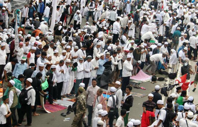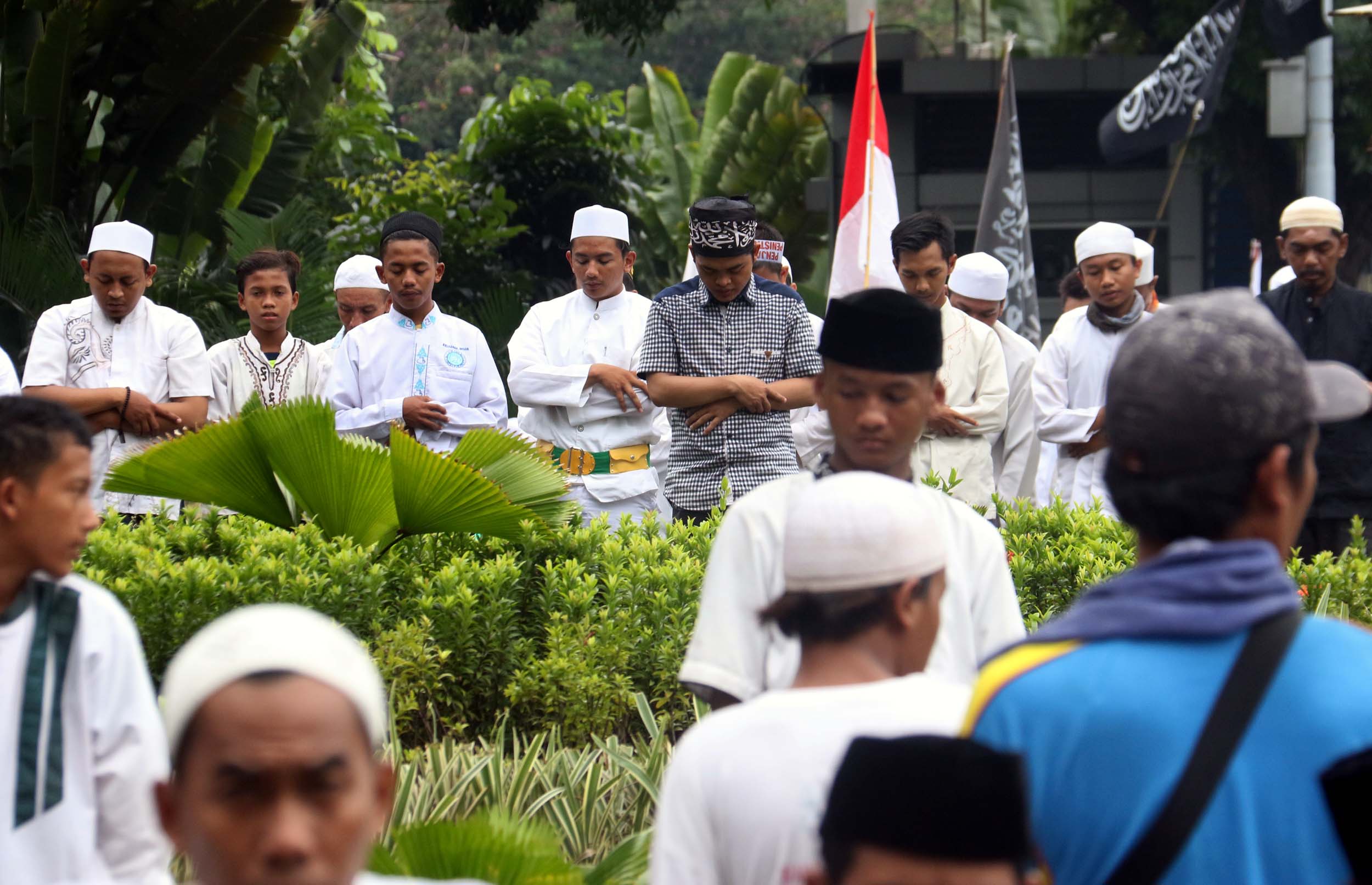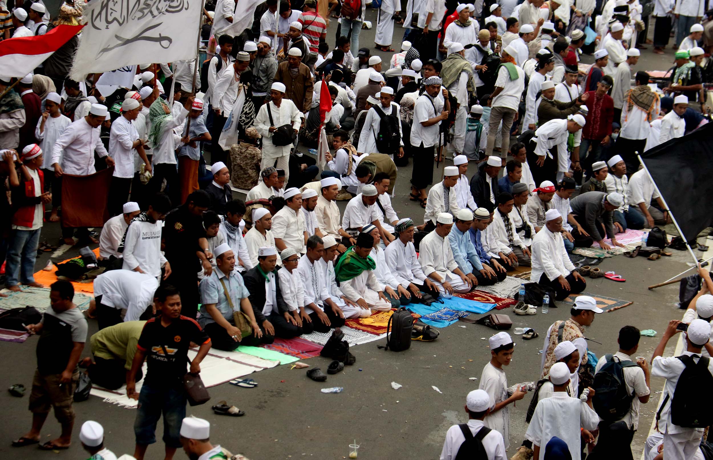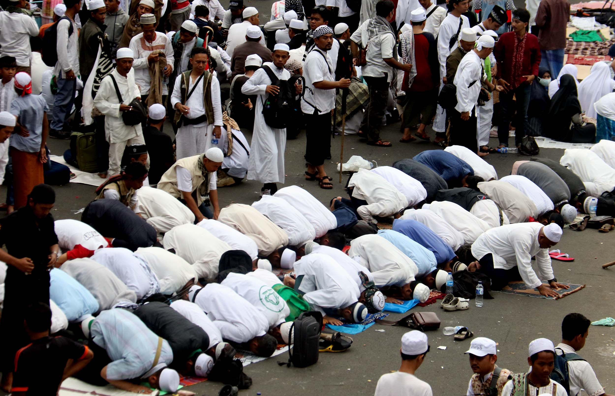 Sejumlah peserta Aksi 313 melakukan solat Ashar berjamaah di kawasan Bundaran Patung Kuda, Jakarta, Jumat (31/3/2017). Mereka mendesak pemerintah mencopot Basuki T. Purnama dari jabatan gubernur DKI Jakarta karena sudah menjadi terdakwa kasus penistaan agama. AKTUAL/Munzir