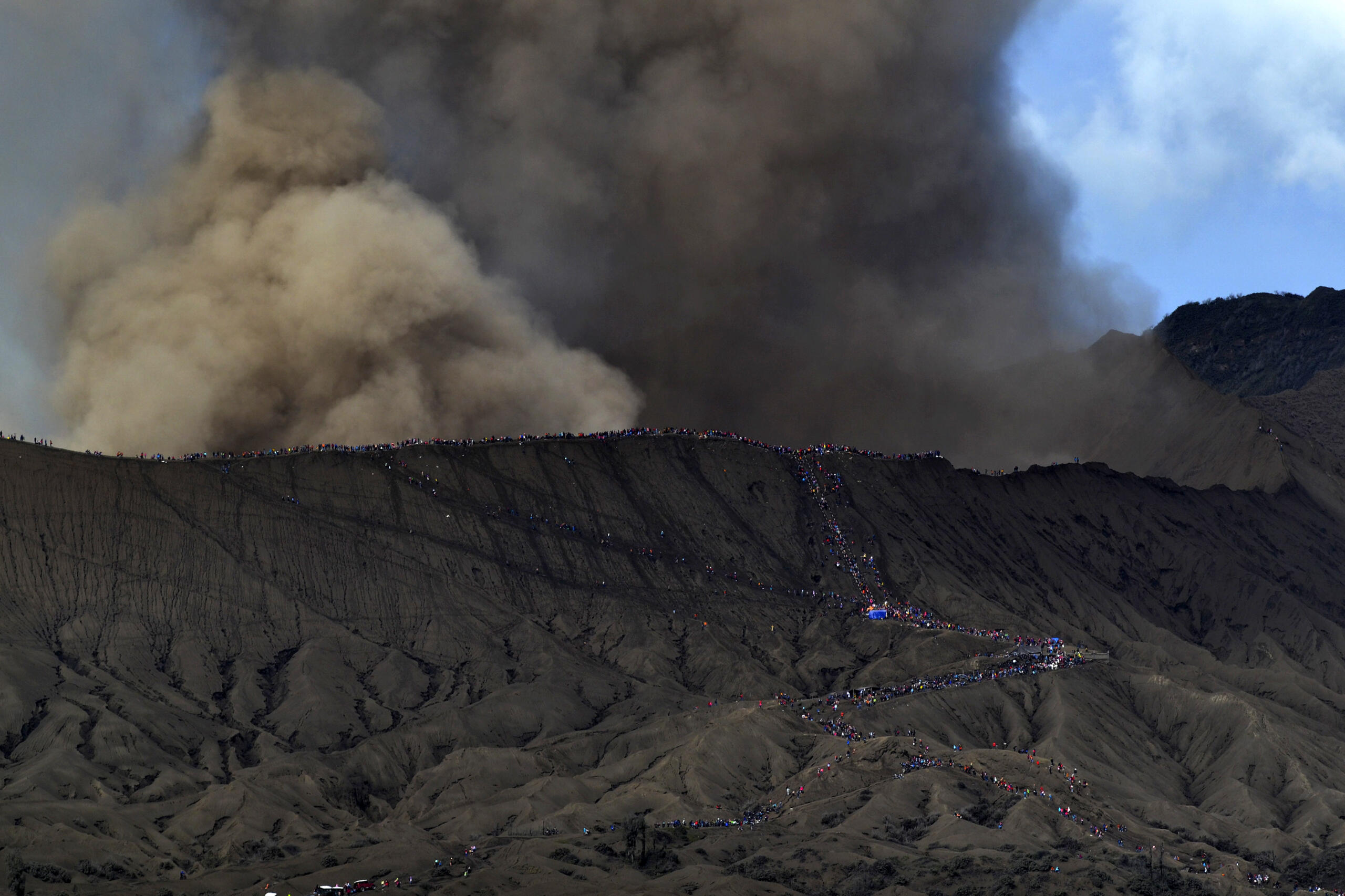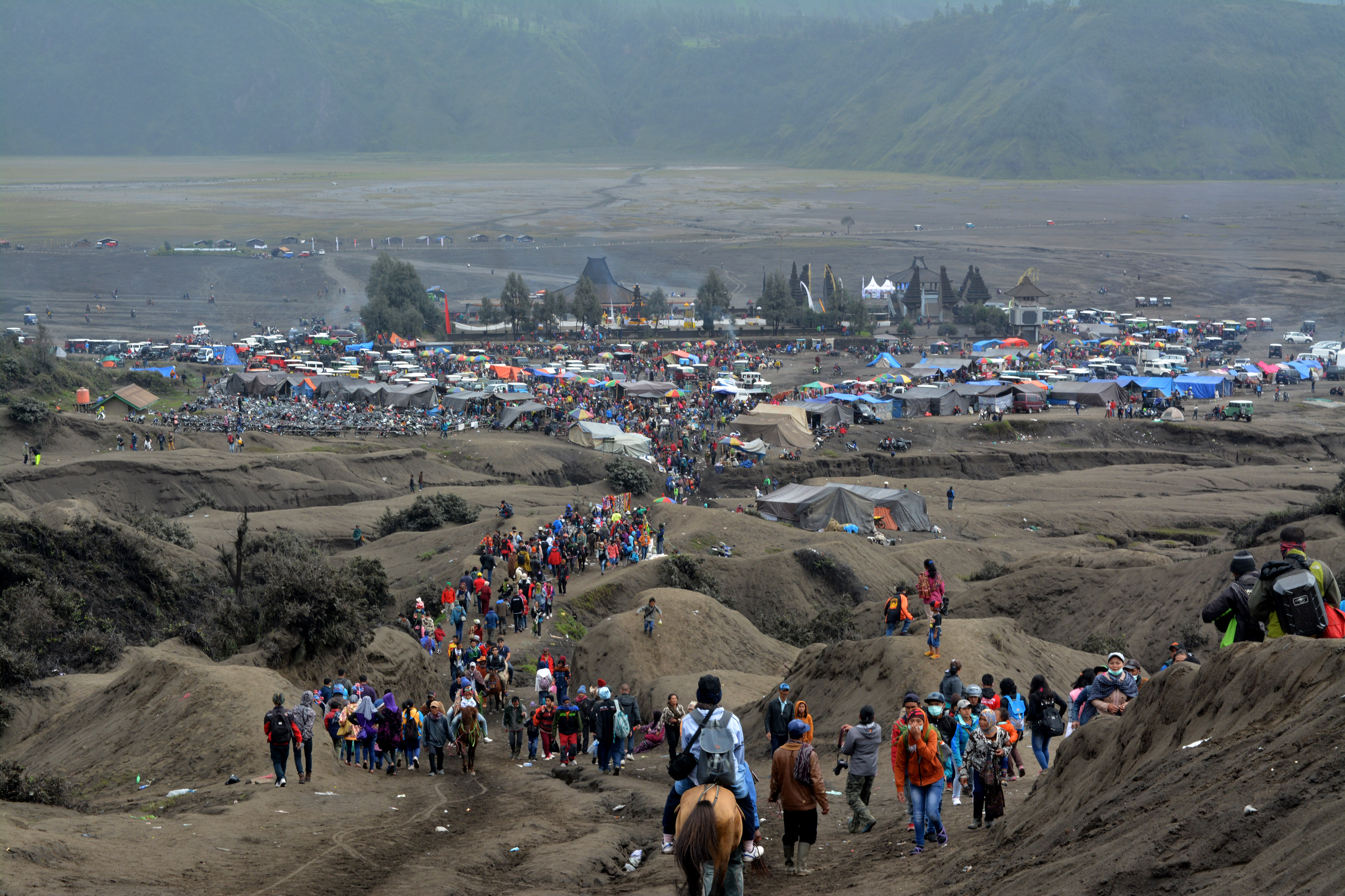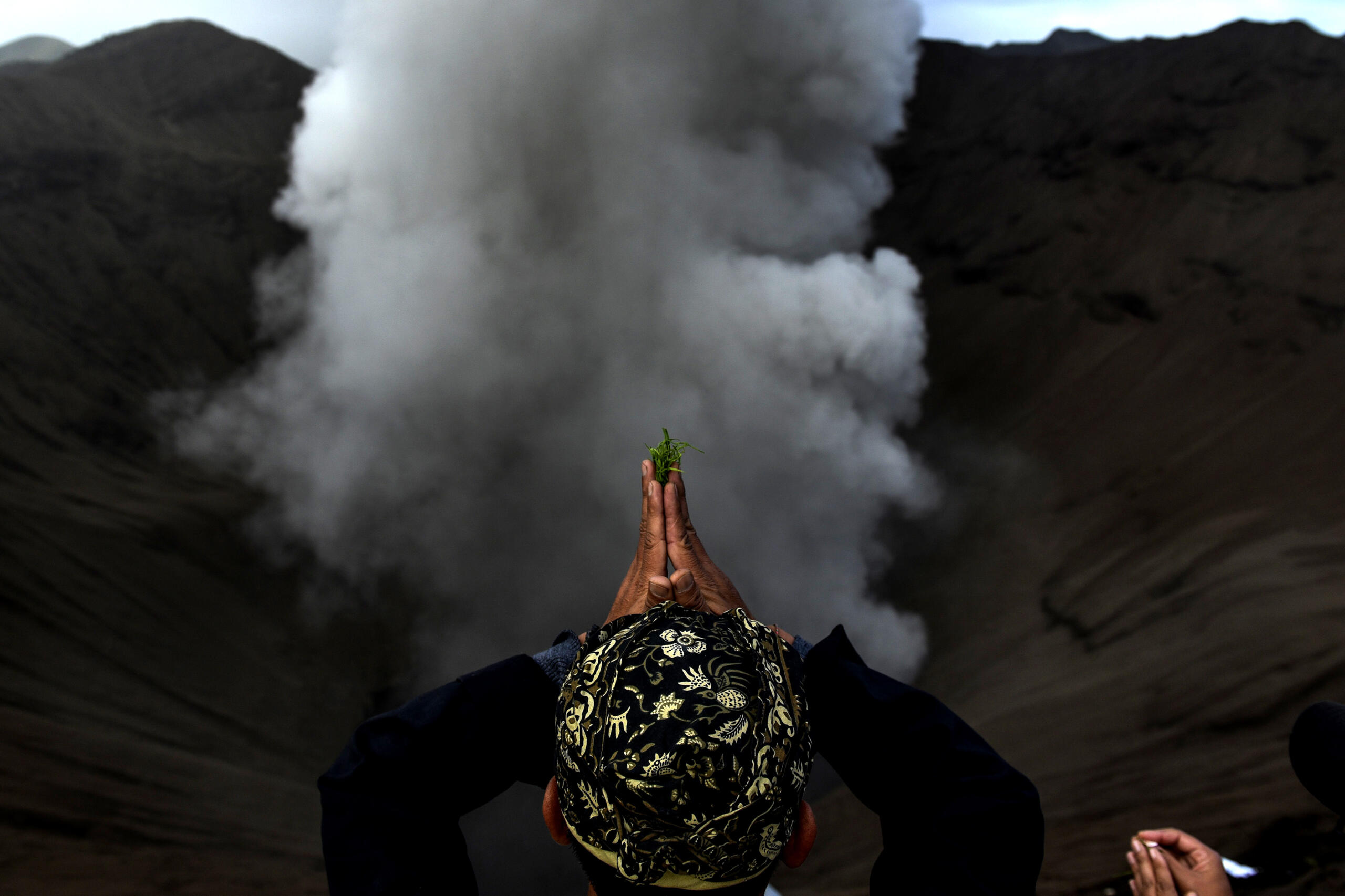 Masyarakat Suku Tengger berdoa ketika melarung sesajen ke kawah Gunung Bromo pada Upacara Yadnya Kasada, Probolinggo, Jawa Timur, Sabtu (21/7). Upacara Kasada merupakan upacara adat masyarakat Suku Tengger sebagai bentuk ucapan syukur kepada Sang Hyang Widi sekaligus meminta berkah dan menjauhkan dari malapetaka. ANTARA FOTO/Zabur Karuru/nz/16