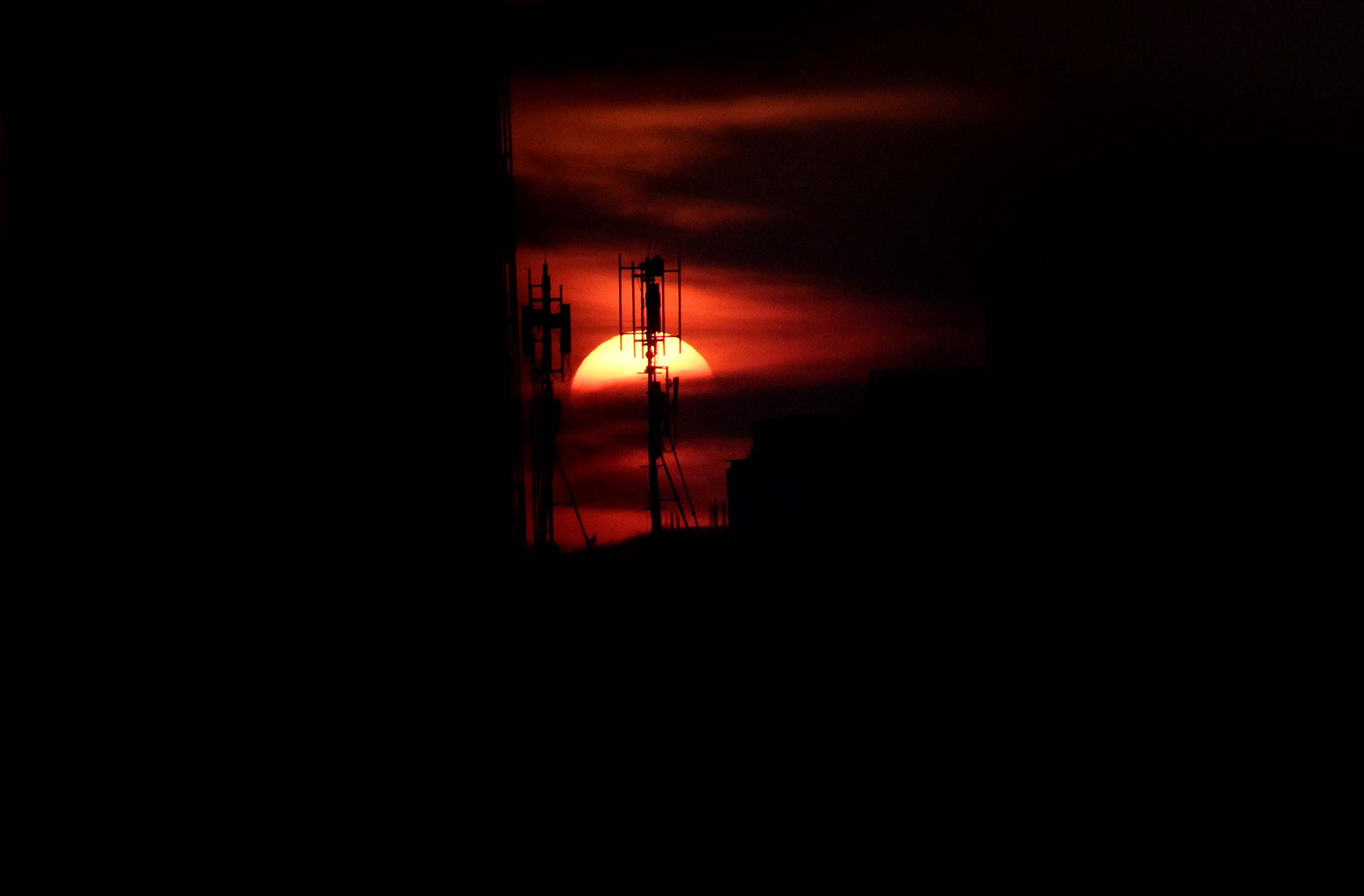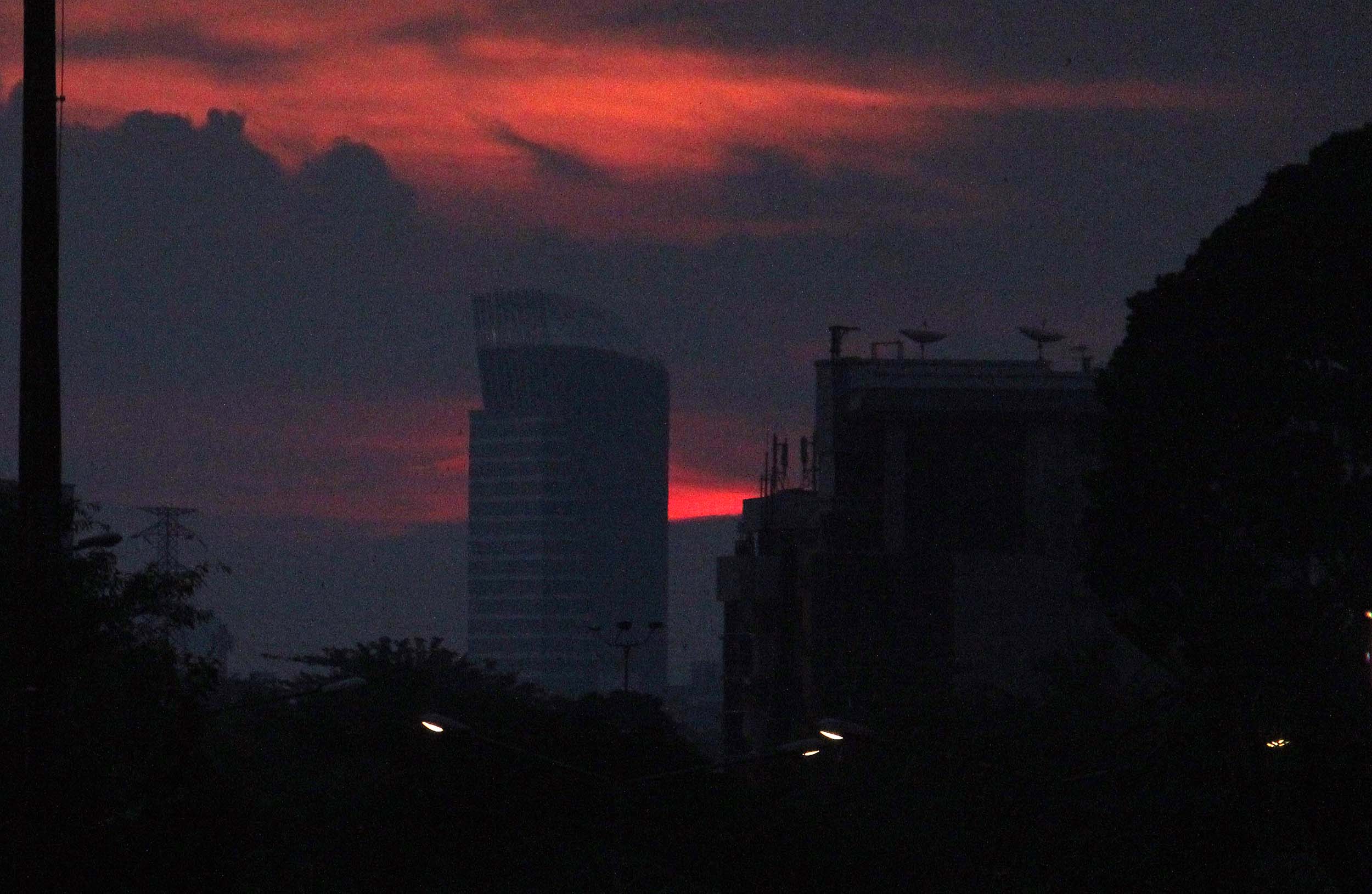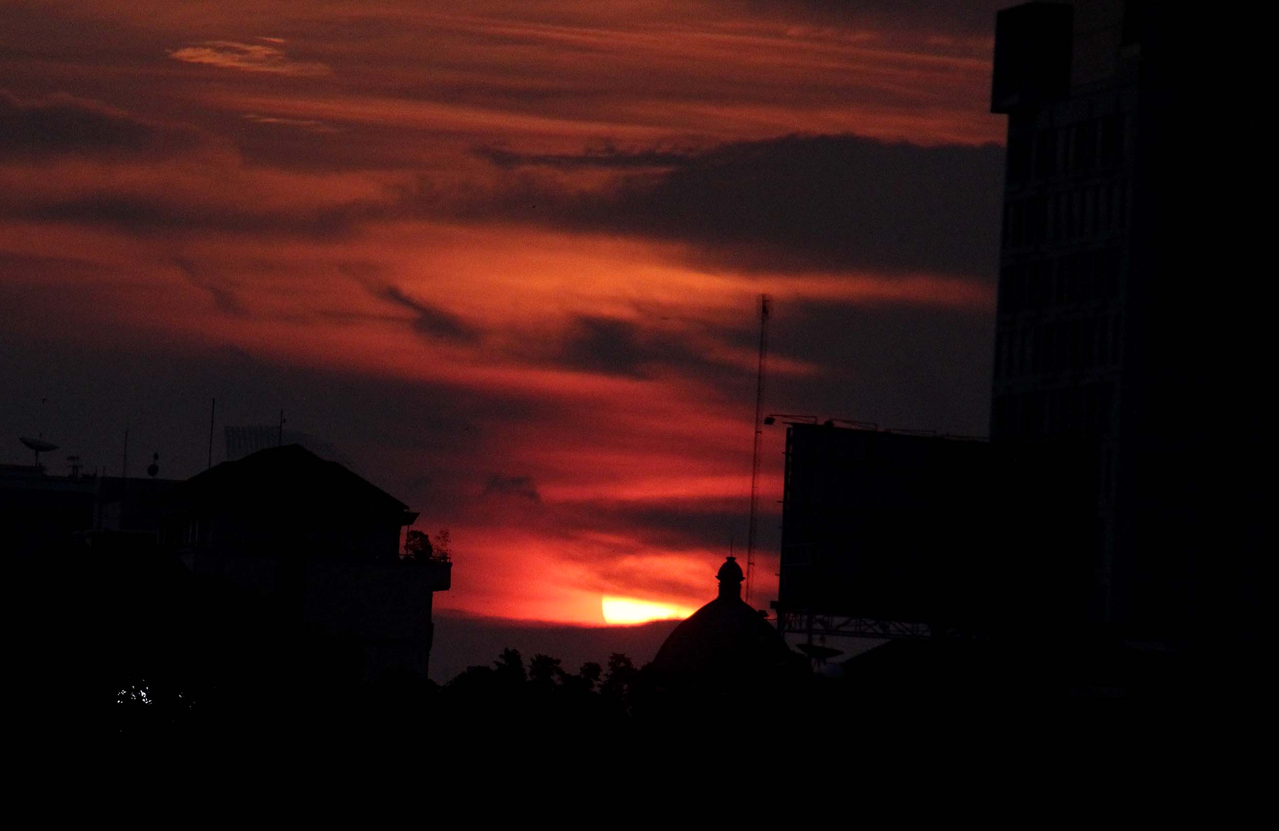 Pesona keindahan matahari terbenam terlihat jelas sore ini di jakarta. Pemandangan makin cantik dengan cahaya kemerahan melatari gedung bertingkat ibukota.
