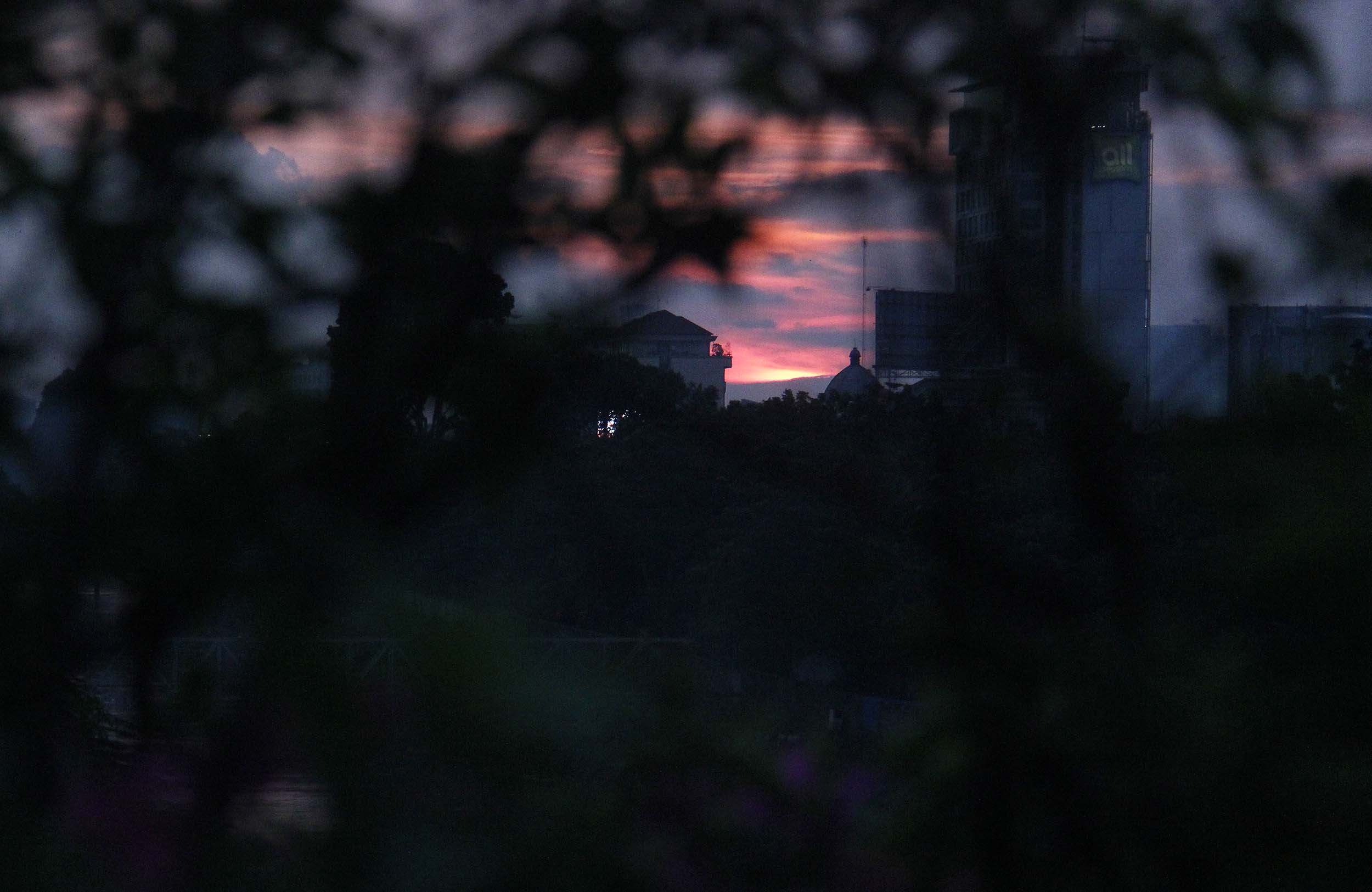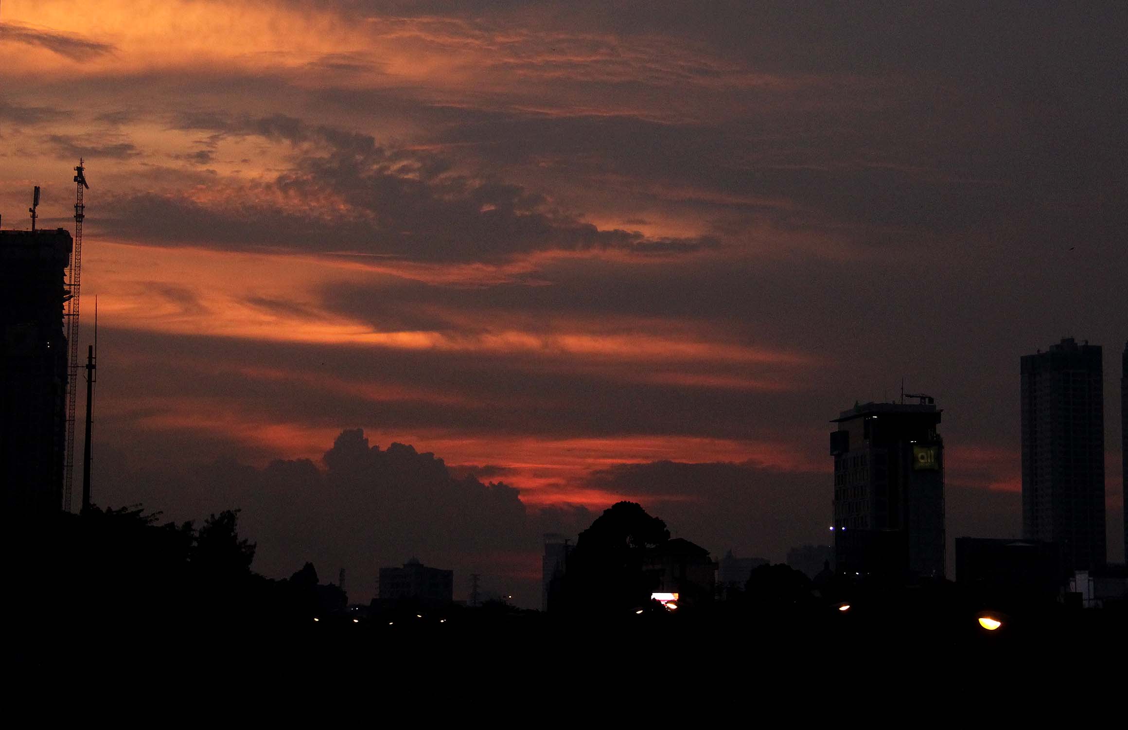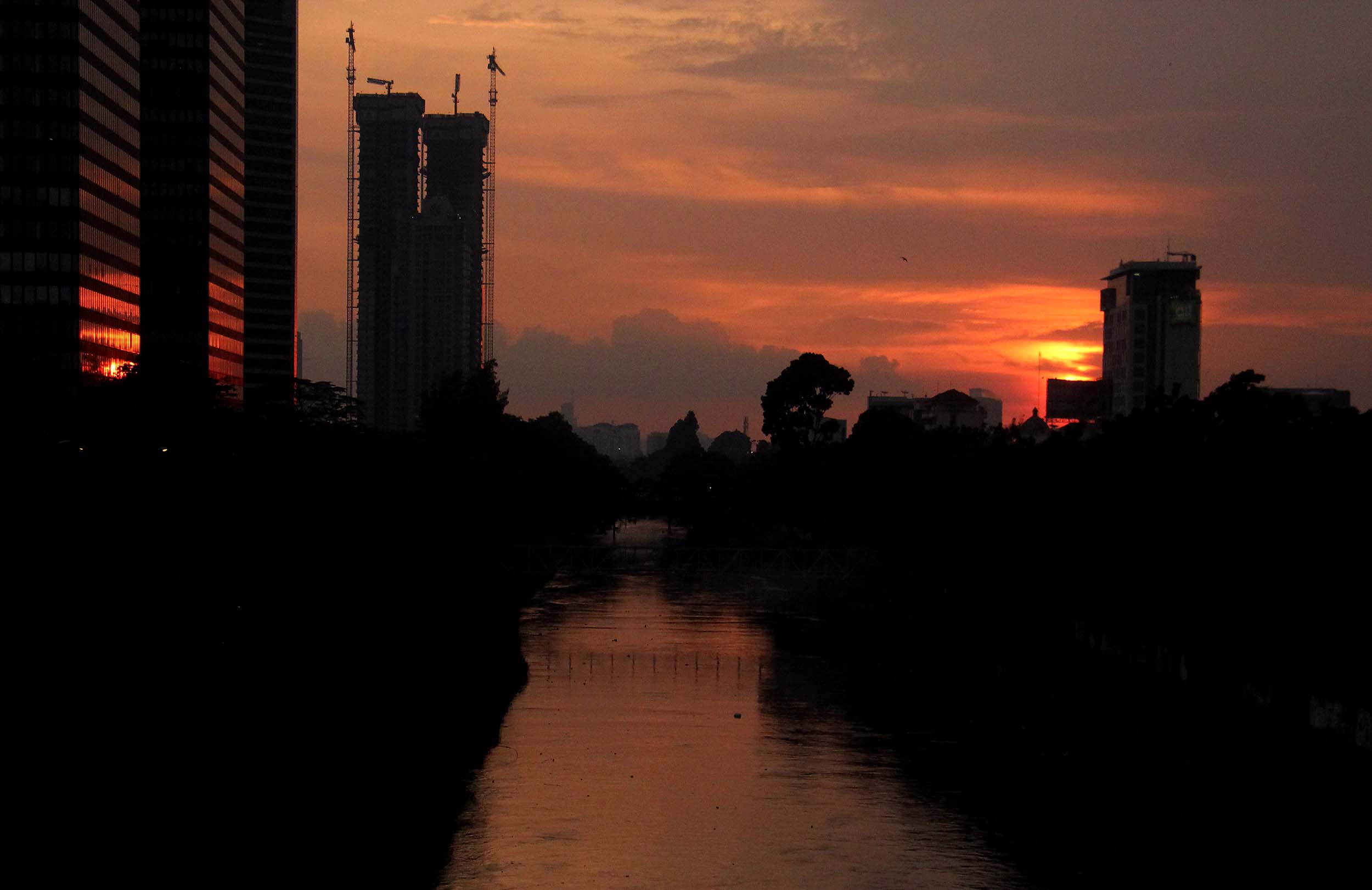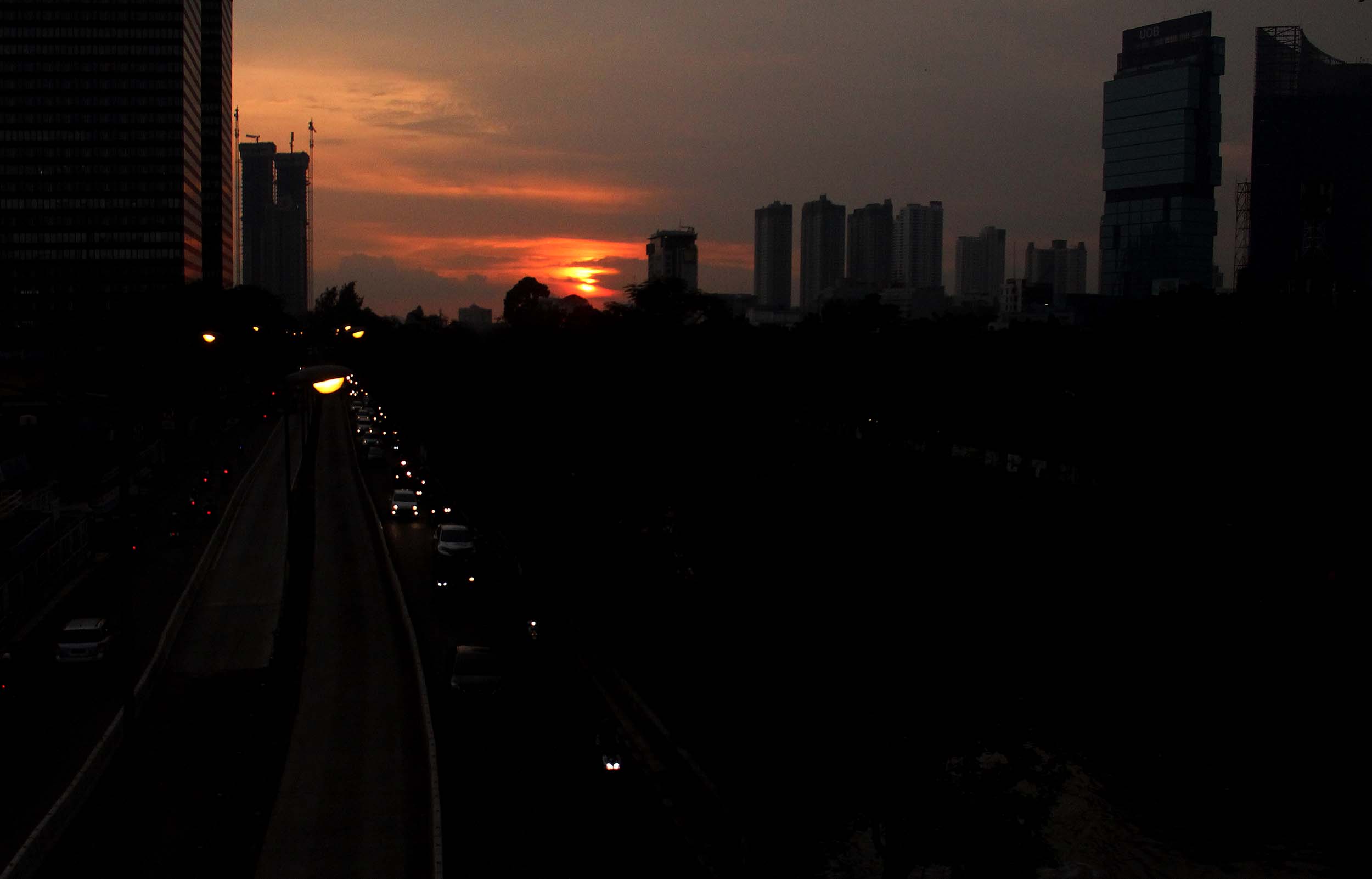 Suasana indahnya matahari tenggelam diantara gedung-gedung pencakar langit menghiasi langit Jakarta seperti yang terlihat di kawasan Jalan HR Rasuna Said, Jakarta Selatan, Selasa (12/7/2016). Matahari tenggelam jarang sekali terlihat di langit kota Jakarta yang setiap harinya selalu diselimuti oleh langit yang pekat dari asap polusi.