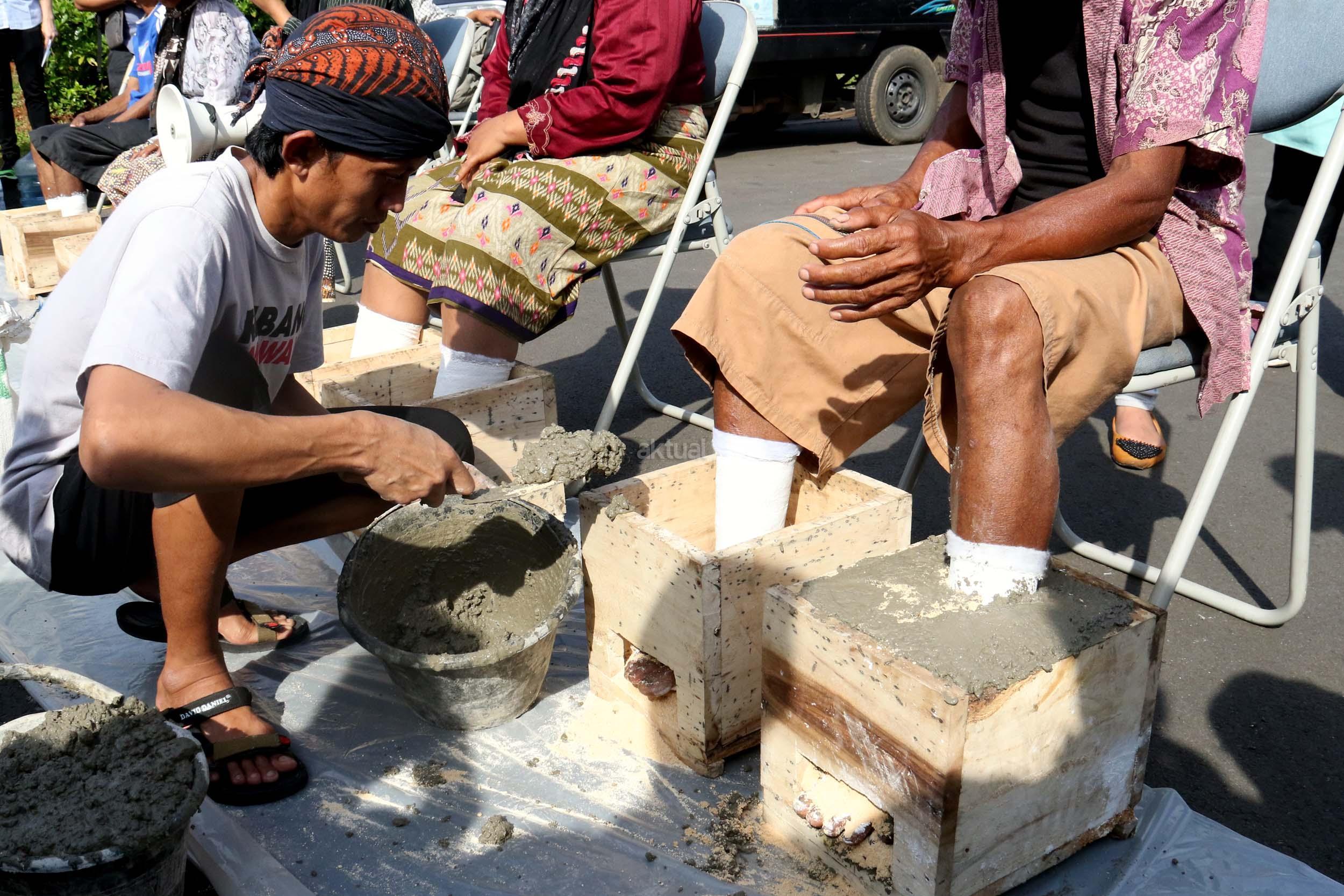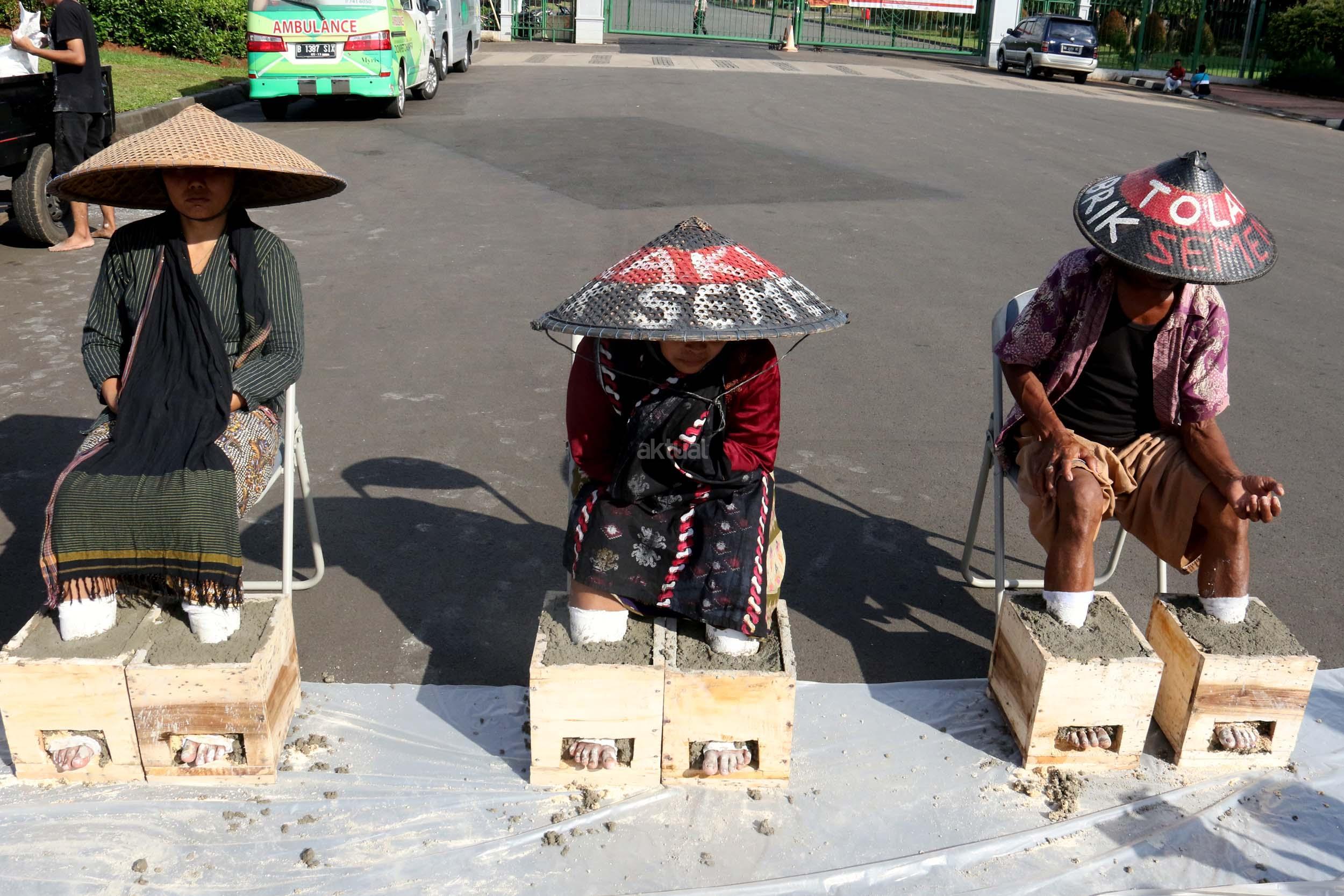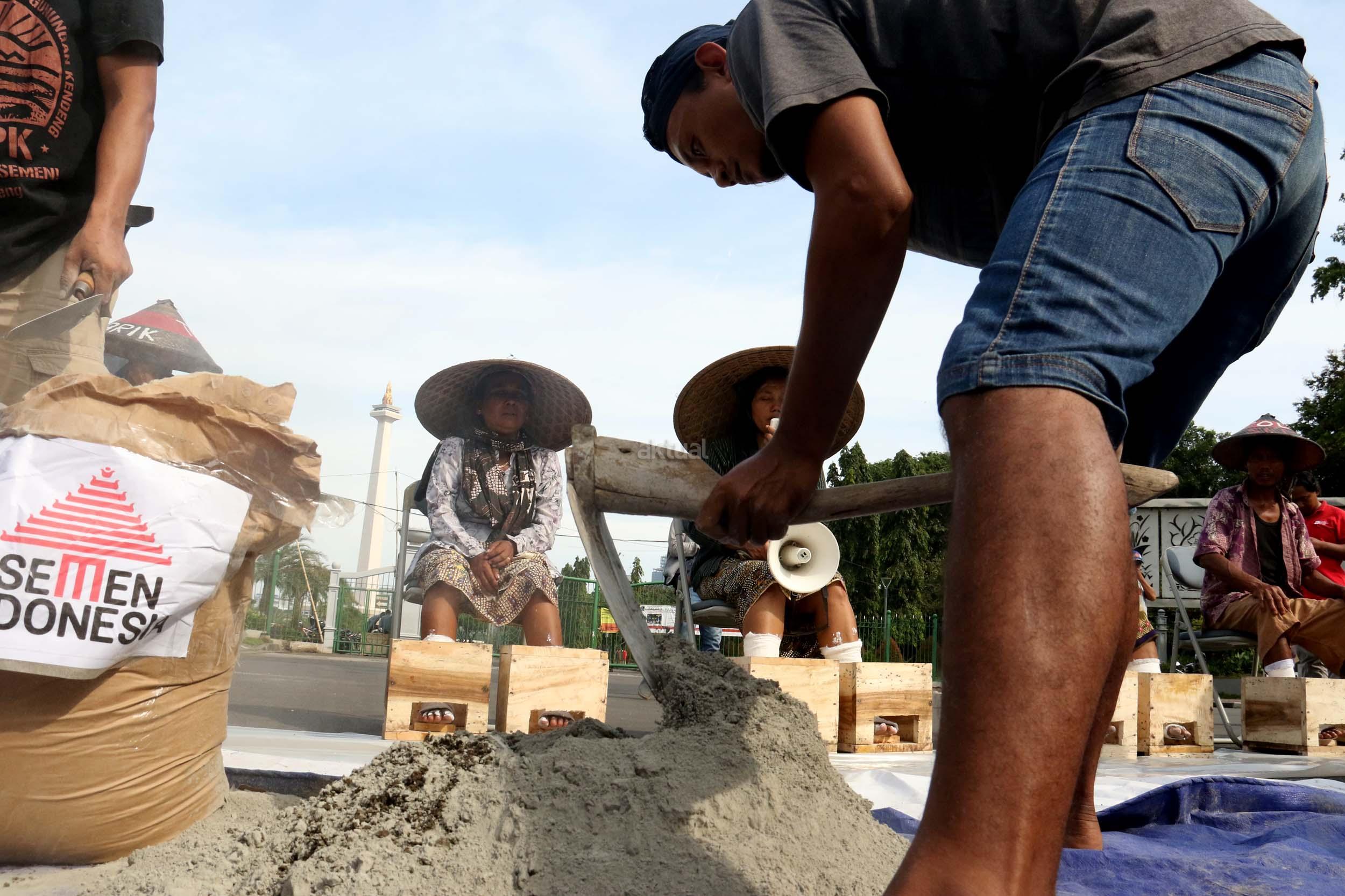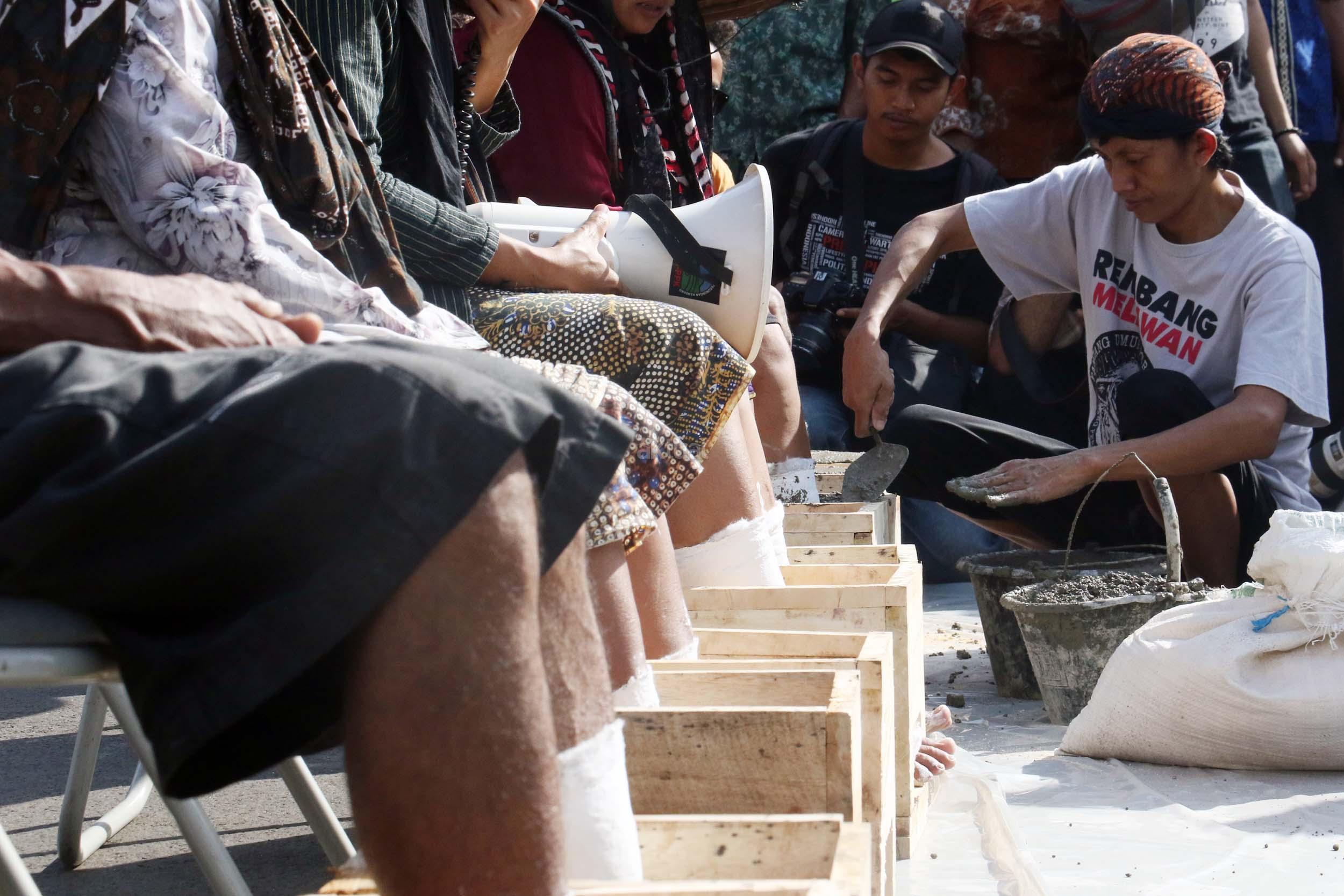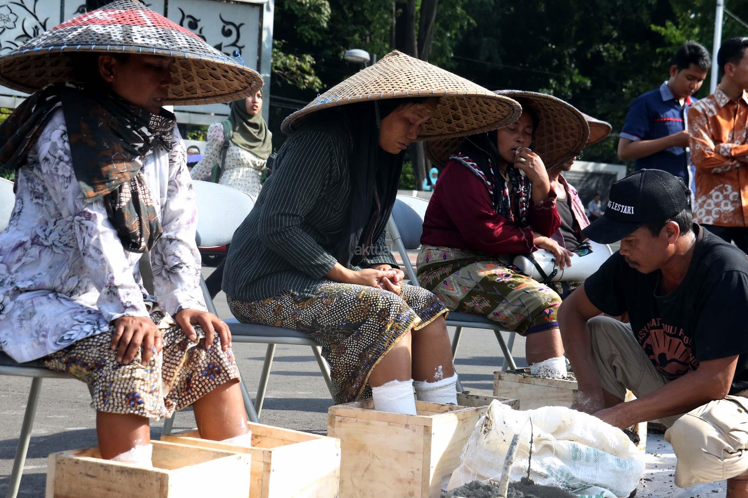 Sejumlah Petani Kendeng menyemen kakinya sebagai bentuk penolakan terhadap Keputusan Gubernur Jawa Tengah Nomor 660.1/6 Tahun 2017, Jakarta, Senin (13/3/2017). Dalam aksinya para petani Kendeng menolak Izin Lingkungan Kegiatan Penambangan dan Pembangunan Pabrik Semen PT Semen Indonesia di Kabupaten Rembang. AKTUAL/Munzir