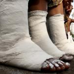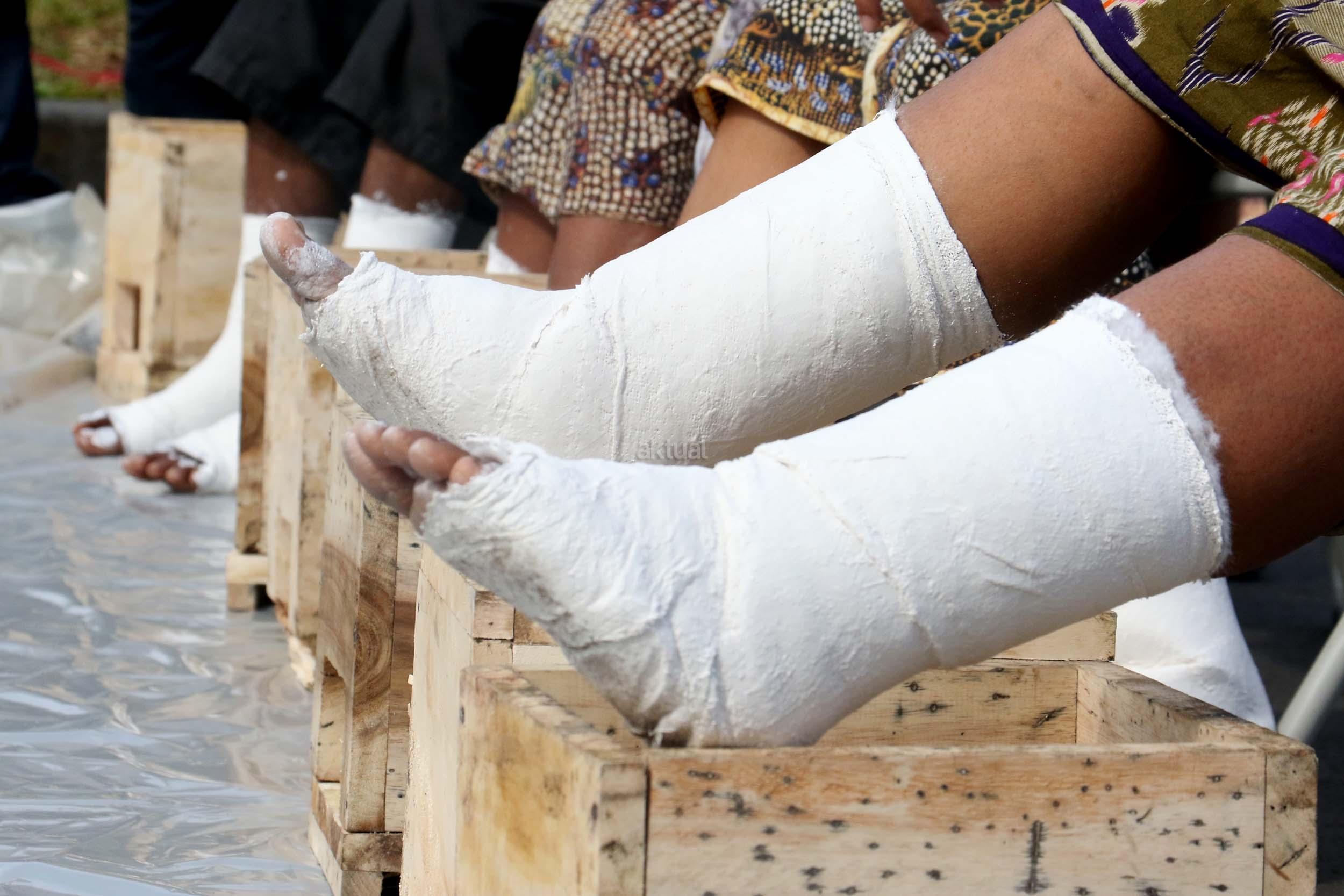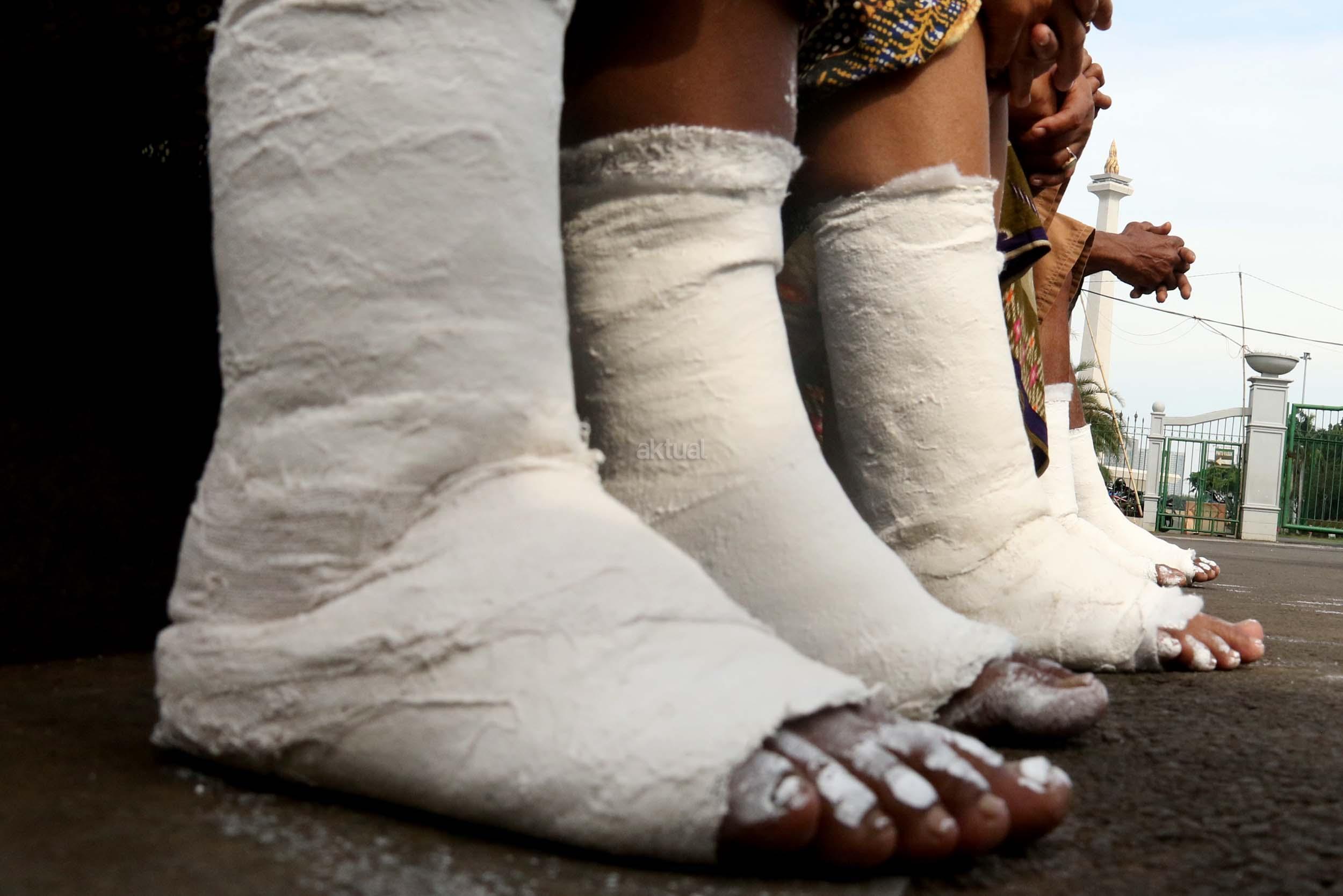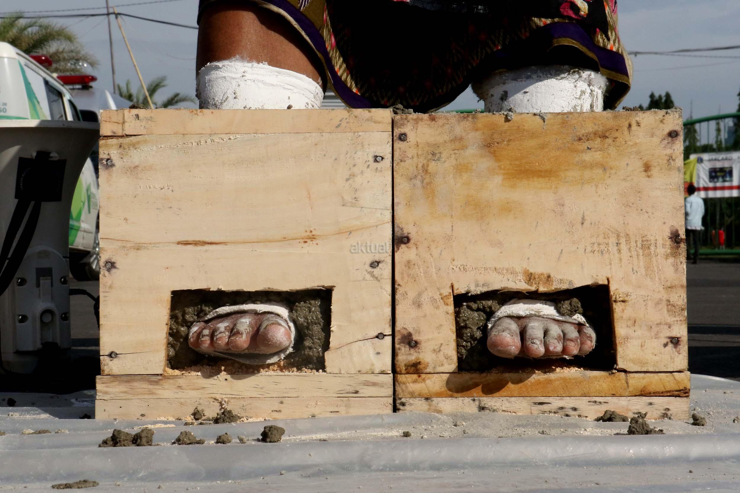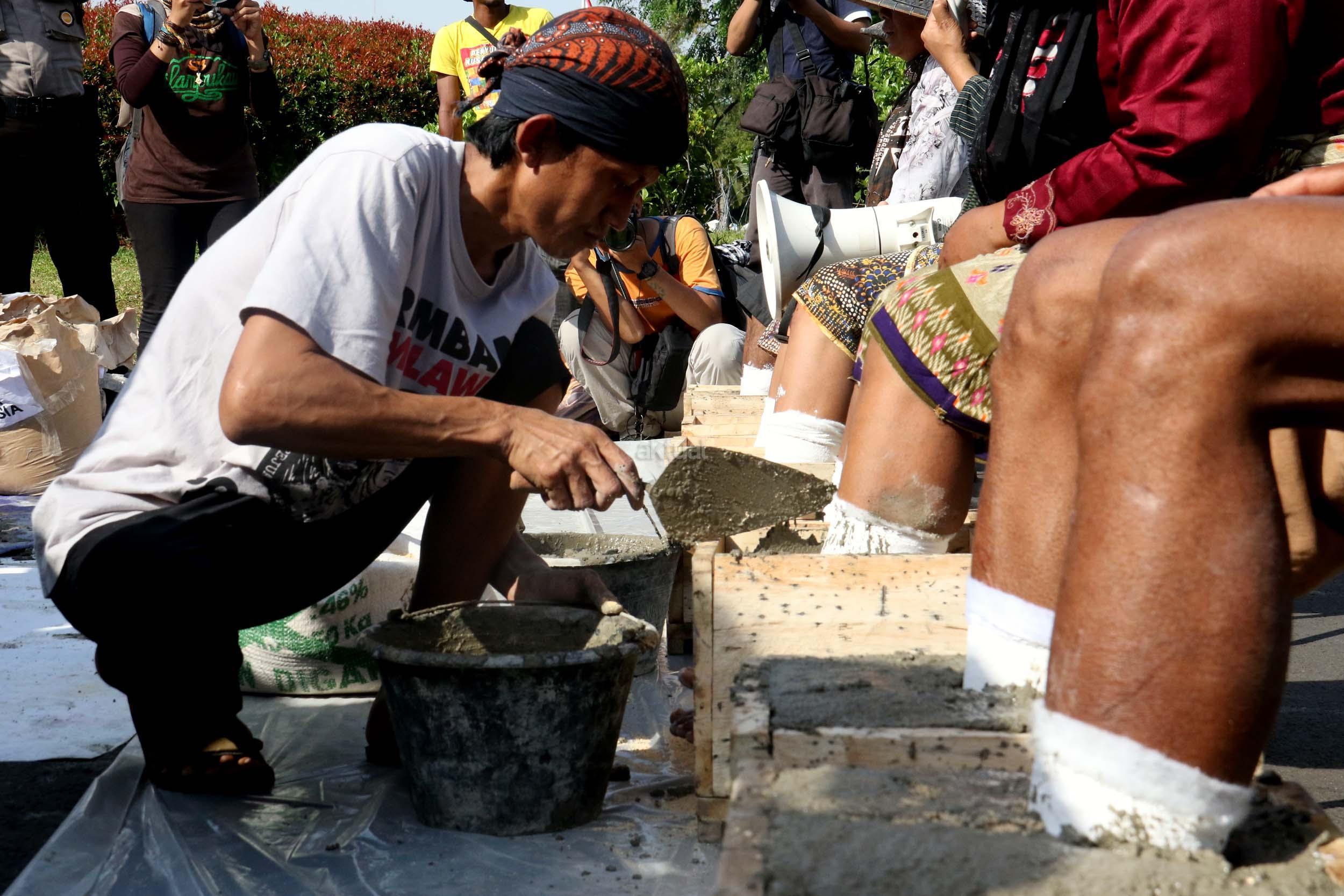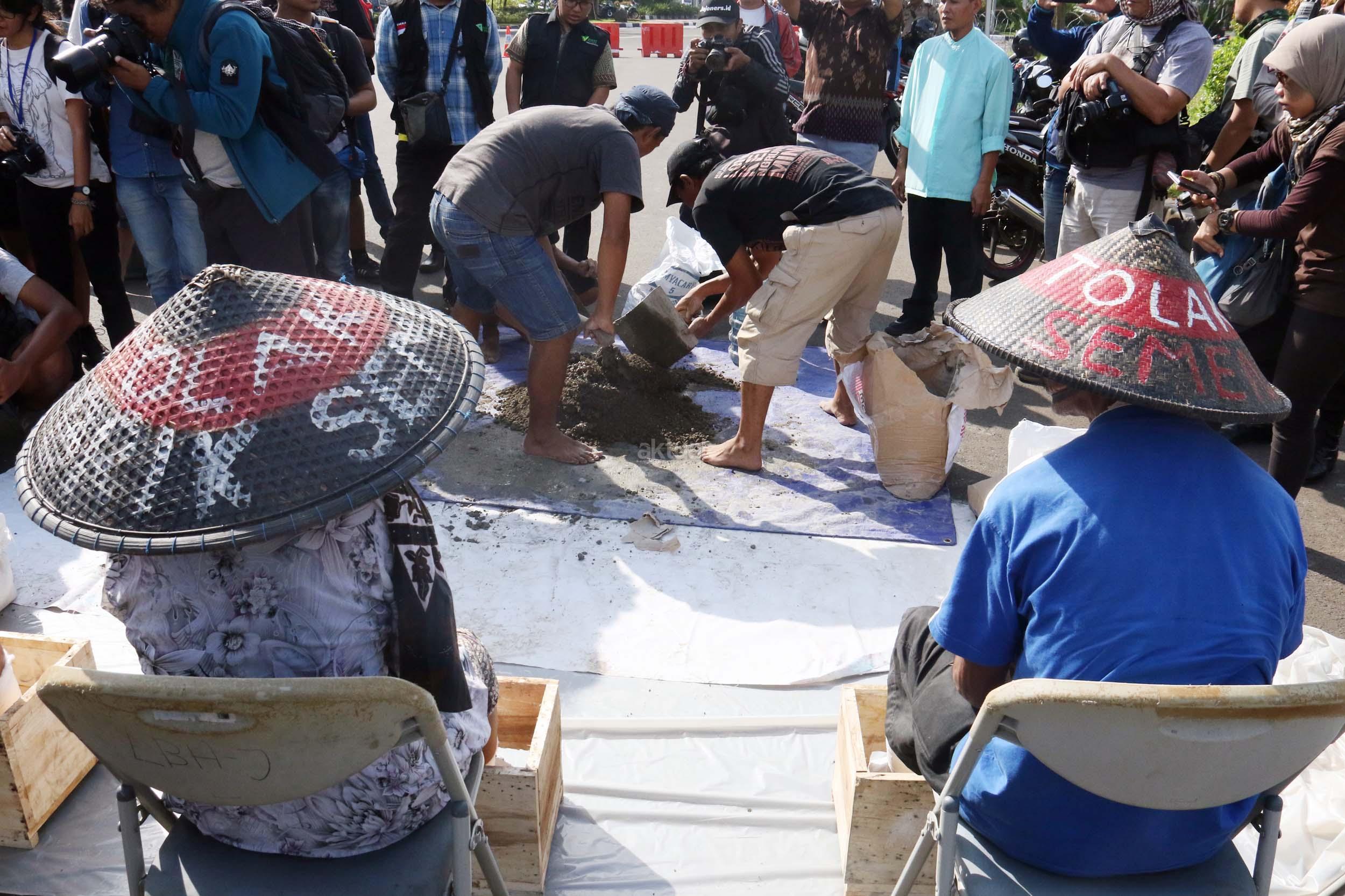 Sejumlah Petani Kendeng menyemen kakinya sebagai bentuk penolakan terhadap Keputusan Gubernur Jawa Tengah Nomor 660.1/6 Tahun 2017, Jakarta, Senin (13/3/2017). Dalam aksinya para petani Kendeng menolak Izin Lingkungan Kegiatan Penambangan dan Pembangunan Pabrik Semen PT Semen Indonesia di Kabupaten Rembang. AKTUAL/Munzir