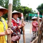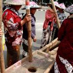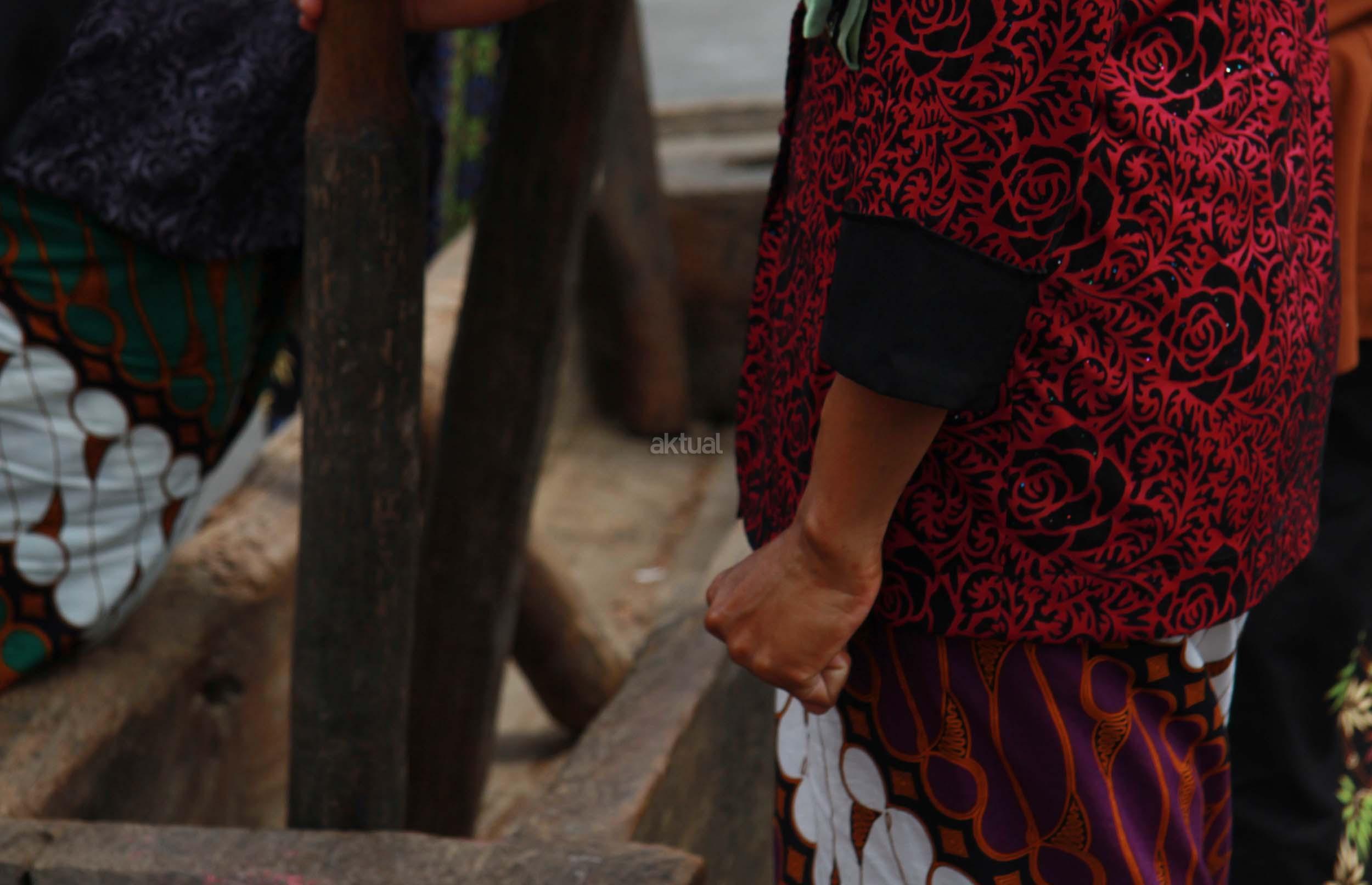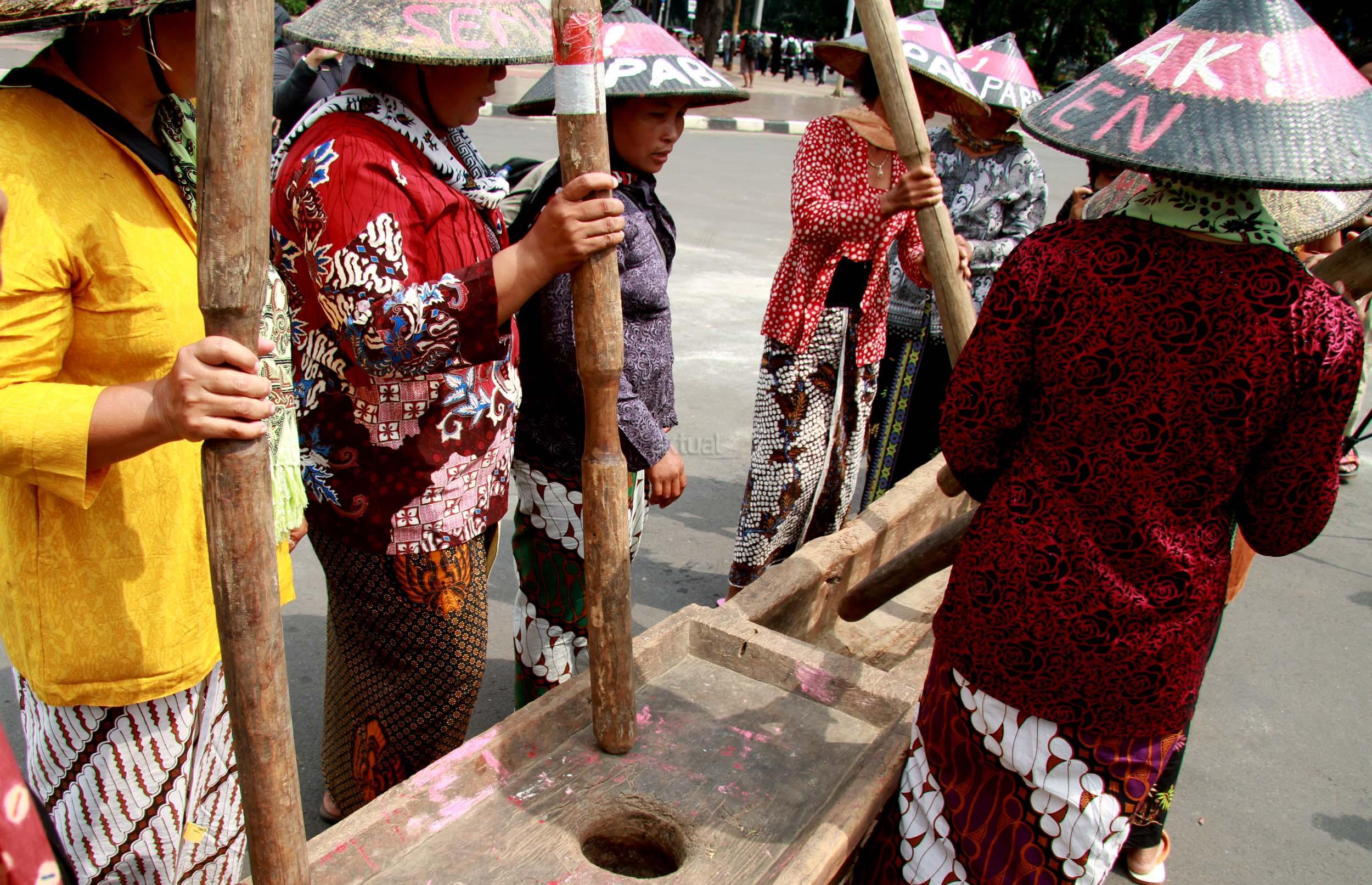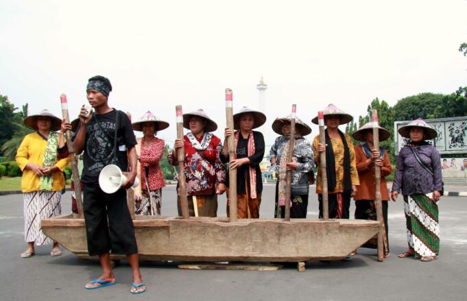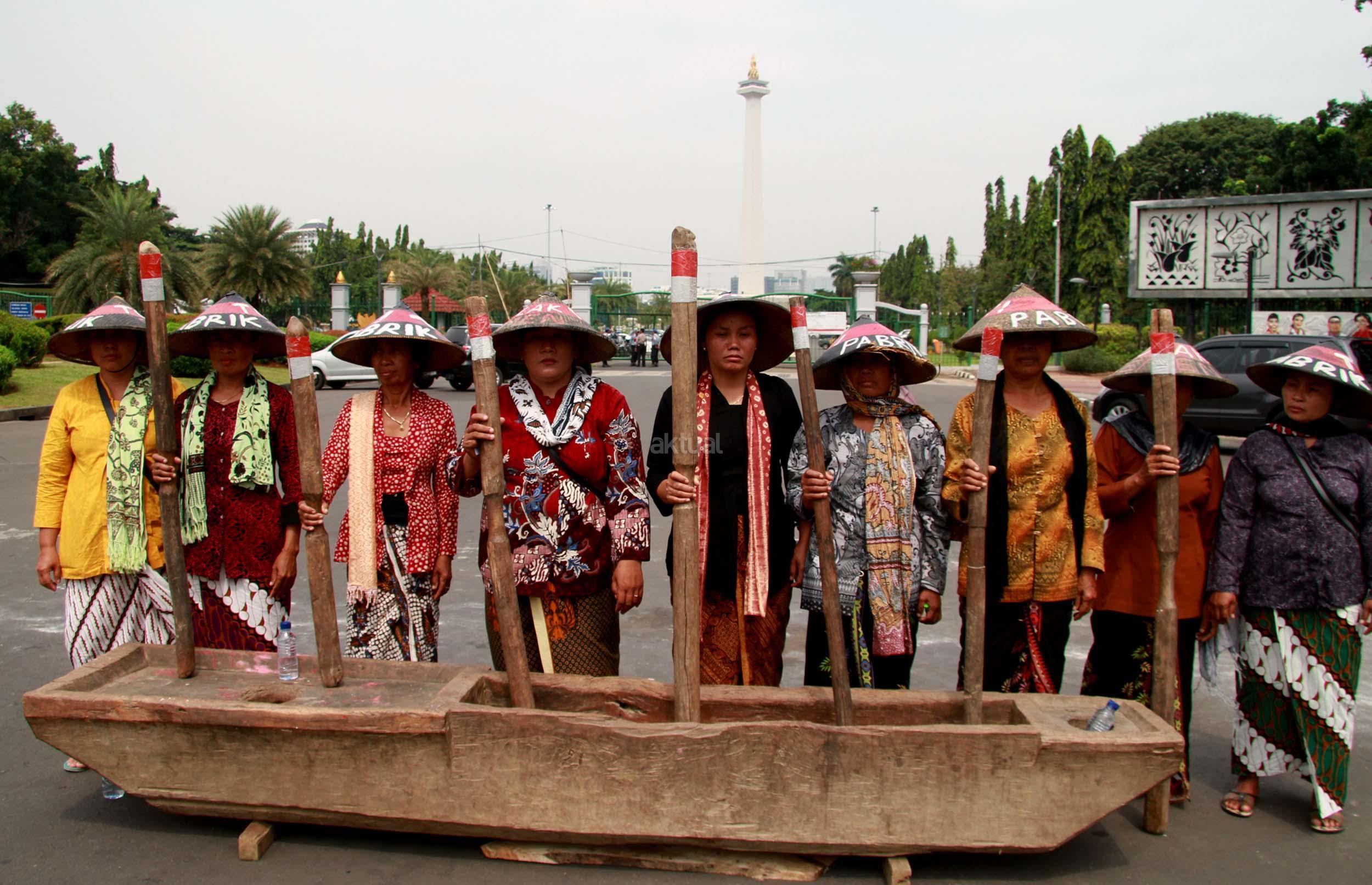 Sejumlah petani Pegunungan Kendeng menabuh lesung saat menggelar aksi di depan Istana Merdeka, Jakarta, Rabu (12/4/2017). Dalam aksi tersebut mereka meminta kepada semua pihak diantaranya investor dan Pemda Jawa Tengah untuk menghentikan Pembangunan dan Pertambangan Pabrik PT.Semen Indonesia di Pegunungan Kendeng. AKTUAL/Munzir