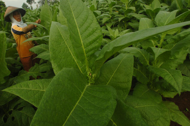 Petani memelihara daun tembakau di perkebunan tembakau Kampung Cimuncang, Kabupaten Garut, Jawa Barat, Jumat (27/5). Harga tembakau basah ditingkat petani saat ini mencapai Rp 3.500 per kilogram sedangkan harga tembakau kering mencapai Rp 80.000 per kilogram. ANTARA FOTO/Adeng Bustomi/Spt/16