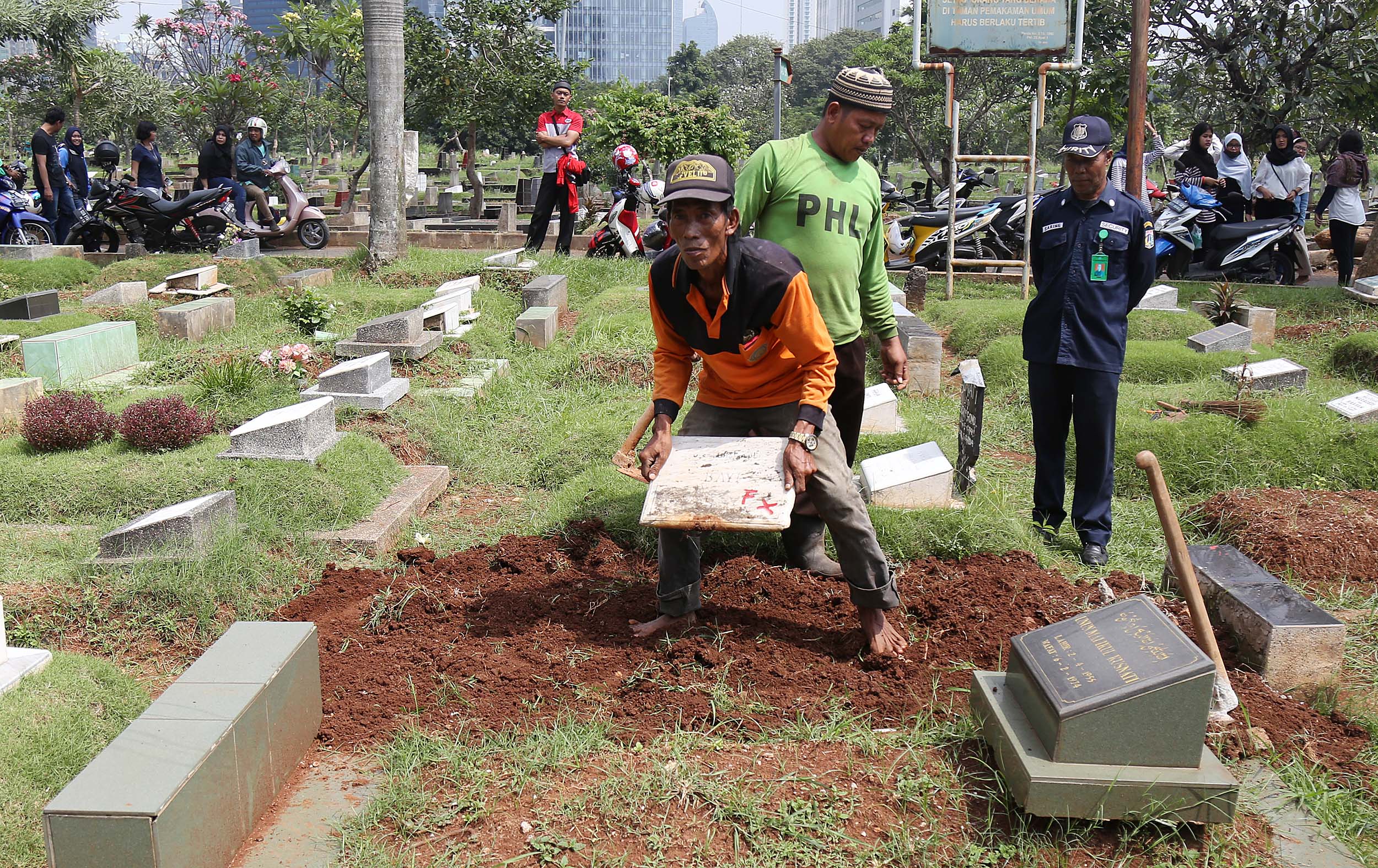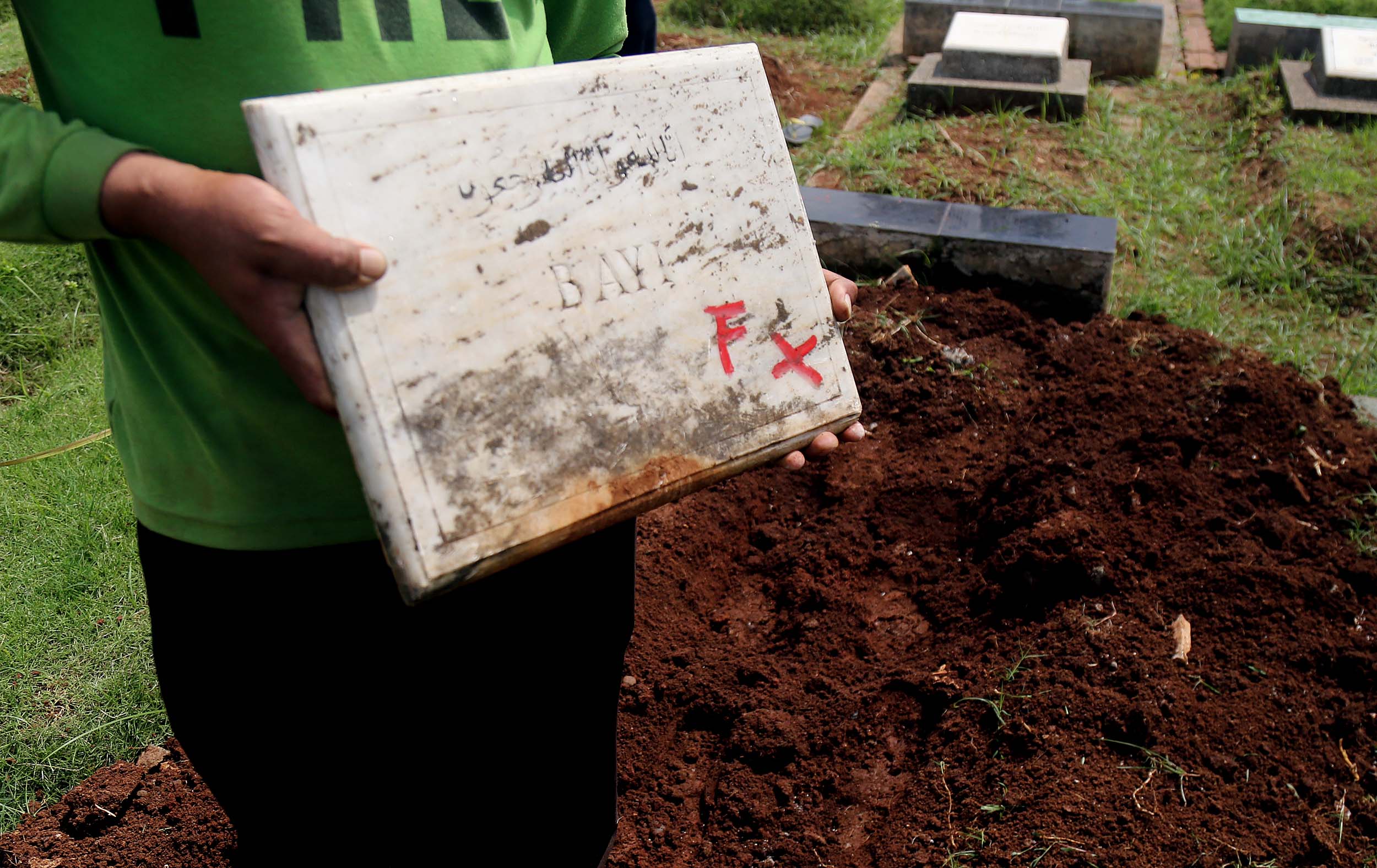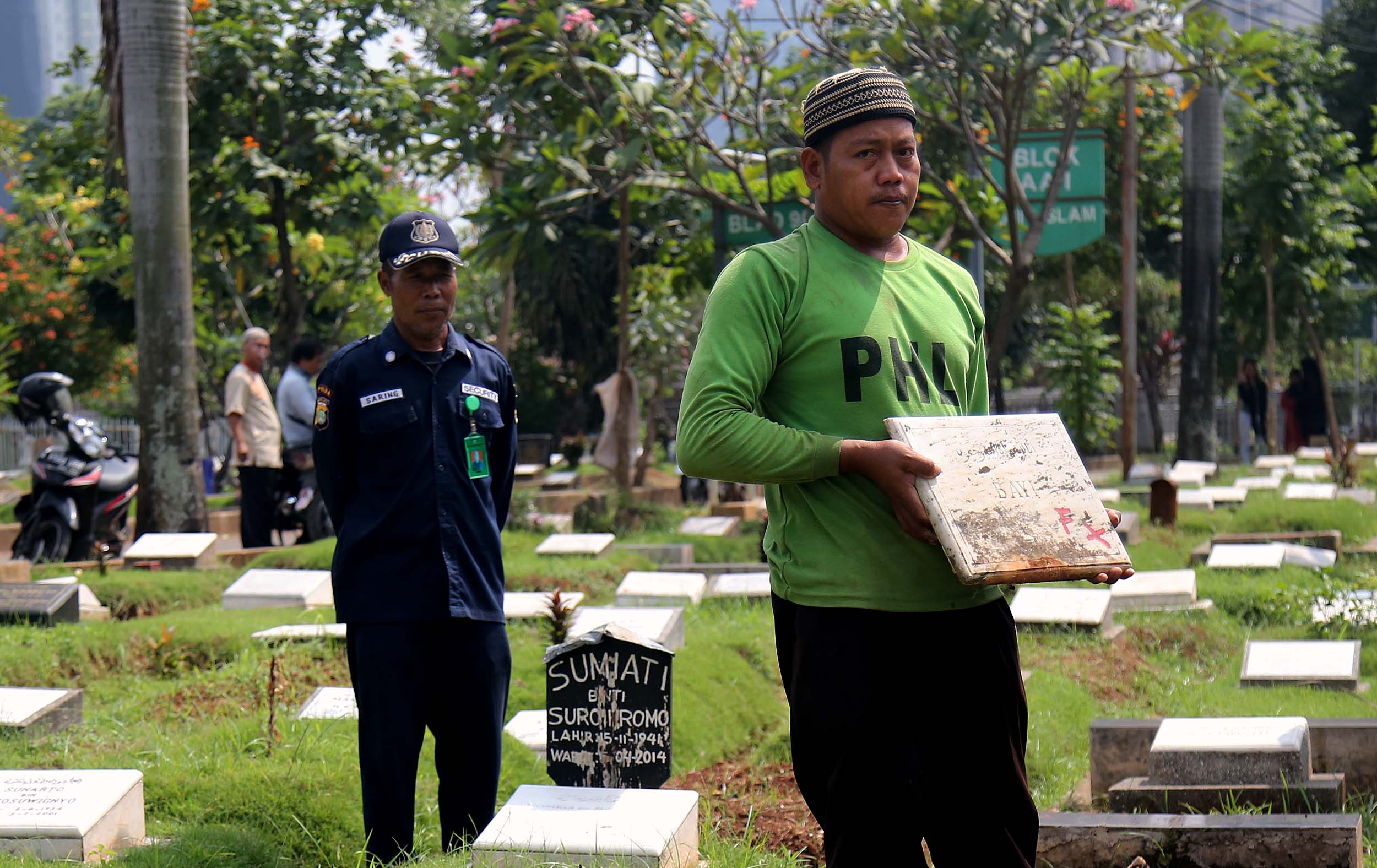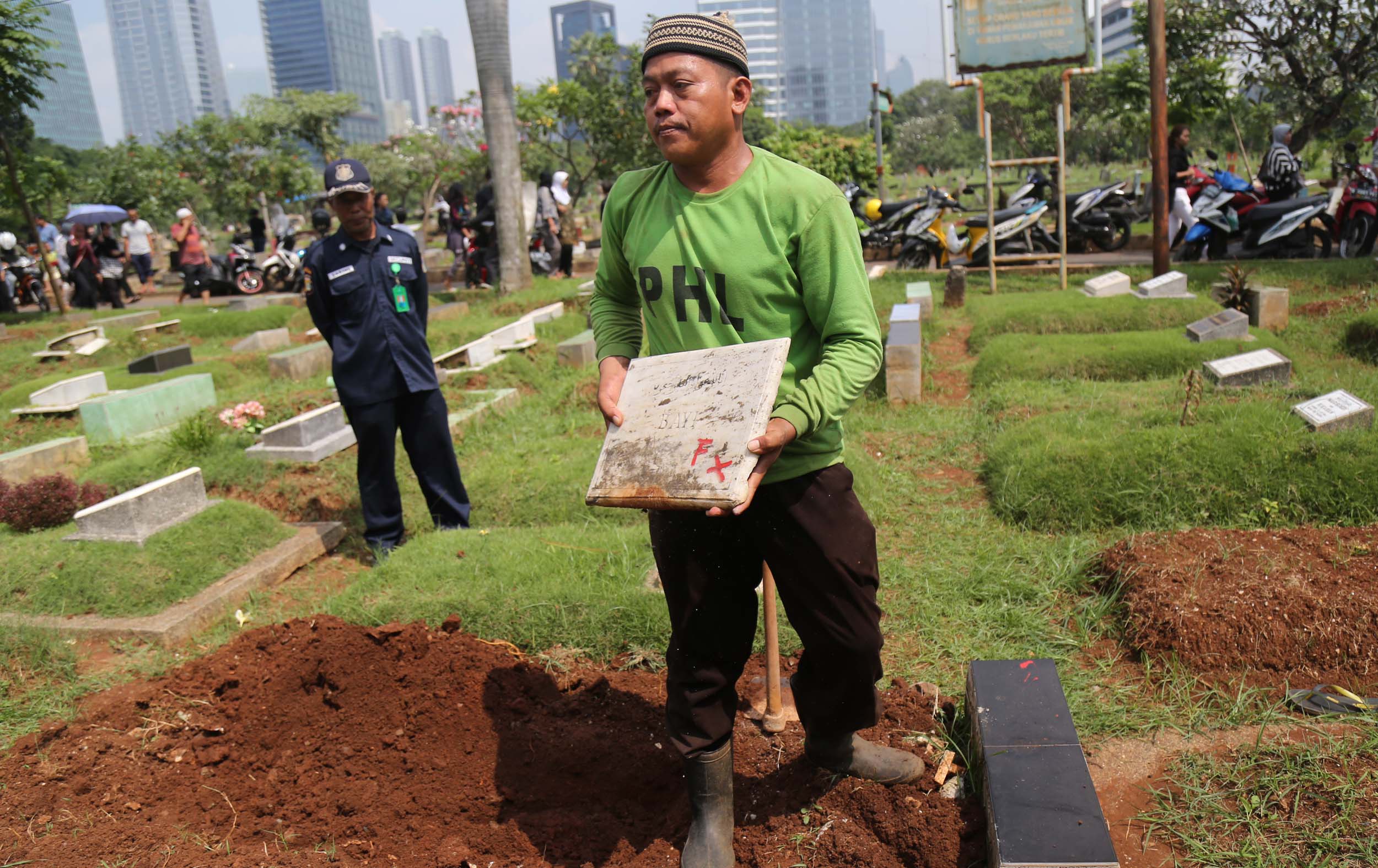 Petugas PHL membongkar sebuah makam fiktif dengan batu nisan bertuliskan BAYI di Taman Pemakaman Umum (TPU) Menteng Pulo, Jakarta Selatan, Kamis (28/7/2016). Makam fiktif Diresmikan di TPU Menteng Pulo dengan ciri batu nisan bertuliskan BAYI. 11 makam fiktif berada di beberapa blok di Menteng Pulo. Salah satu berada di blok AA I unit Islam di TPU Menteng Pulo.