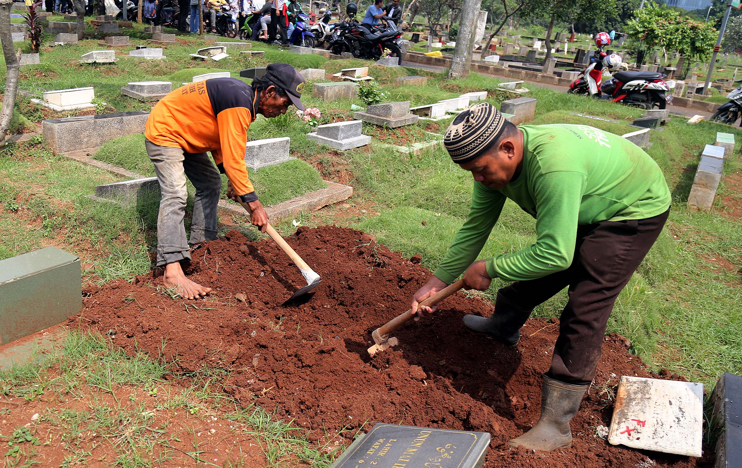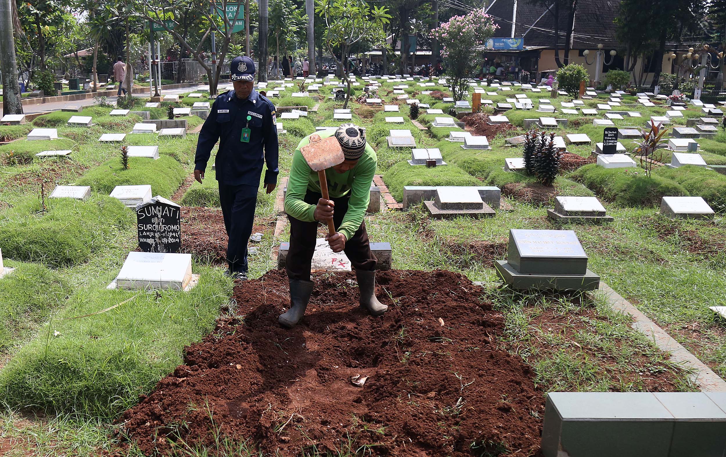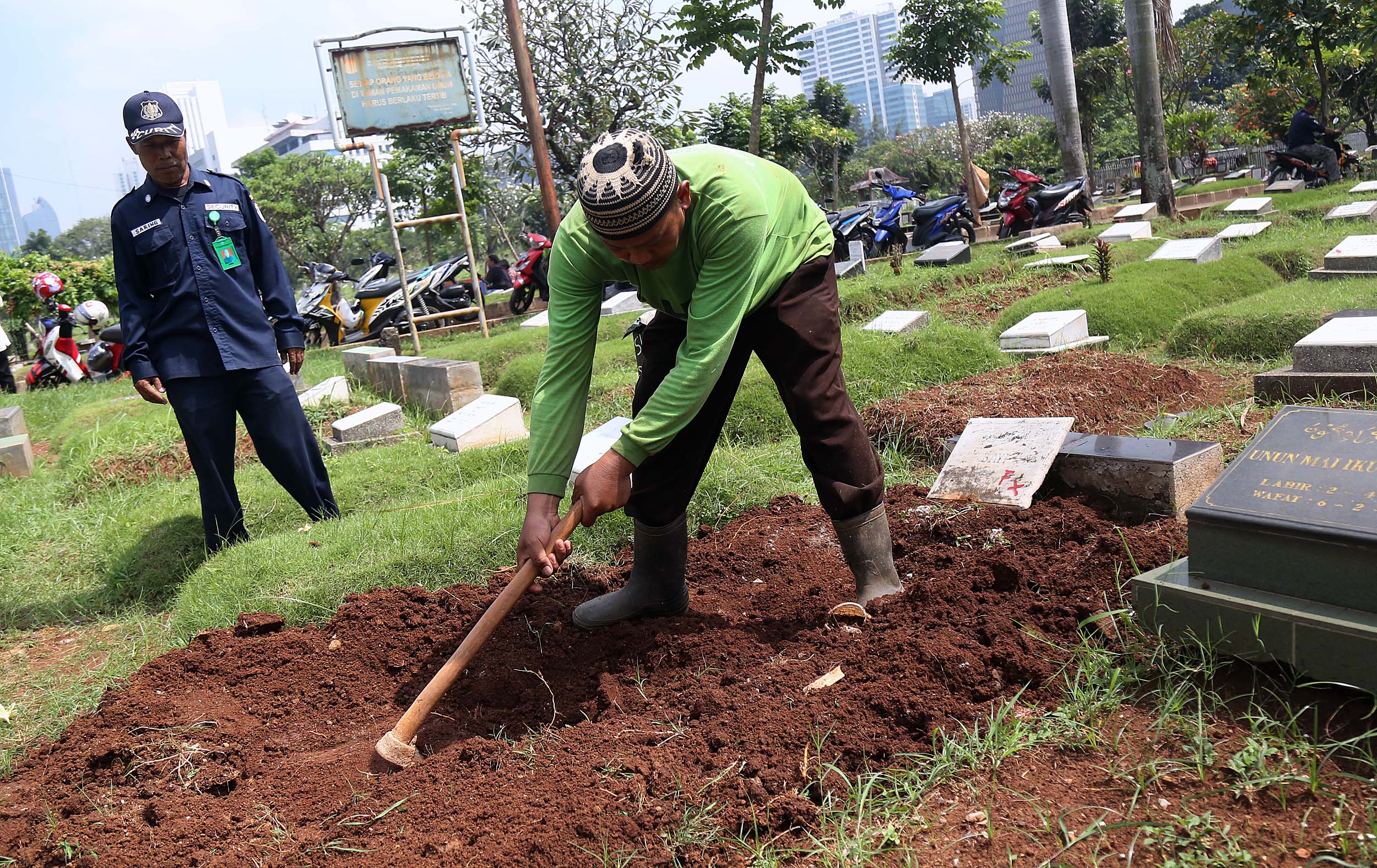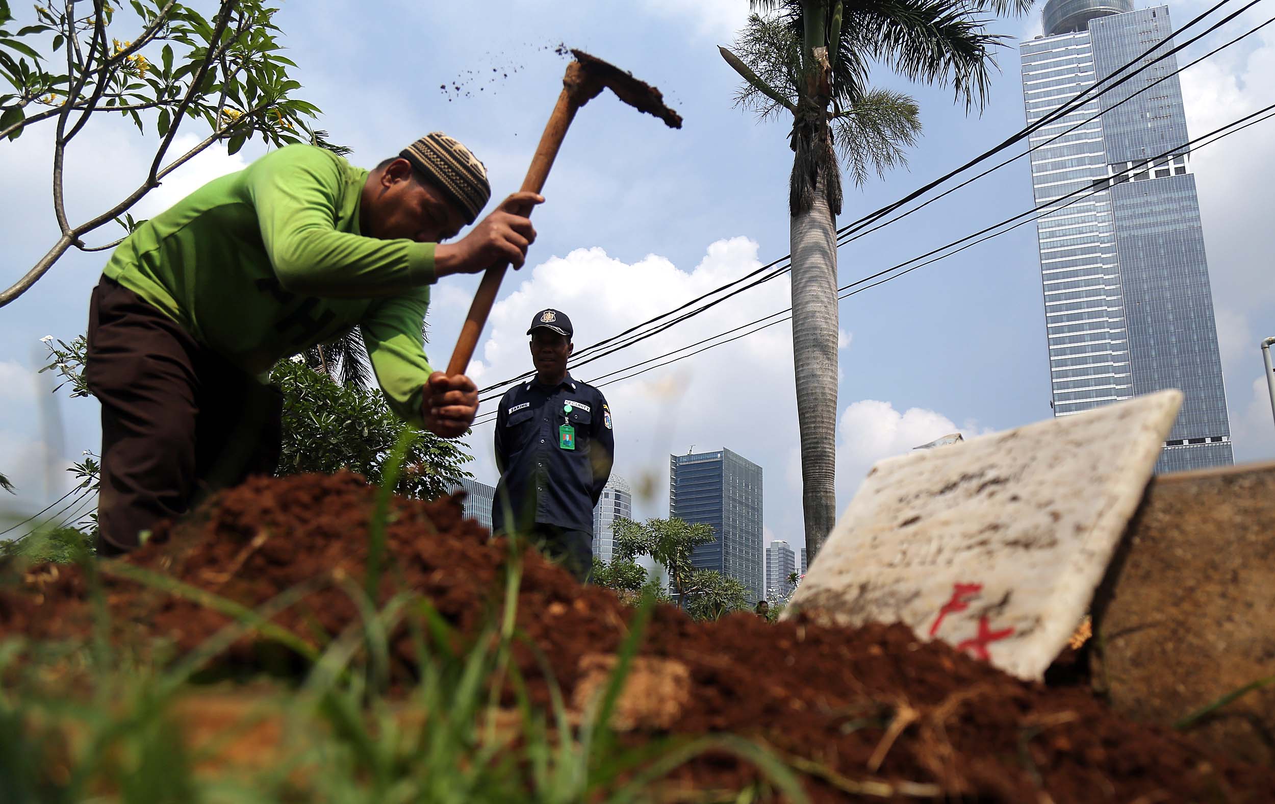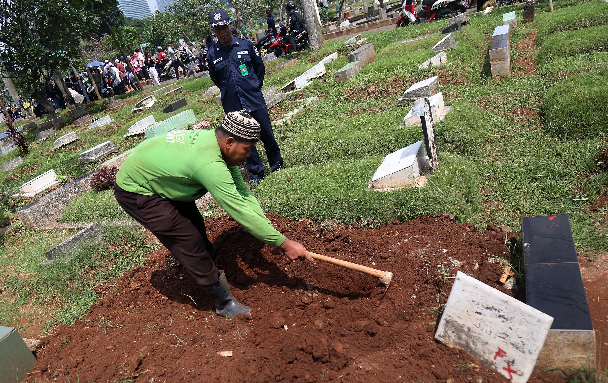 Petugas PHL membongkar sebuah makam fiktif dengan batu nisan bertuliskan BAYI di Taman Pemakaman Umum (TPU) Menteng Pulo, Jakarta Selatan, Kamis (28/7/2016). Makam fiktif Diresmikan di TPU Menteng Pulo dengan ciri batu nisan bertuliskan BAYI. 11 makam fiktif berada di beberapa blok di Menteng Pulo. Salah satu berada di blok AA I unit Islam di TPU Menteng Pulo.