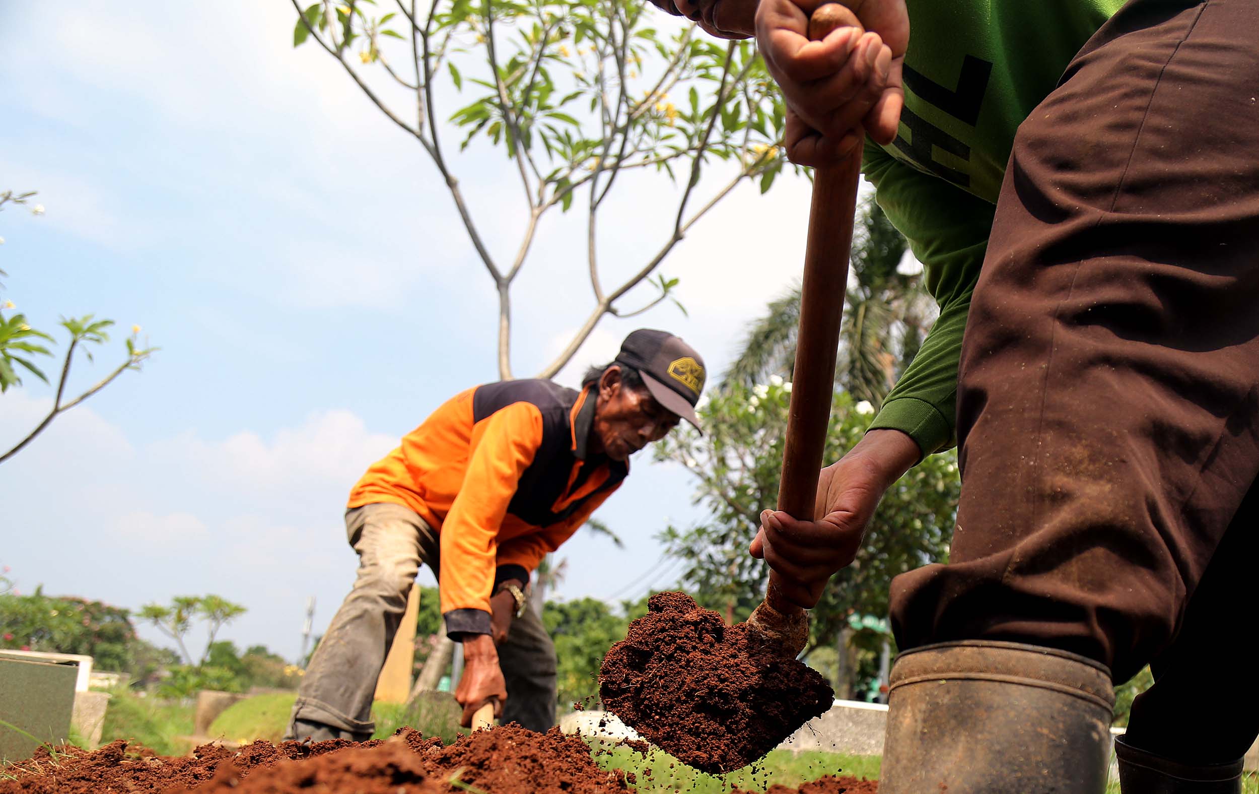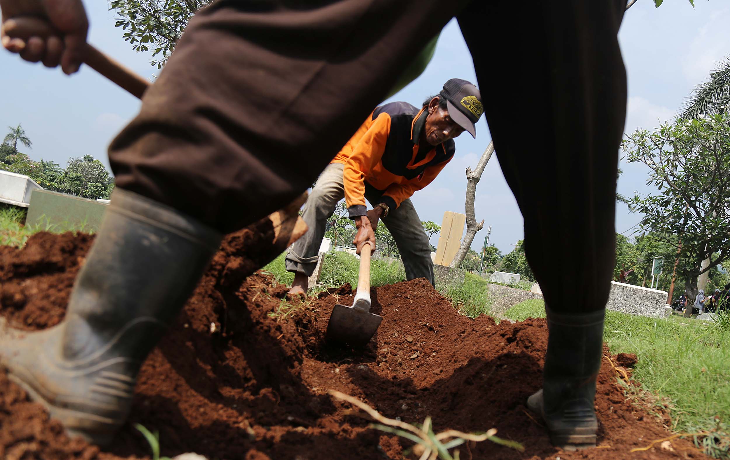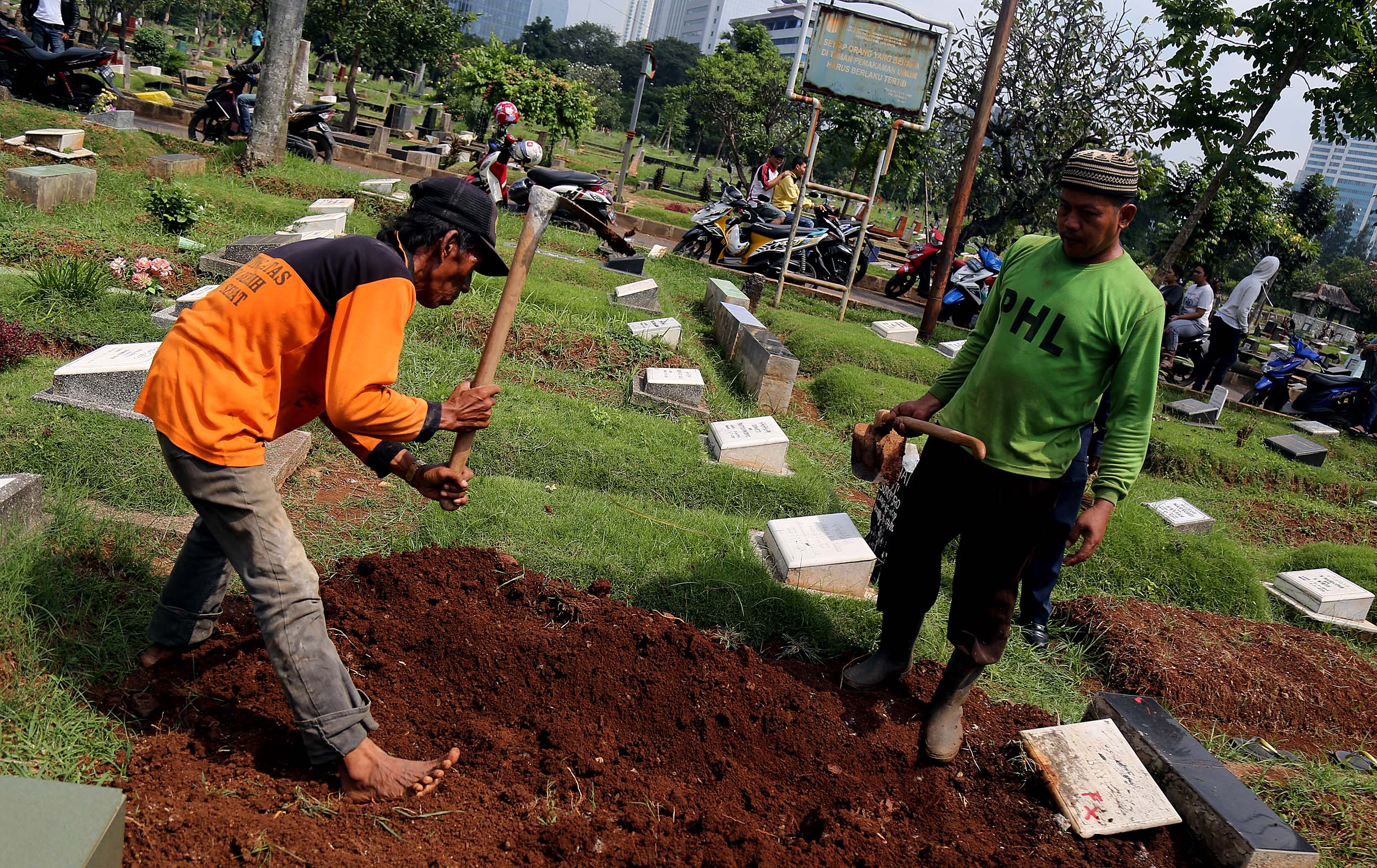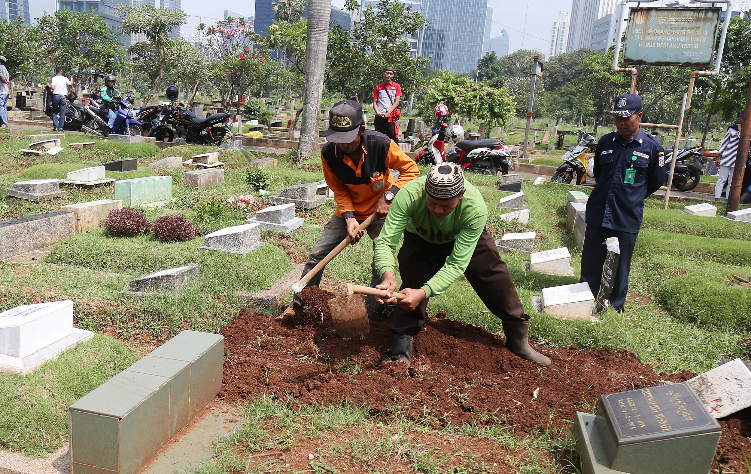 Petugas PHL membongkar sebuah makam fiktif dengan batu nisan bertuliskan BAYI di Taman Pemakaman Umum (TPU) Menteng Pulo, Jakarta Selatan, Kamis (28/7/2016). Makam fiktif Diresmikan di TPU Menteng Pulo dengan ciri batu nisan bertuliskan BAYI. 11 makam fiktif berada di beberapa blok di Menteng Pulo. Salah satu berada di blok AA I unit Islam di TPU Menteng Pulo.