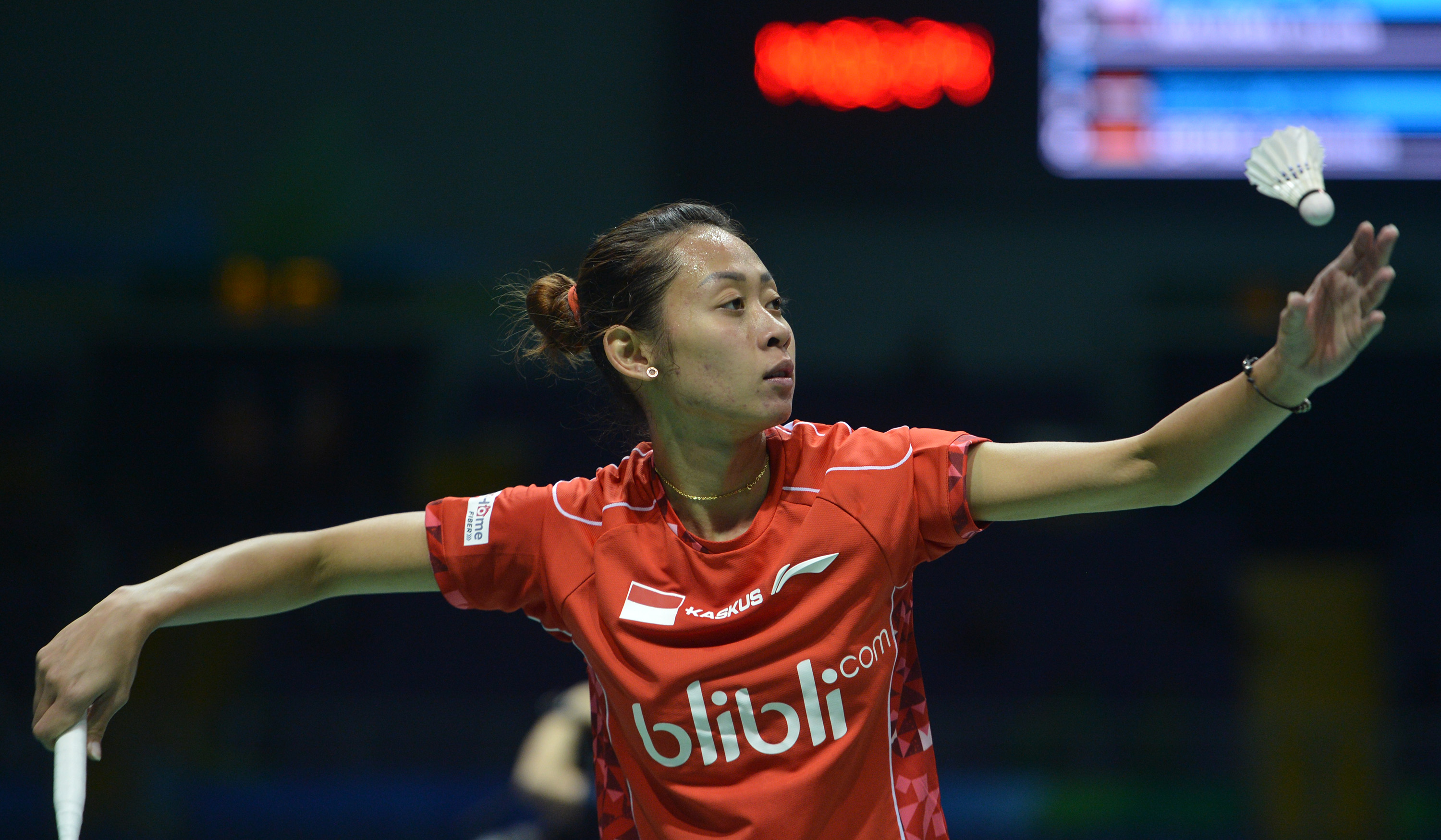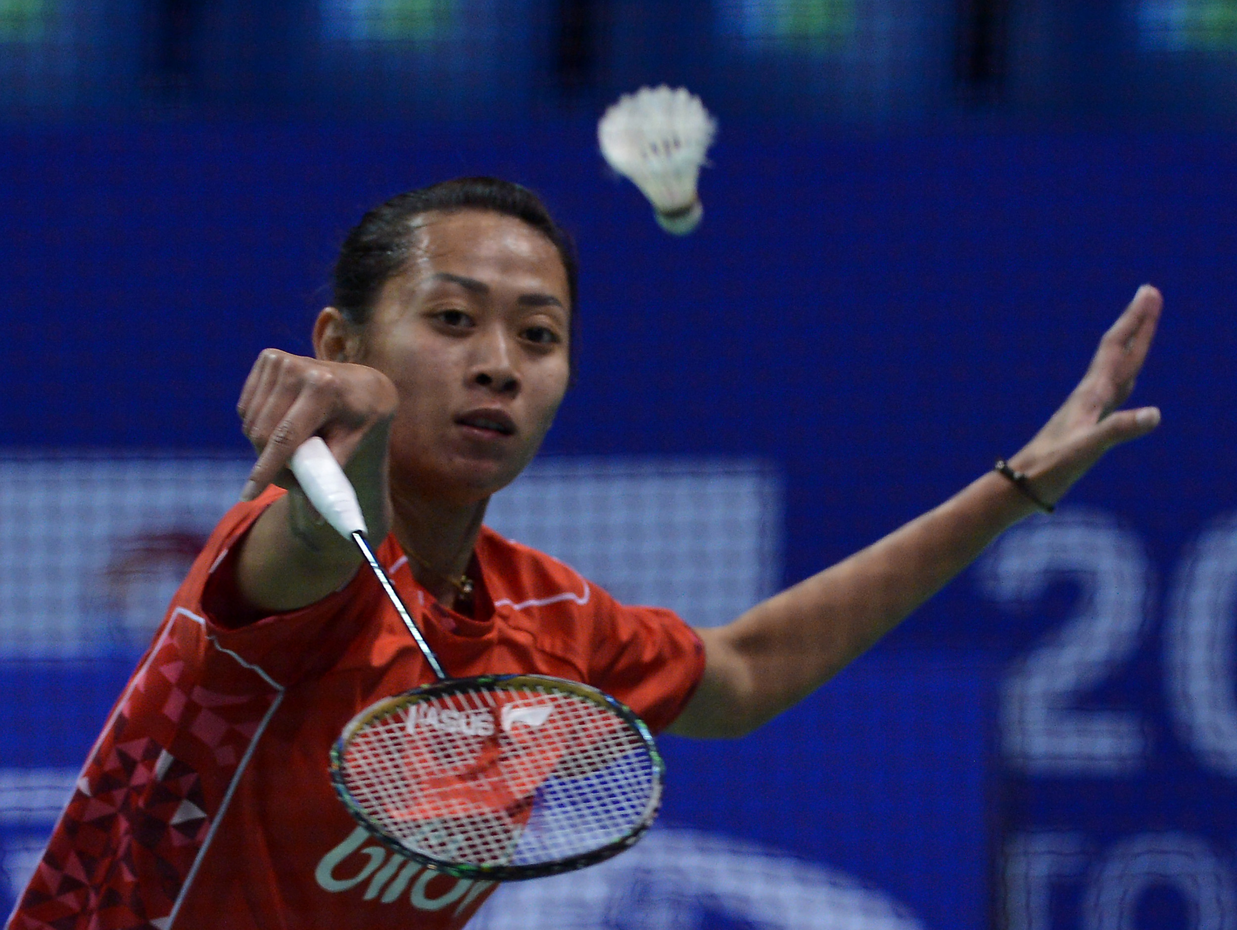 Pebulutangkis tunggal putri Indonesia Maria Febe Kusumastuti mengembalikan kok ke arah lawannya pebulutangkis Thailand Ratchanok Intanon pada pertandingan penyisihan Grup C Piala Uber 2016 di Kunshan Sport Center Gymnasium, Tiongkok, Selasa (17/5). Maria Febe kalah dengan skor 14-21 dan 14-21. ANTARA FOTO/Prasetyo Utomo/pd/16