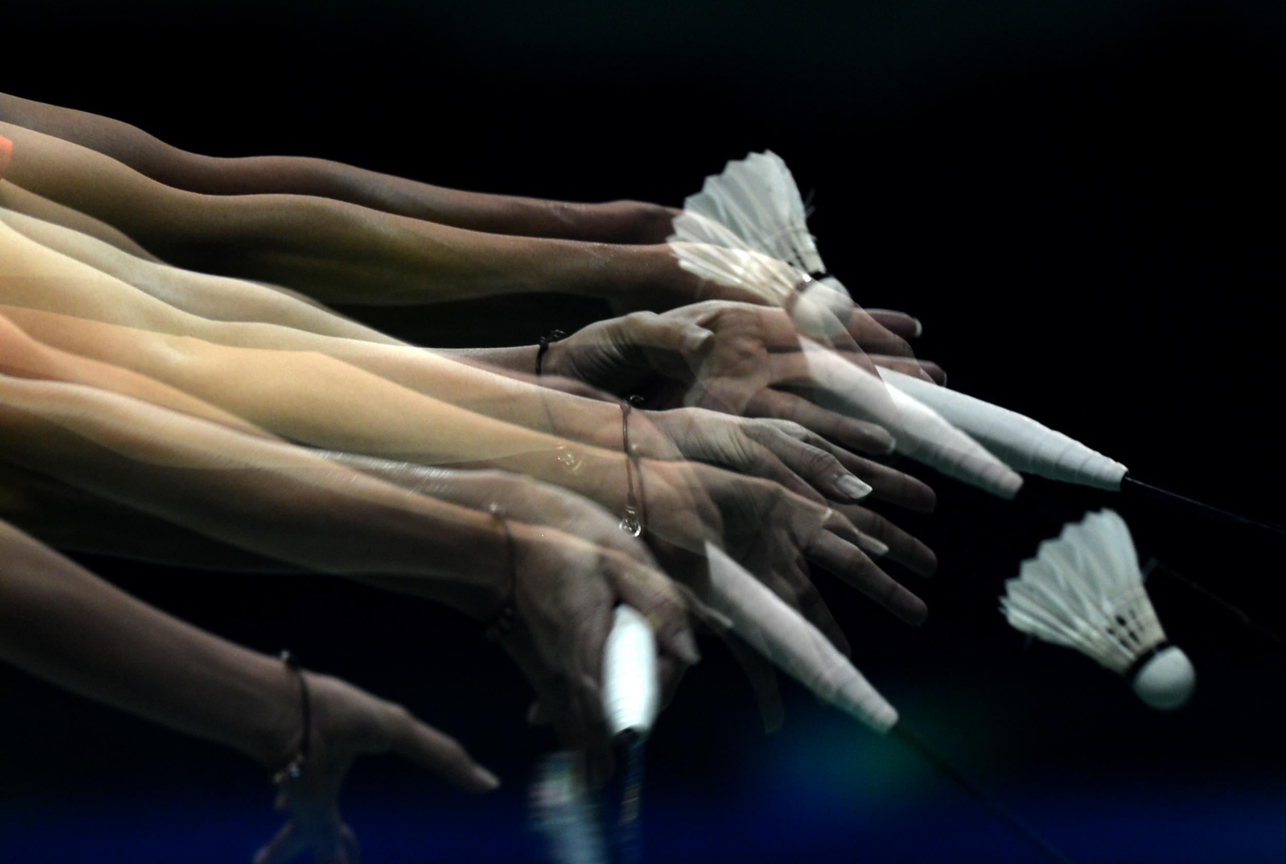 Foto multiple exposure saat pebulutangkis tunggal putri Indonesia Maria Febe Kusumastuti melakukan servis ke arah lawannya pebulutangkis Thailand Ratchanok Intanon pada pertandingan penyisihan Grup C Piala Uber 2016 di Kunshan Sport Center Gymnasium, Tiongkok, Selasa (17/5). Maria Febe kalah dengan skor 14-21 dan 14-21. ANTARA FOTO/Prasetyo Utomo/pd/16.
