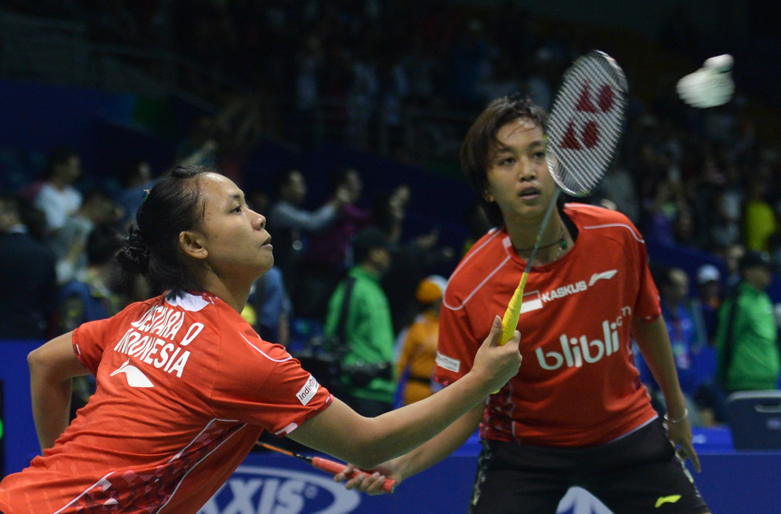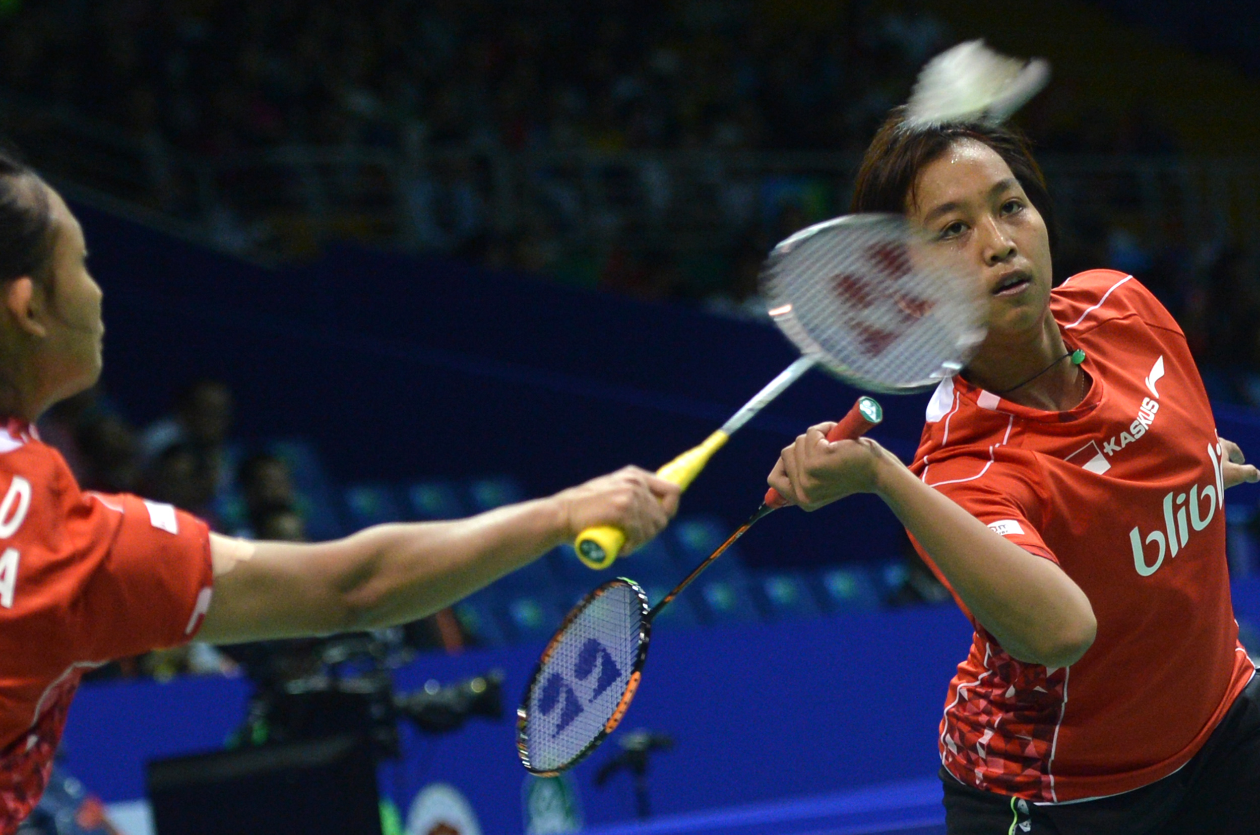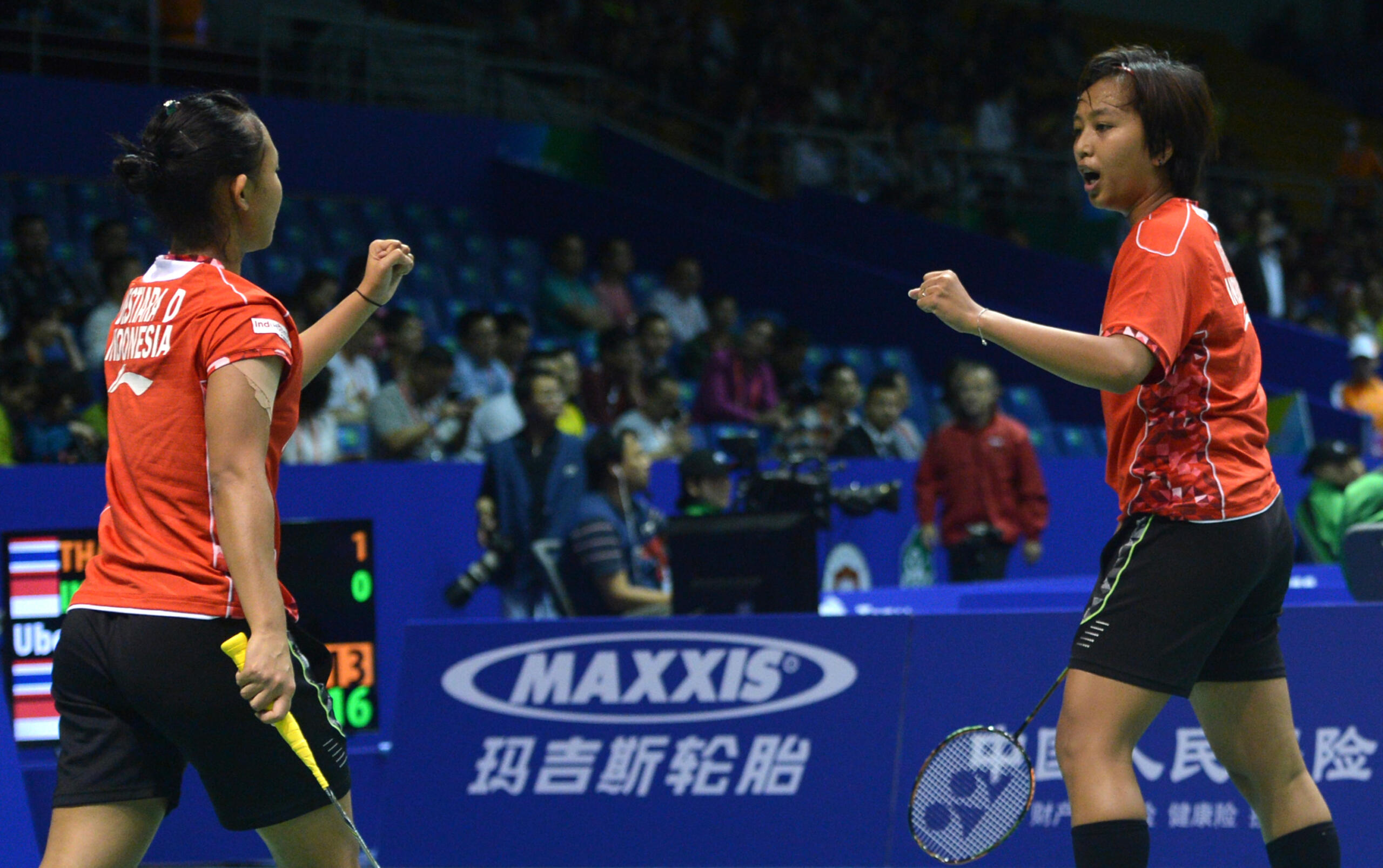 Ekpresisi pebulutangkis ganda putri Indonesia Della Destiana Haris (kiri) dan Rosyita Eka Putri Sari (kanan) ketika meraih angka saat melawan pebulutangkis ganda putri Thailand Puttita Supajirakul dan Sapsire Terattanachai pada pertandingan penyisihan Grup C Piala Uber 2016 di Kunshan Sport Center Gymnasium, Tiongkok, Selasa (17/5). Pasangan Indonesia menang dengan skor 21-14, 21-12. ANTARA FOTO/Prasetyo Utomo/pd/16.