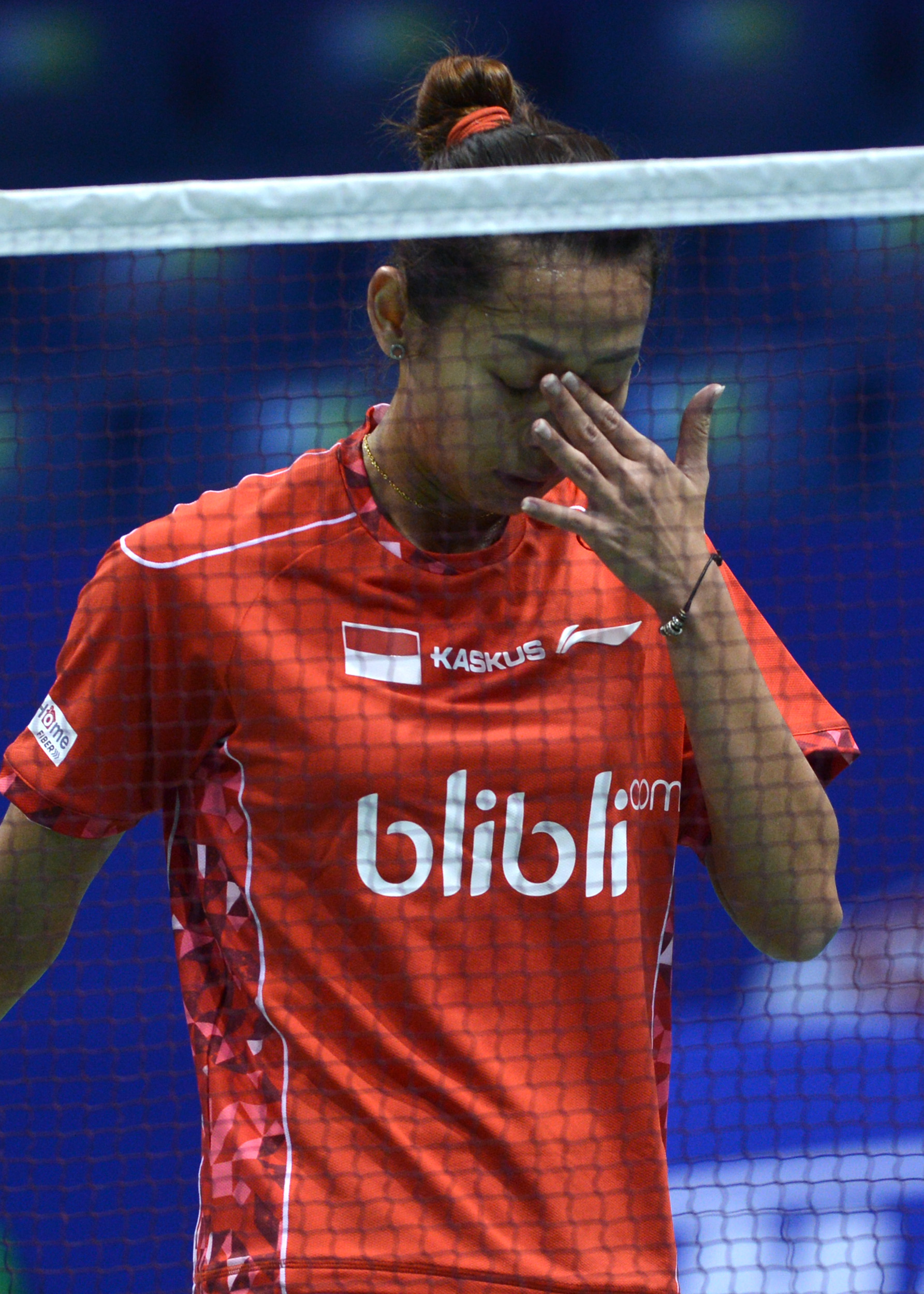 Ekspresi pebulutangkis tunggal putri Indonesia Maria Febe Kusumastuti seusai dikalahkan lawannya pebulutangkis Thailand Ratchanok Intanon pada pertandingan penyisihan Grup C Piala Uber 2016 di Kunshan Sport Center Gymnasium, Tiongkok, Selasa (17/5). Maria Febe kalah dengan skor 14-21 dan 14-21. ANTARA FOTO/Prasetyo Utomo/pd/16