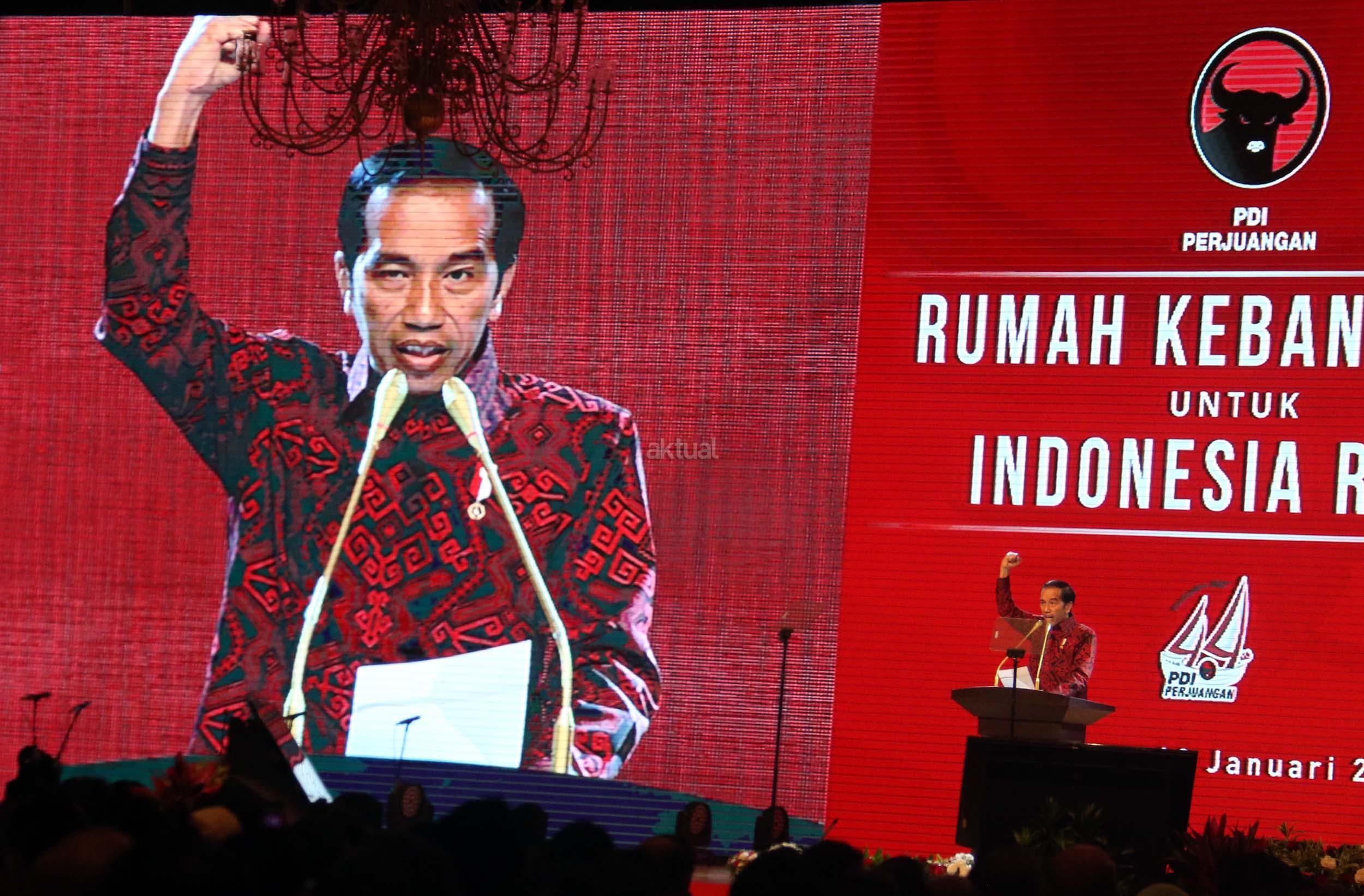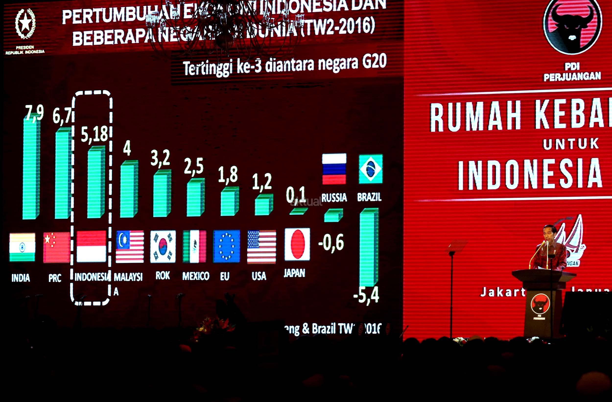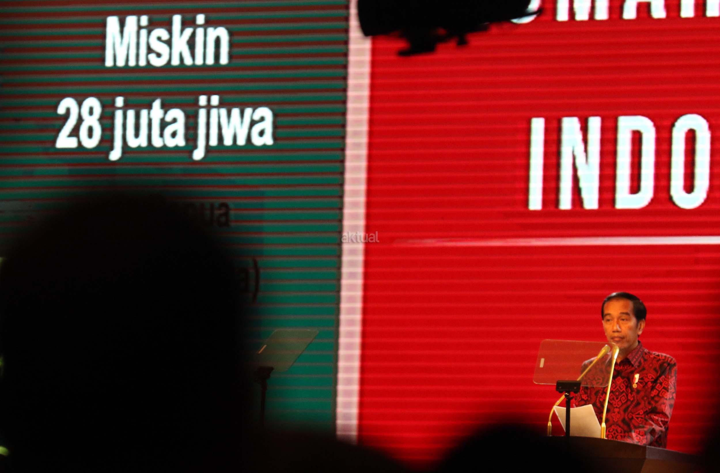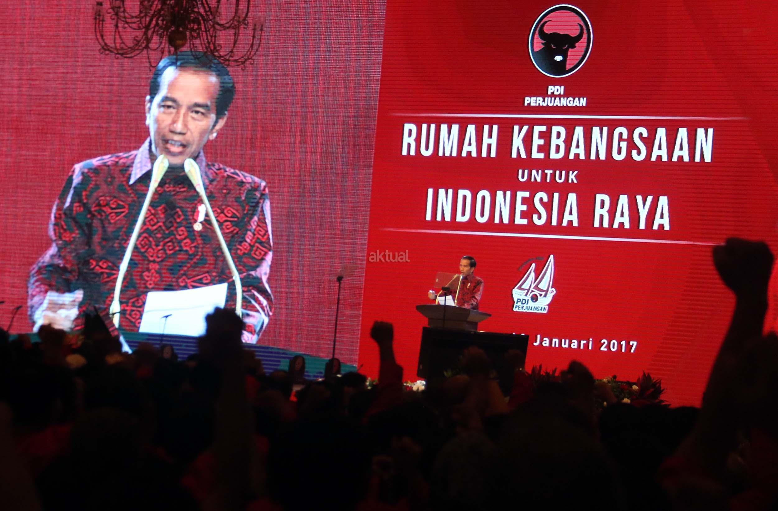 Presiden Joko Widodo (Jokowi) menyampaikan pidato politiknya pada acara HUT PDIP ke -44 di JCC, Jakarta Pusat, Selasa (10/1/2017). Perayaan HUT ke-44 PDI Perjuangan dihadiri Presiden Jokowi dan Wapres Jusuf Kalla. AKTUAL/Munzir