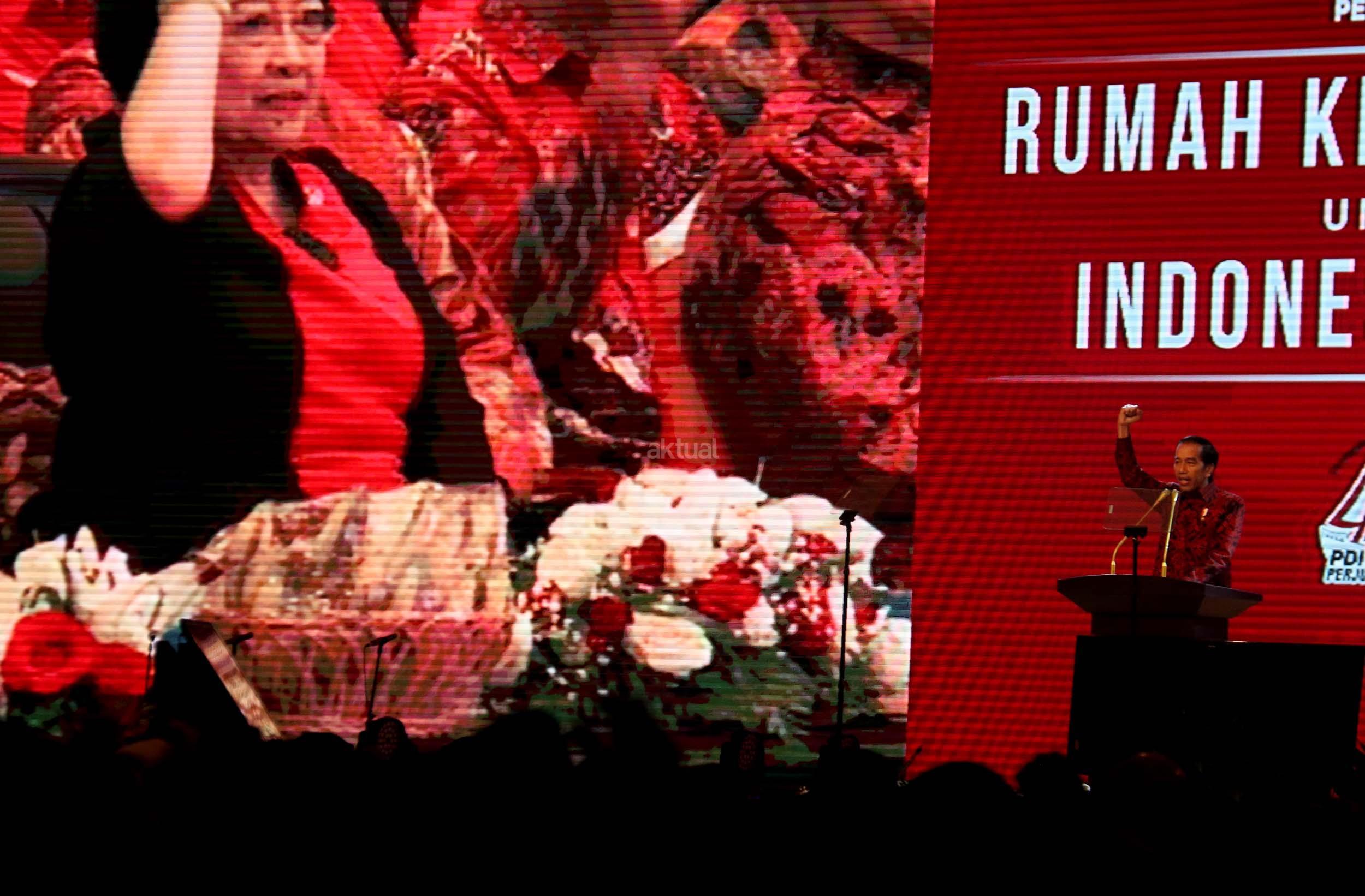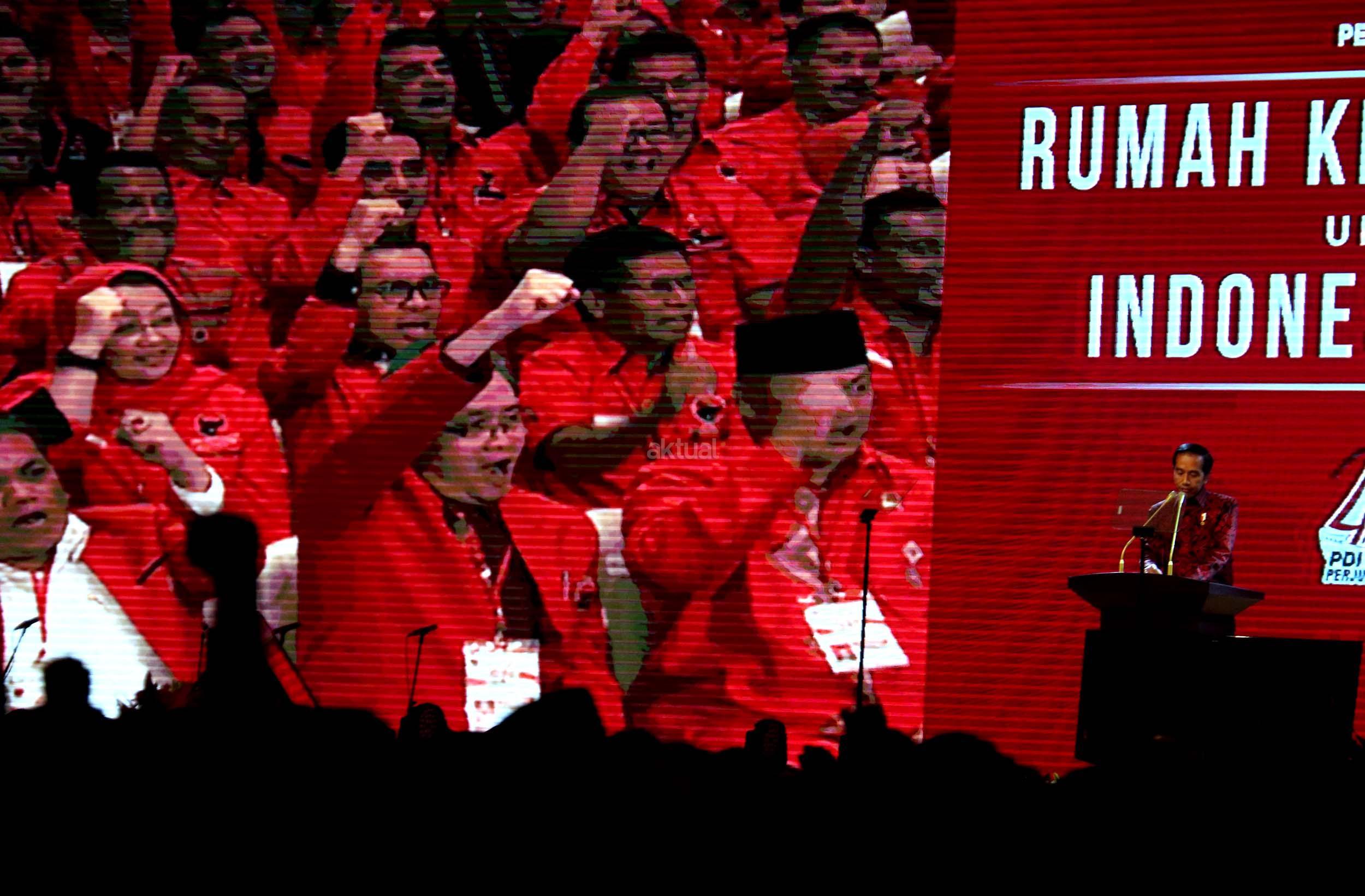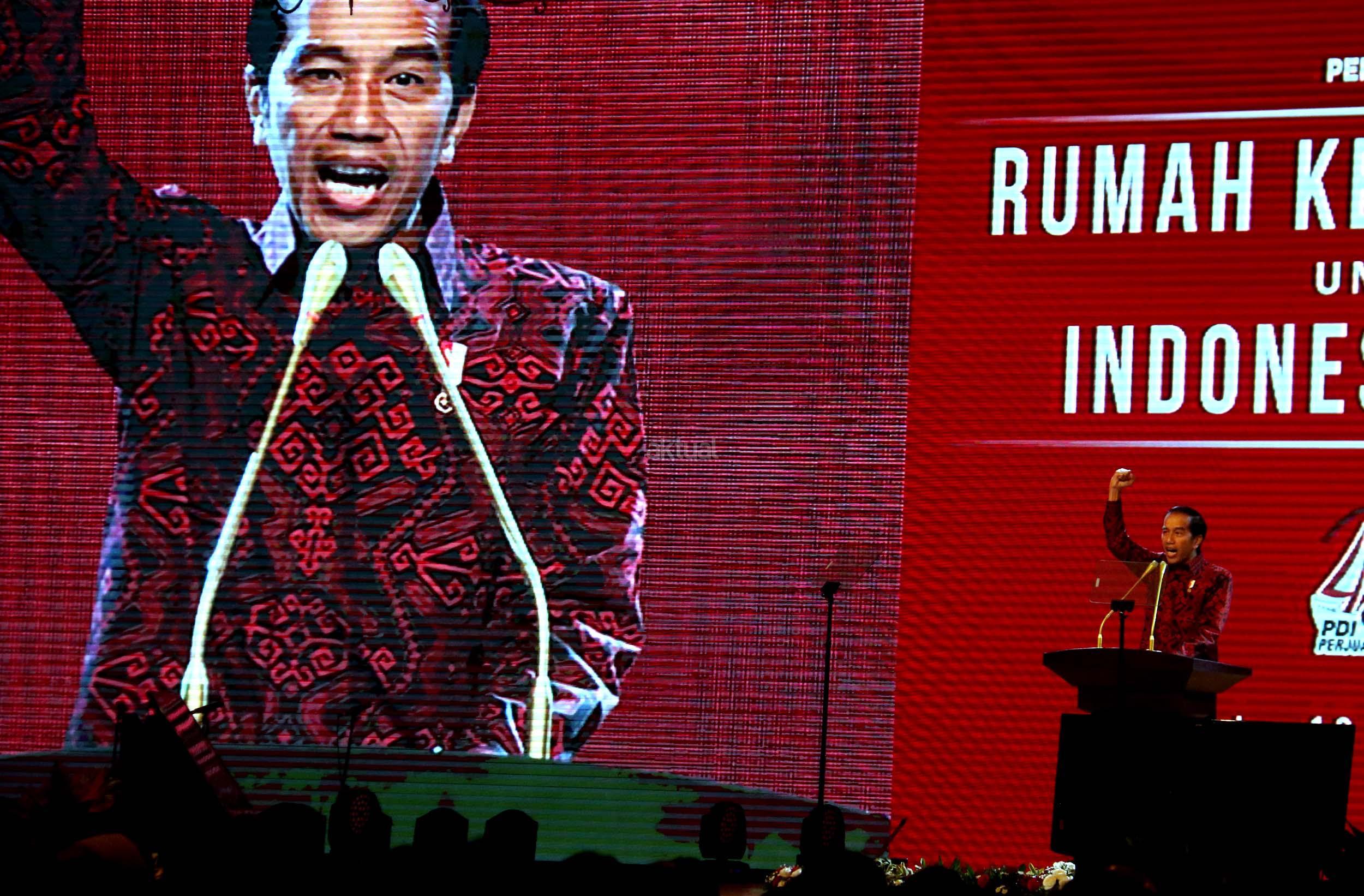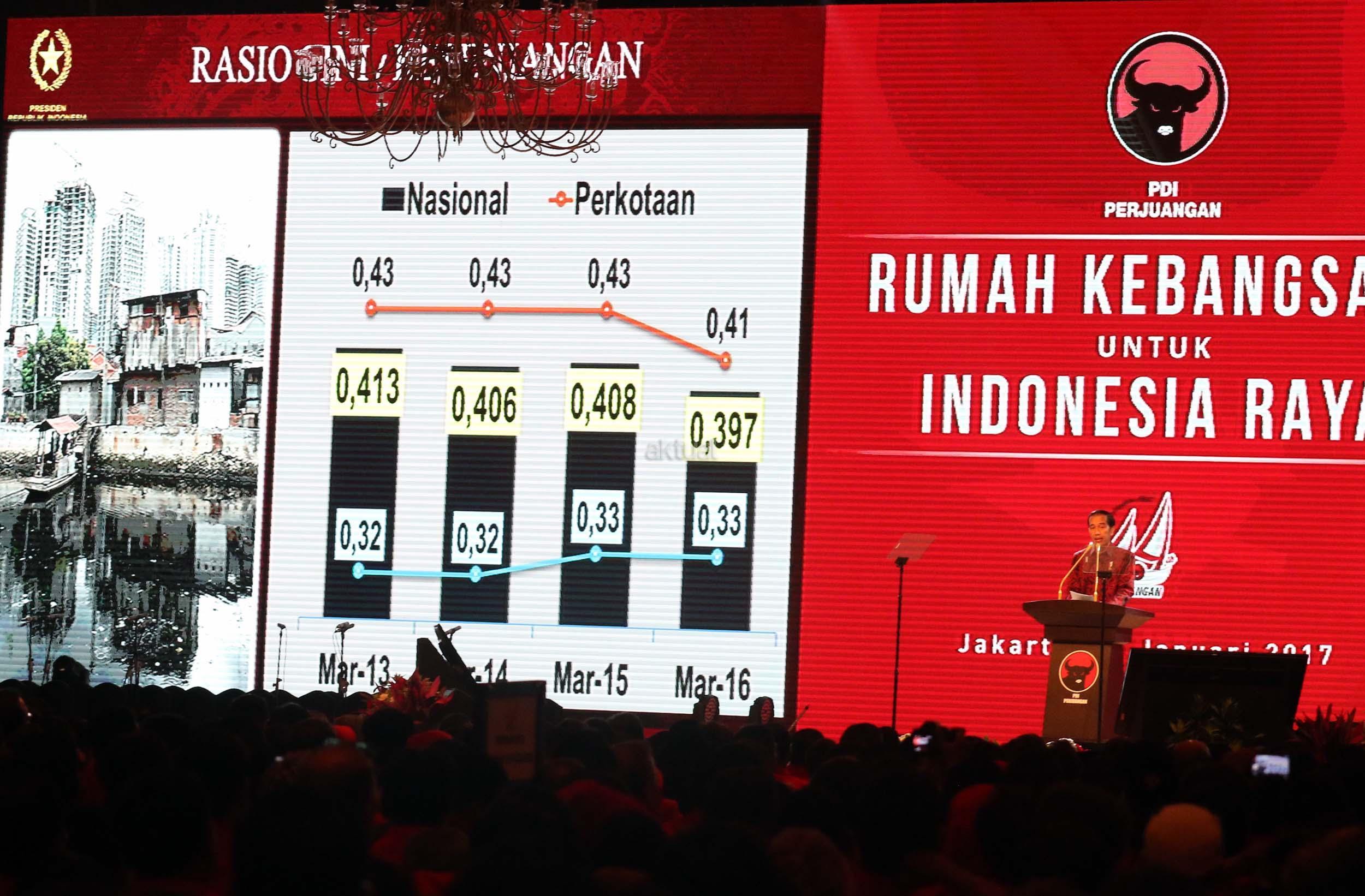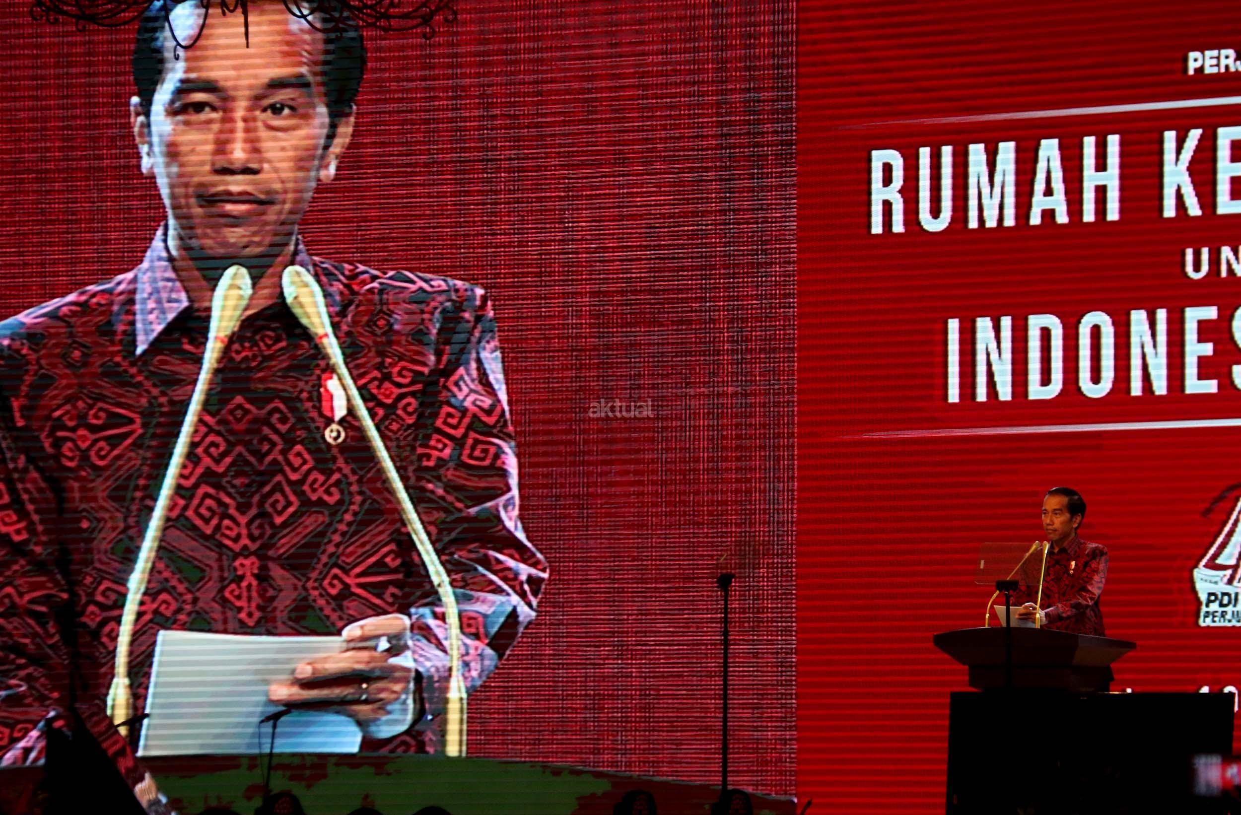 Presiden Joko Widodo (Jokowi) menyampaikan pidato politiknya pada acara HUT PDIP ke -44 di JCC, Jakarta Pusat, Selasa (10/1/2017). Perayaan HUT ke-44 PDI Perjuangan dihadiri Presiden Jokowi dan Wapres Jusuf Kalla. AKTUAL/Munzir