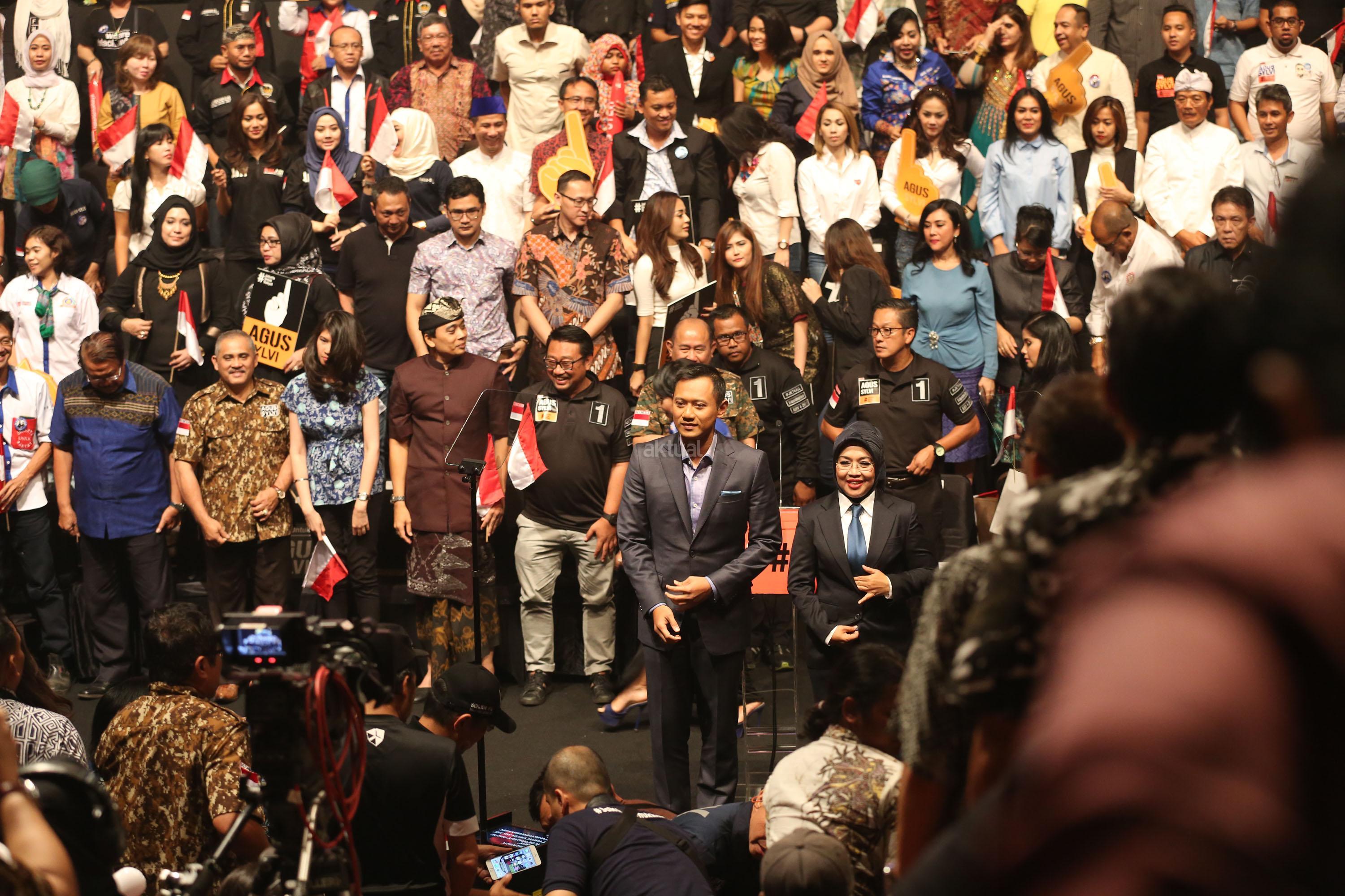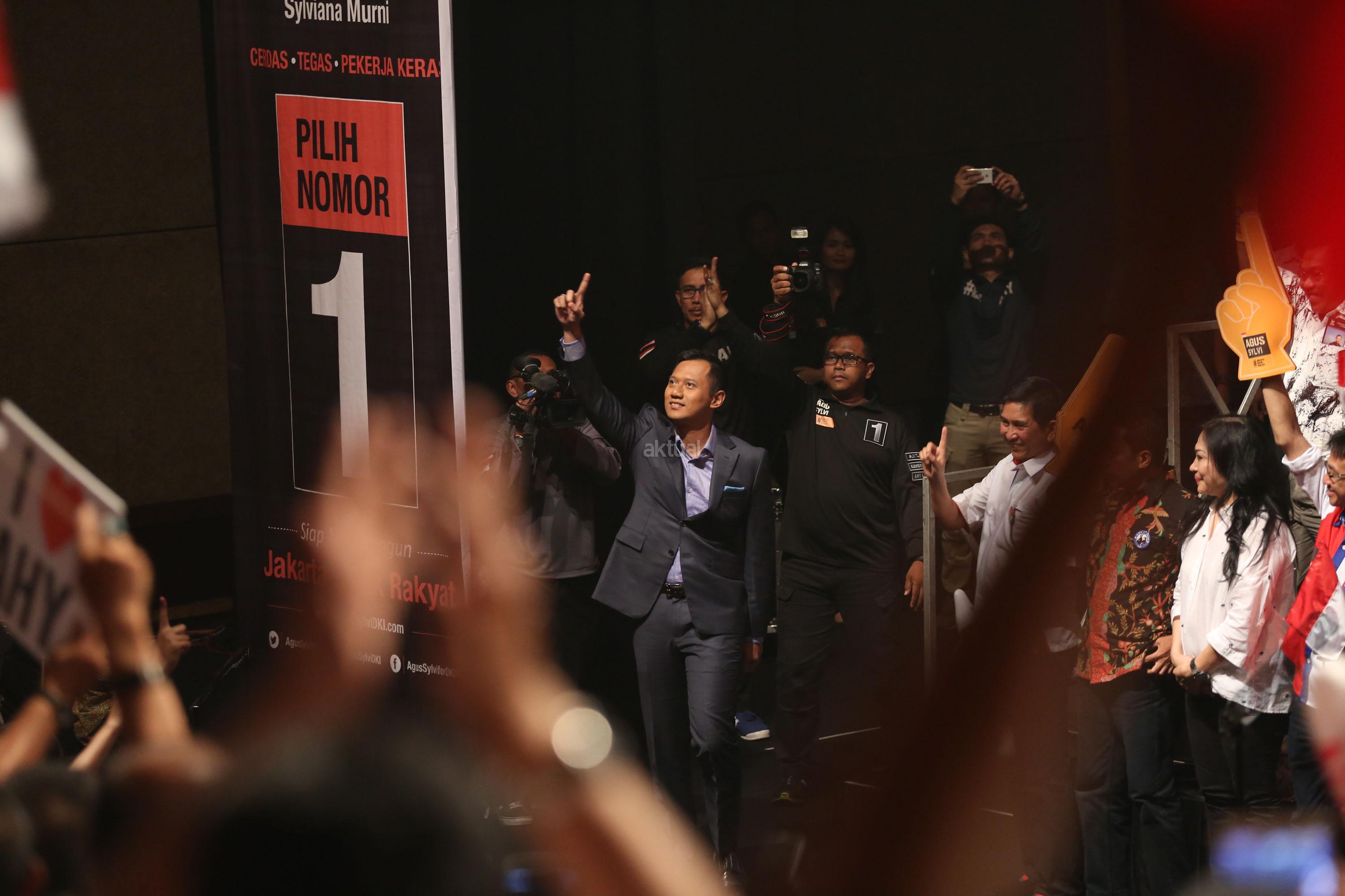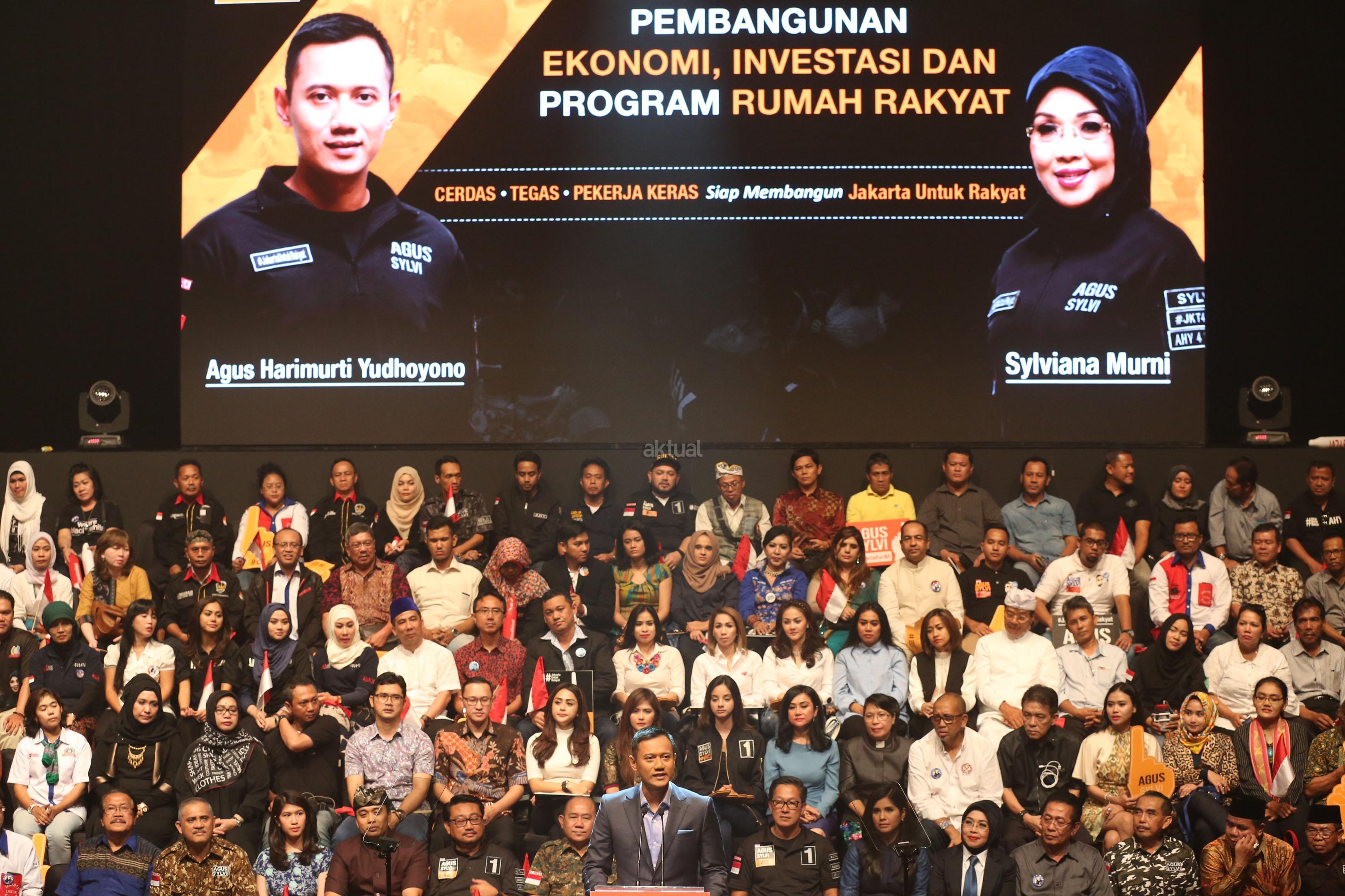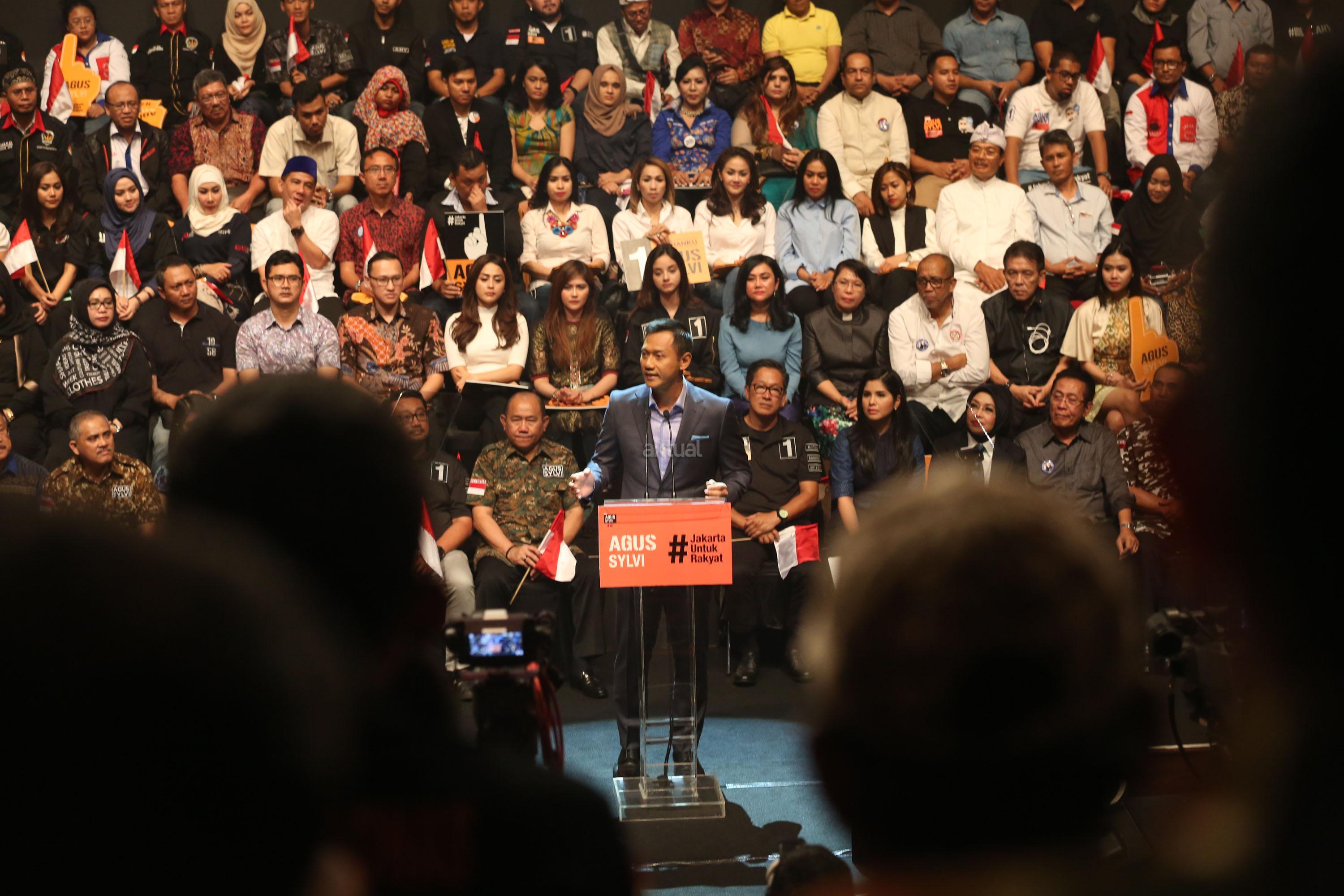 Calon Gubernur DKI Jakarta Agus Harimurti Yudhoyono menyampaikan pidato politiknya di Balai Kartini, Jakarta Selatan, Minggu, (27/11). Agus yang berpasangan dengan Sylviana Murni mengangkat tema Pembangunan Ekonomi Investasi dan Perumahan Rakyat. AKTUAL/Tino Oktaviano