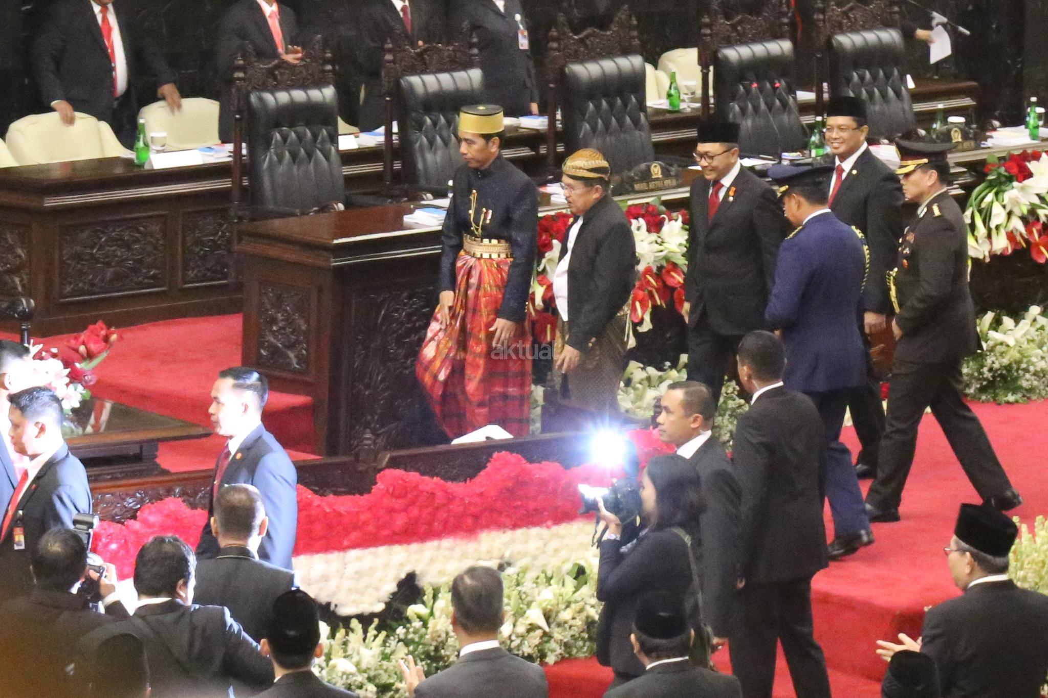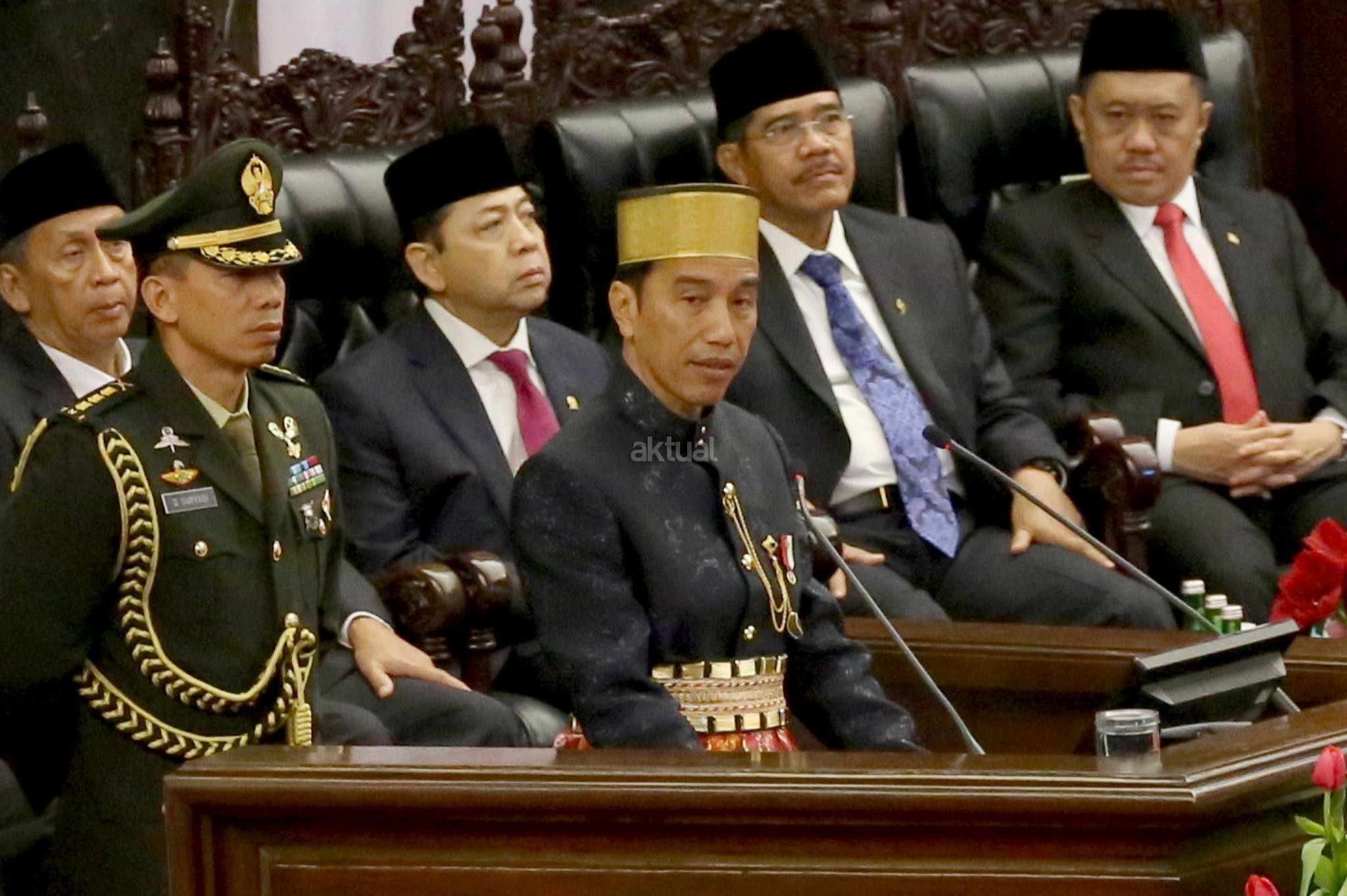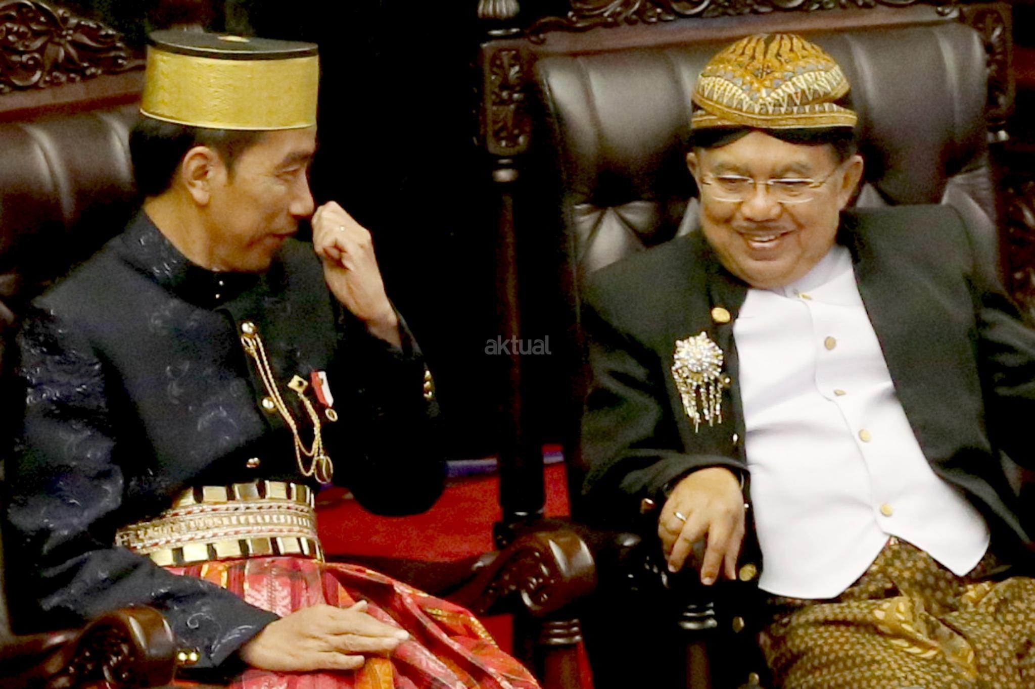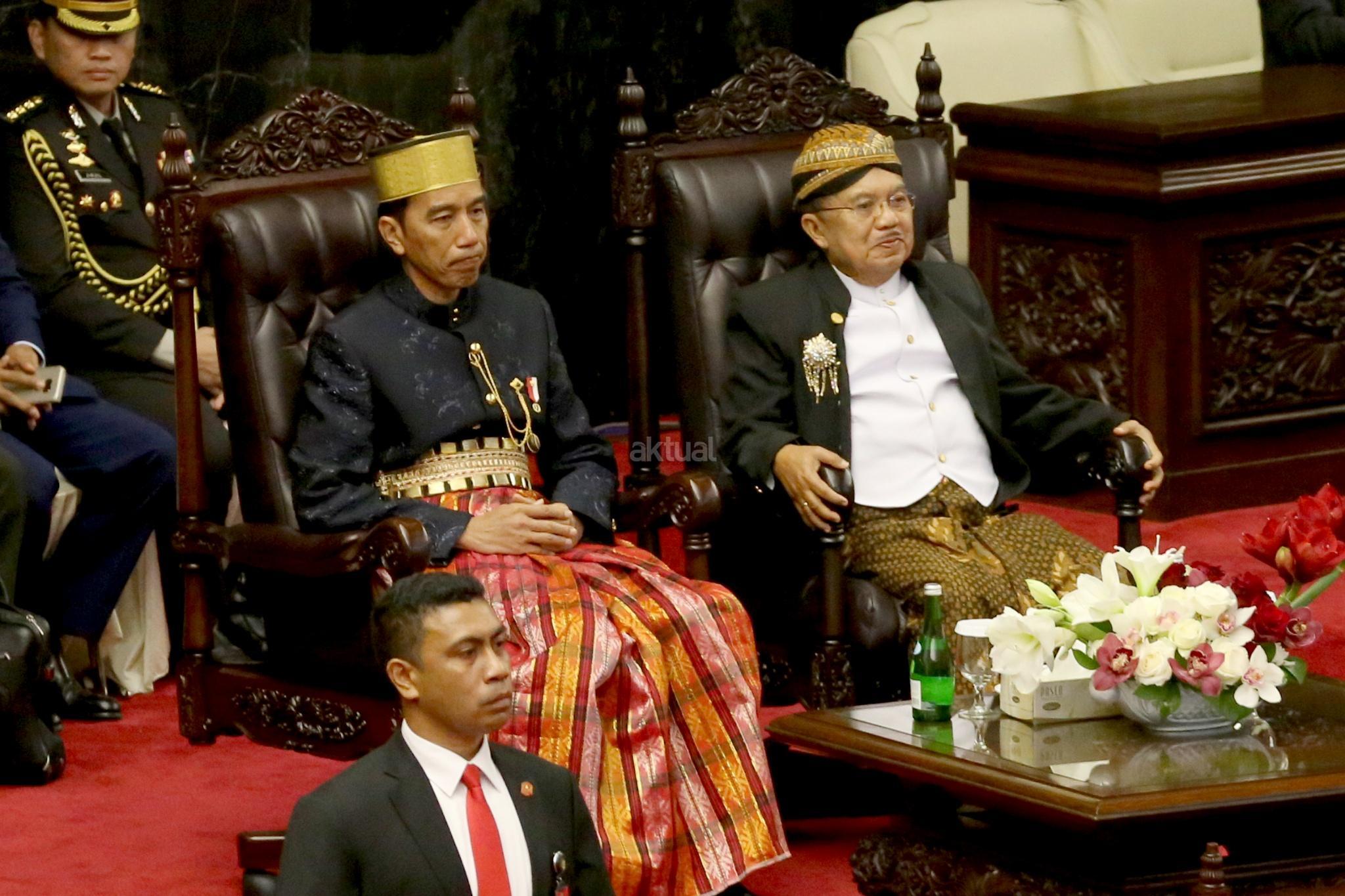 Presiden Joko Widodo (Jokowi) dan Wakil Presiden Jusuf Kalla pada Sidang Tahunan MPR di kompleks Parlemen, Senayan, Jakarta, Rabu (16/8). Sidang tersebut beragendakan mendengar pidato Presiden Joko Widodo selaku Kepala Negara. AKTUAL/Tino Oktaviano
