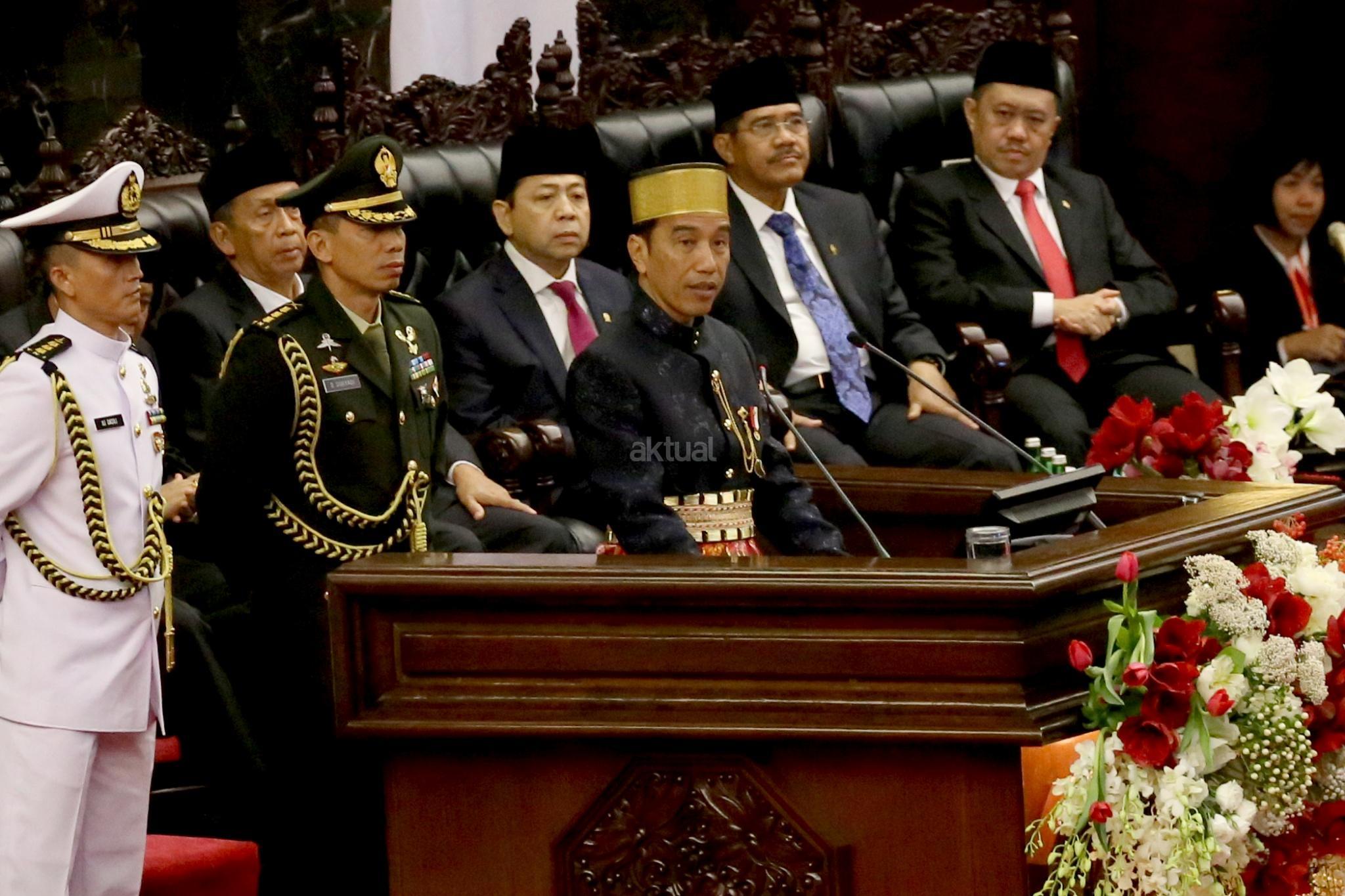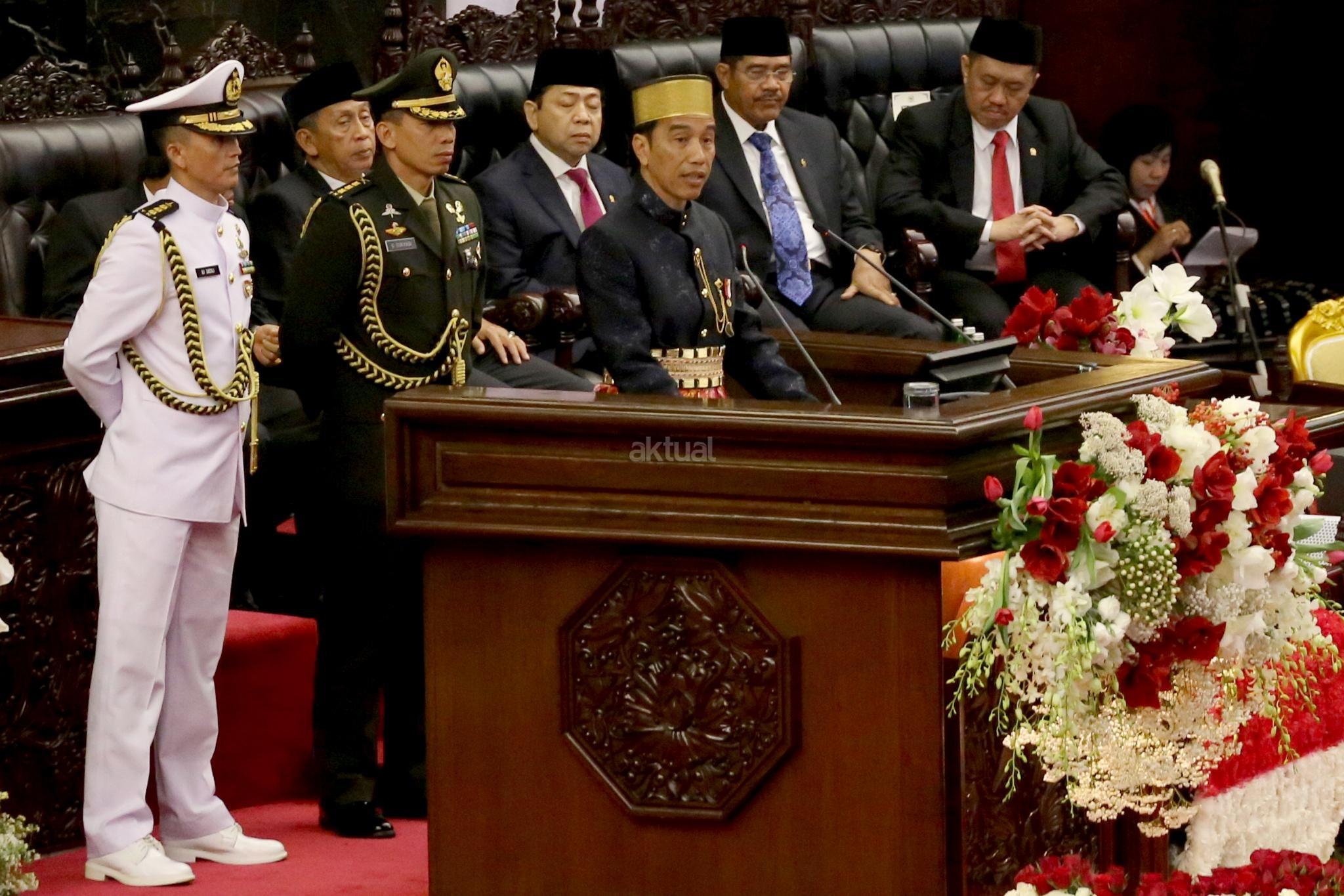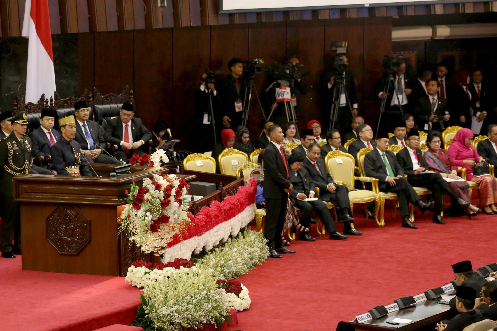 Presiden Joko Widodo menyampaikan pidato kenegaraan saat Sidang Tahunan MPR Tahun 2017 di Kompleks Parlemen, Senayan, Jakarta, Rabu (16/8). Sidang tersebut beragendakan penyampaian pidato kenegaraan Presiden Joko Widodo dalam rangka HUT Ke-72 Kemerdekaan Republik Indonesia. AKTUAL/Tino Oktaviano
