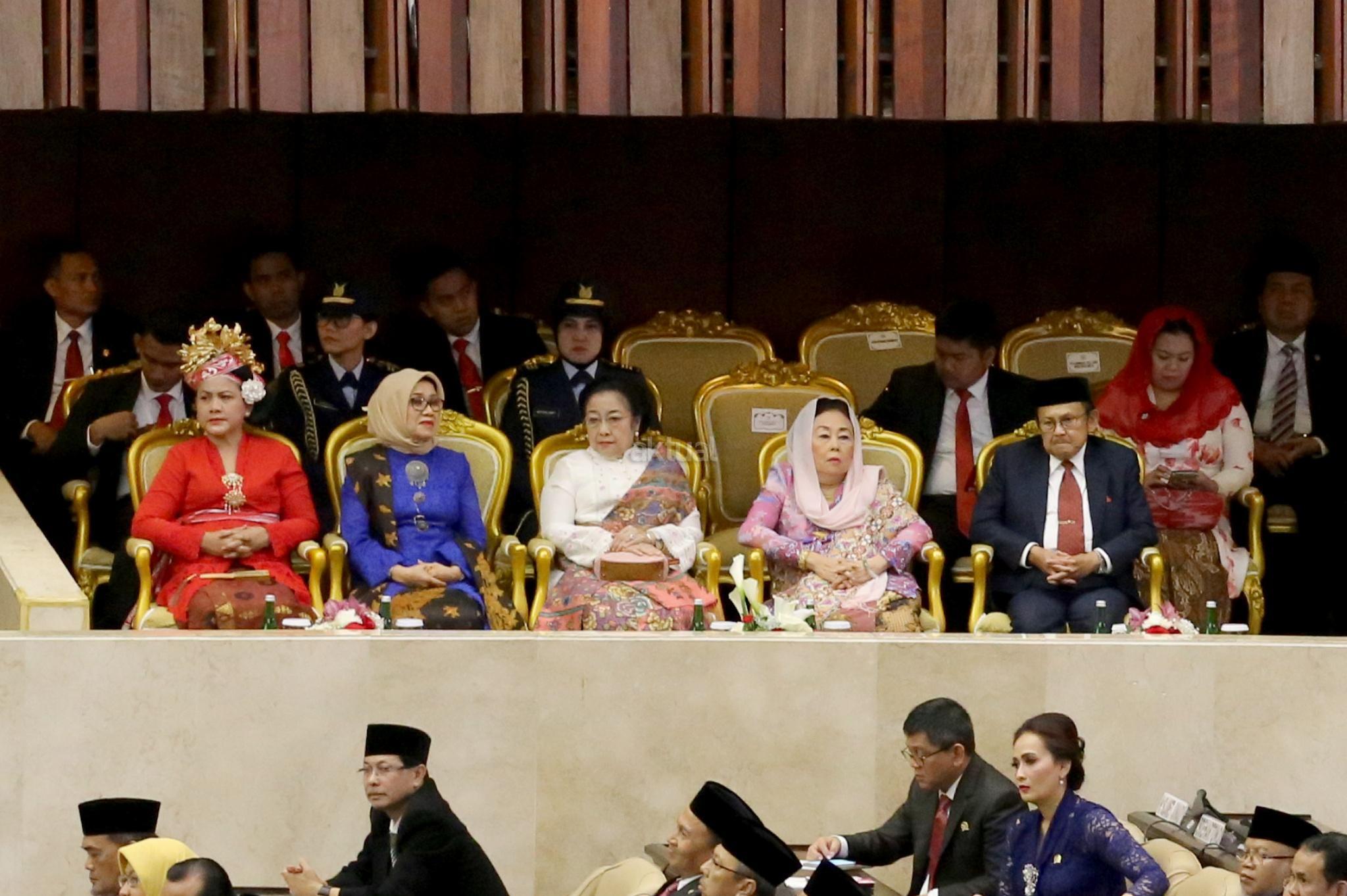 Ibu Negara, Iriana Joko Widodo bersama Istri Wakil Presiden RI Jusuf Kalla, Mufidah Kalla dan Presiden kelima RI Megawati Soekarnoputri pada Sidang Tahunan MPR di kompleks Parlemen, Senayan, Jakarta, Rabu (16/8). AKTUAL/Tino Oktaviano