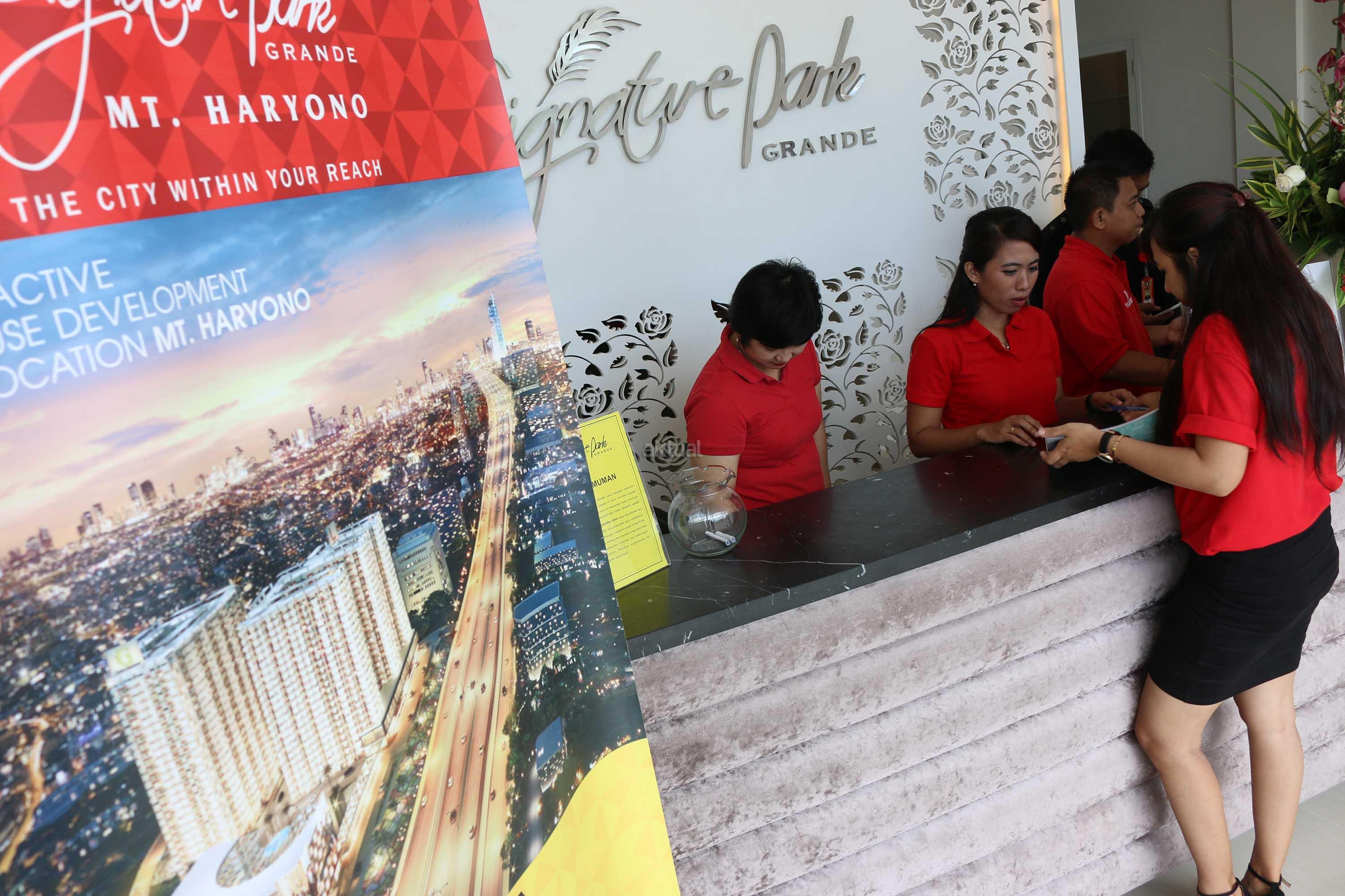 Suasana Front Office dan kantor marketing Sabtu (29/4).KSO Pikko Group dan PT Pelaksana Jaya Mulia laksanakan Grand Opening Show Unit dan Penandatangan kerja sama dengan para tenan retail area pusat Binsis dan Komersial Kawasan Terpadu Signature Park Grande,MT Haryono,Jakarta. Rencananya,hunian yang mengusung konsep One Stop Living, serah terima unit Menara The Light pada Juni 2017.Pengembang juga membuka peluang kerjasama manajemen rental profesional untuk mempercepat pengembalian investsi atas unit hunian , bersinergi dengan layanan rancangan inspirasi interior unit. AKTUAL/Eko S Hilman