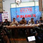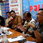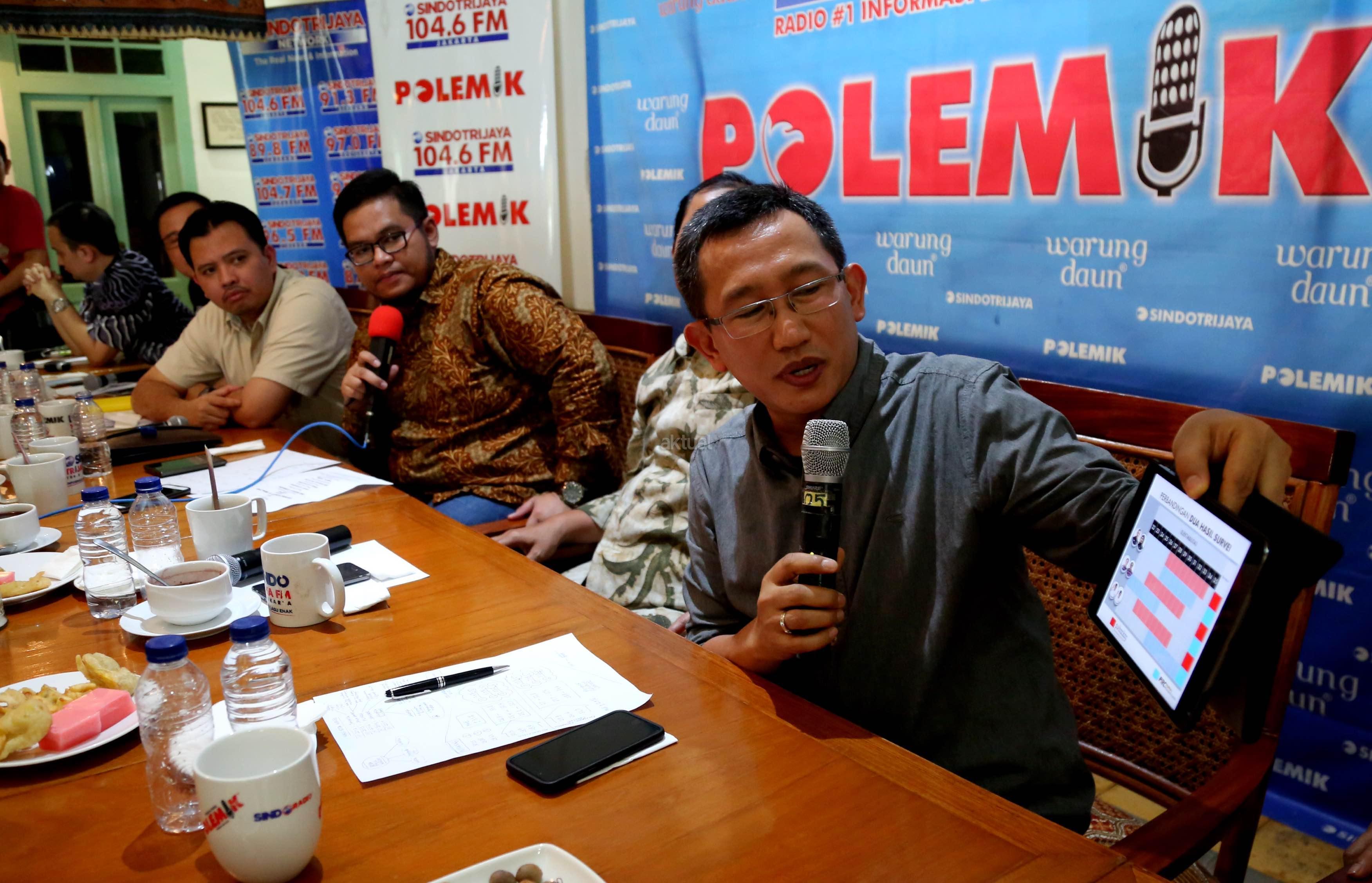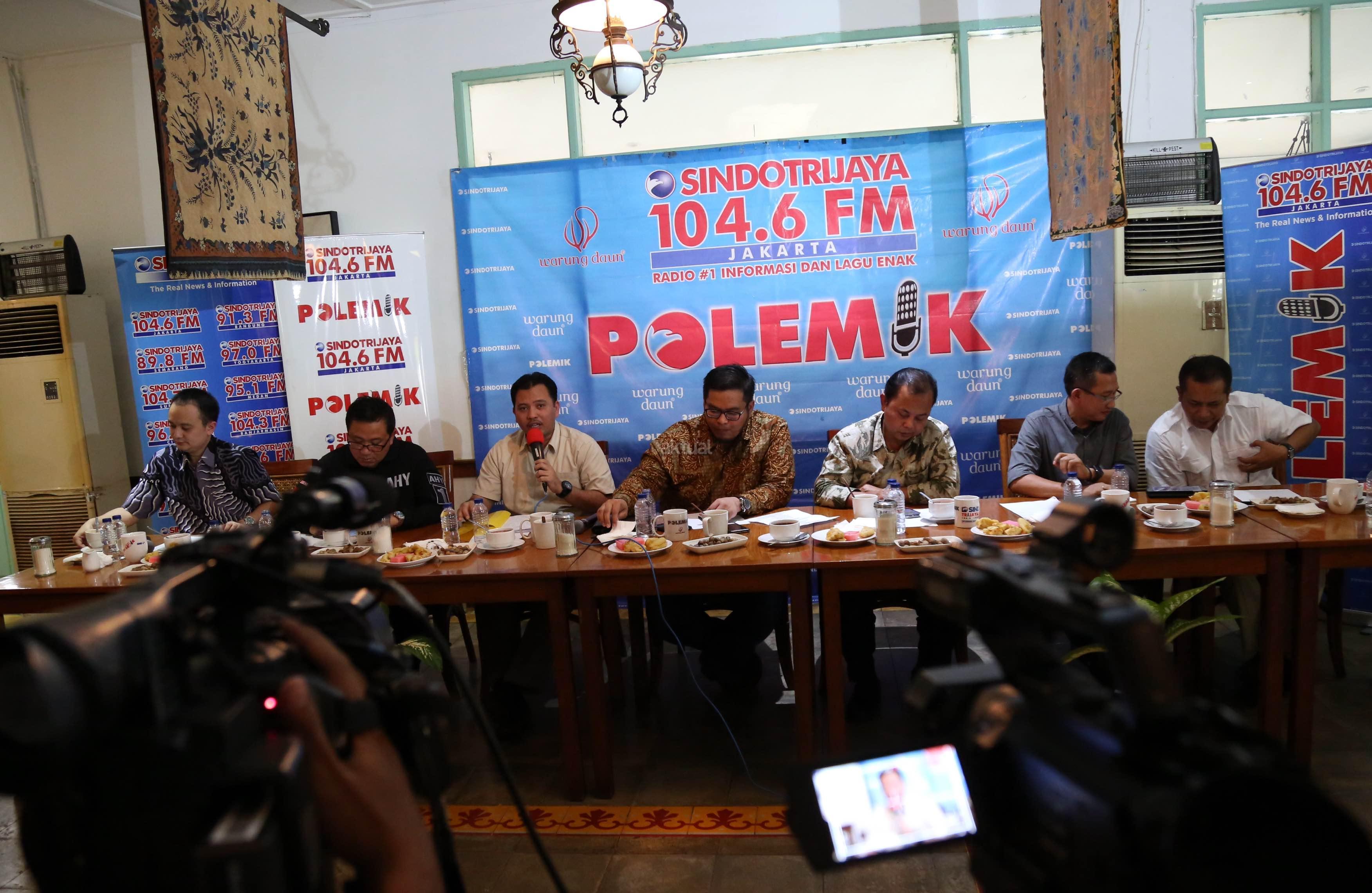 Dari kiri ke kanan, Tim Sukses Ahok-Djarot Jerry Sambuaga, Tim Sukses AHY-Silvy Didi Irawadi Syamsudin, Direktur Eksekutif Poltracking Hanta Yudha, Moderator Pangeran Ahmad Nurdin, Ketua KPUD DKI Jakarta Sumarno, Polmark Research Center Eep Saefulloh Fatah dan Tim Sukses Anies-Sandi Ferry Juliantono menjadi pembicara Polemik SindoTrijaya dengan tema “Antara Survey dan Realitas” di Jakarta, Sabtu (21/1). AKTUAL/Tino Oktaviano