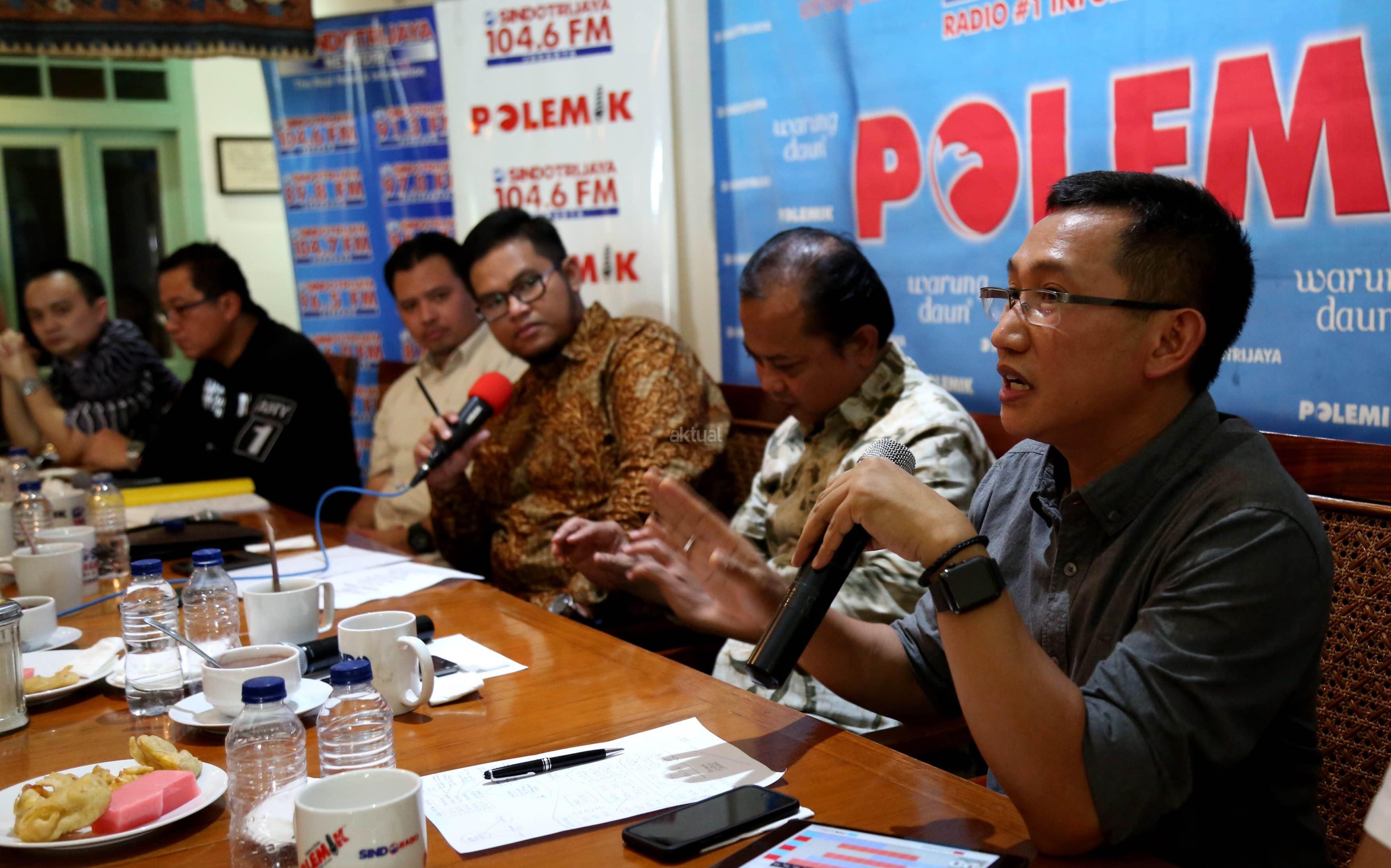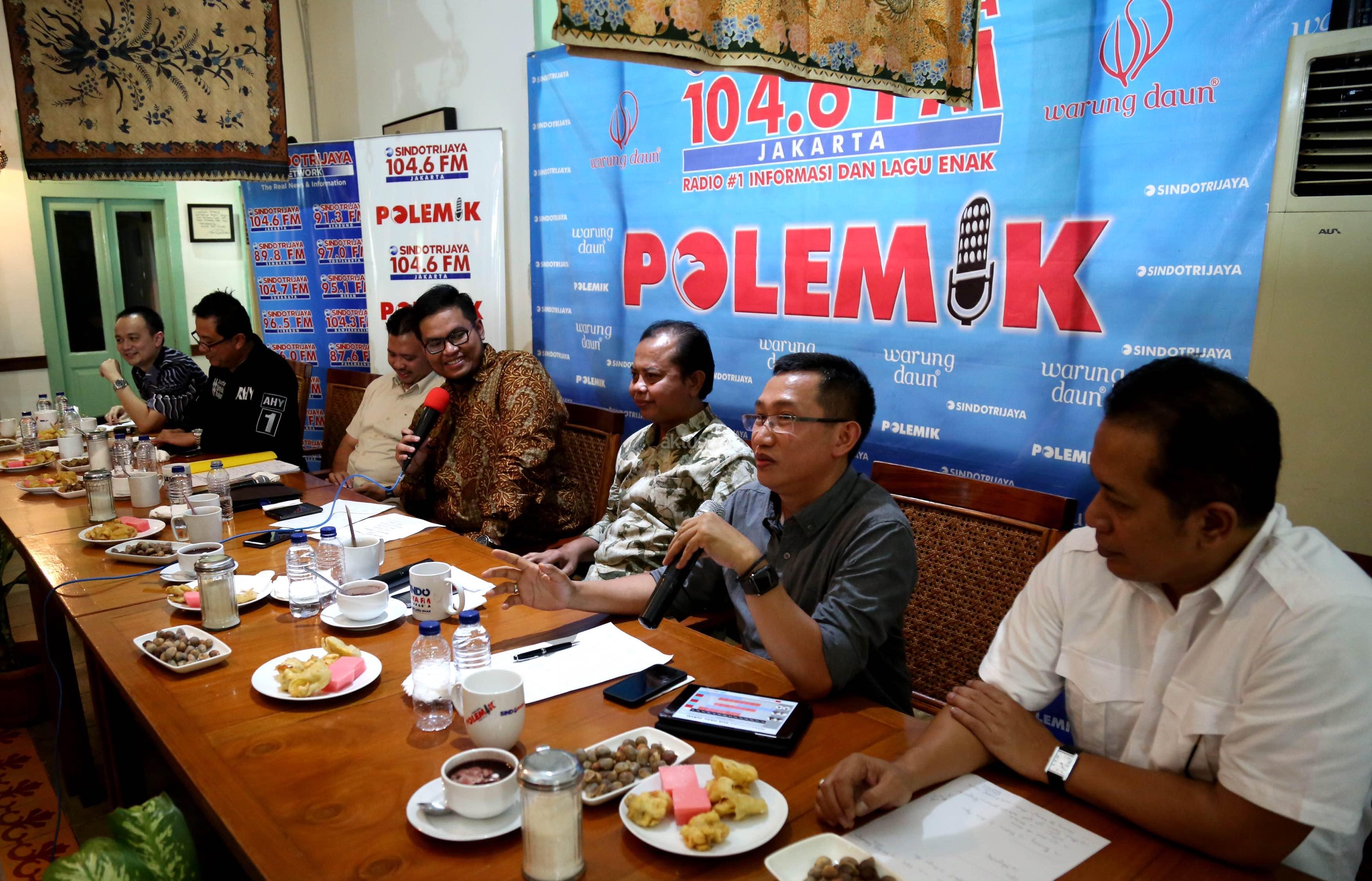 Dari kiri ke kanan, Tim Sukses Ahok-Djarot Jerry Sambuaga, Tim Sukses AHY-Silvy Didi Irawadi Syamsudin, Direktur Eksekutif Poltracking Hanta Yudha, Moderator Pangeran Ahmad Nurdin, Ketua KPUD DKI Jakarta Sumarno, Polmark Research Center Eep Saefulloh Fatah dan Tim Sukses Anies-Sandi Ferry Juliantono menjadi pembicara Polemik SindoTrijaya dengan tema "Antara Survey dan Realitas" di Jakarta, Sabtu (21/1). AKTUAL/Tino Oktaviano