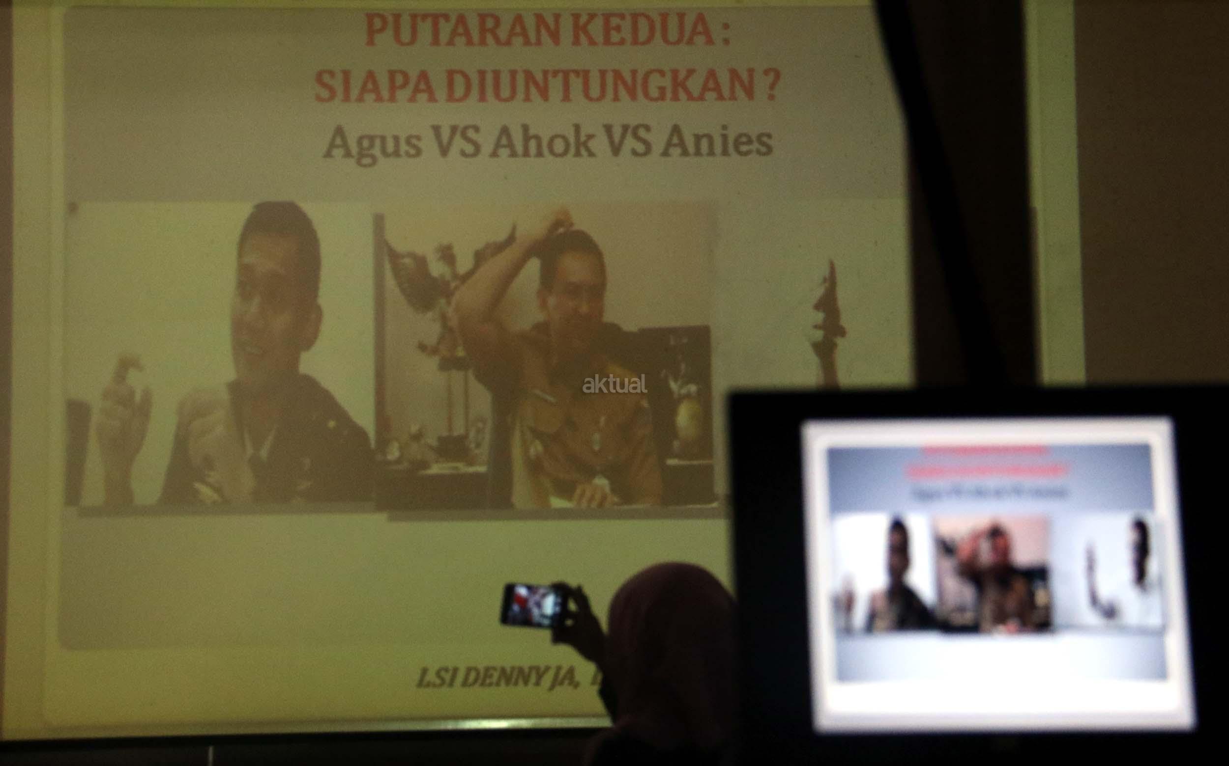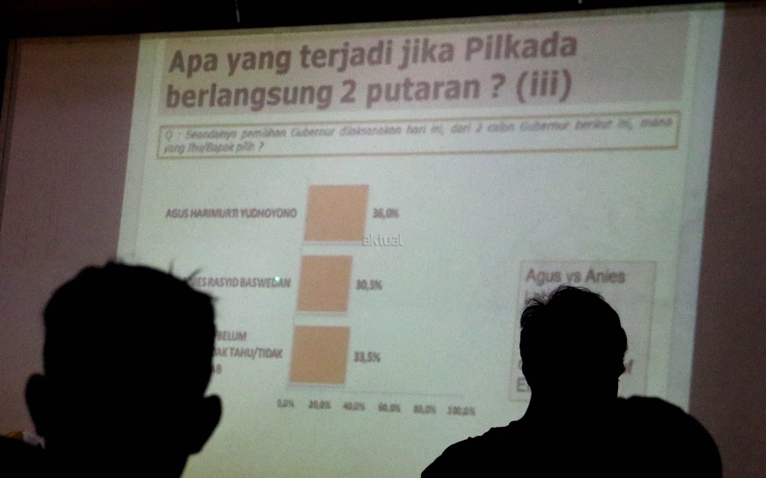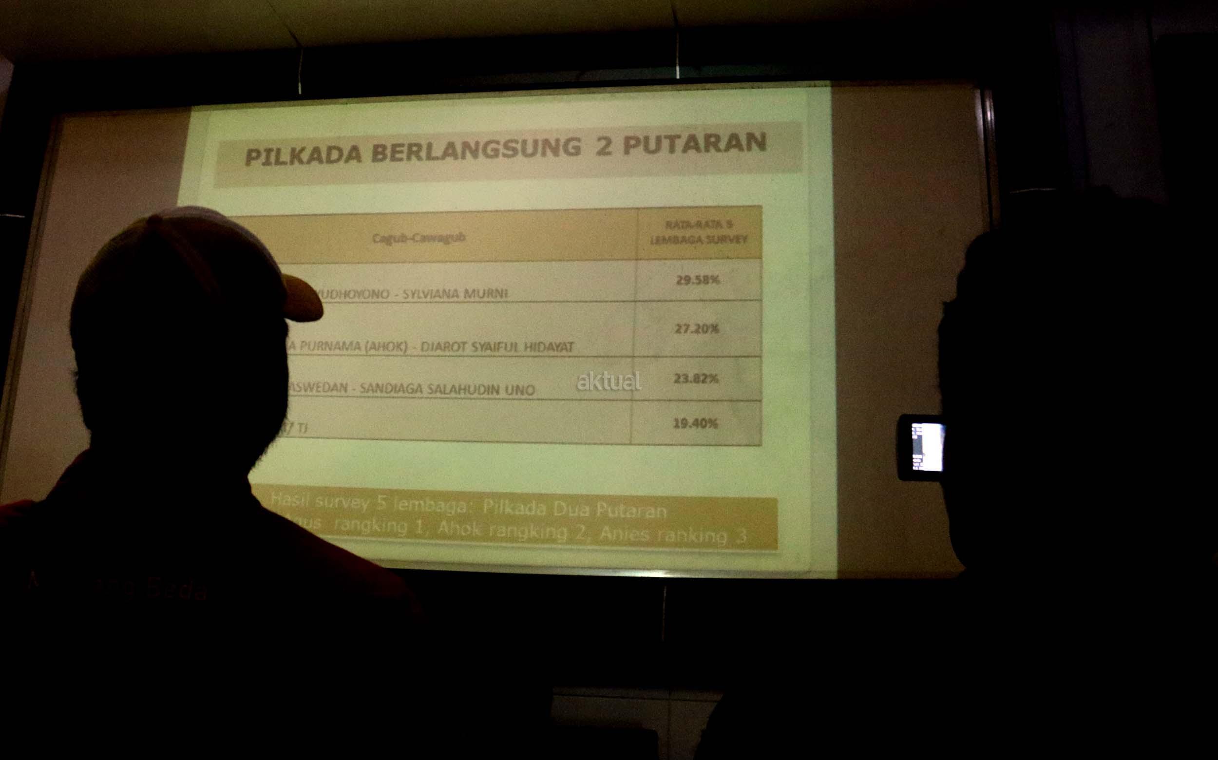 Menurut hasil survei LSI, "Jika putaran kedua dilangsungkan saat survey dilakukan, dan mempertemukan pasangan Agus-Sylvi dengan Ahok-Djarot, sekitar 46,1 persen suara memilih Agus-Sylvi, Ahok -Djarot kalah telak dengan perolehan suara hanya 29,1 persen dan jika yang lolos putaran kedua Ahok vs Anies, Ahok meraih 27.6 persen, Anies 45. maka Ahok-Djarot akan kalah telak. AKTUAL/Munzir