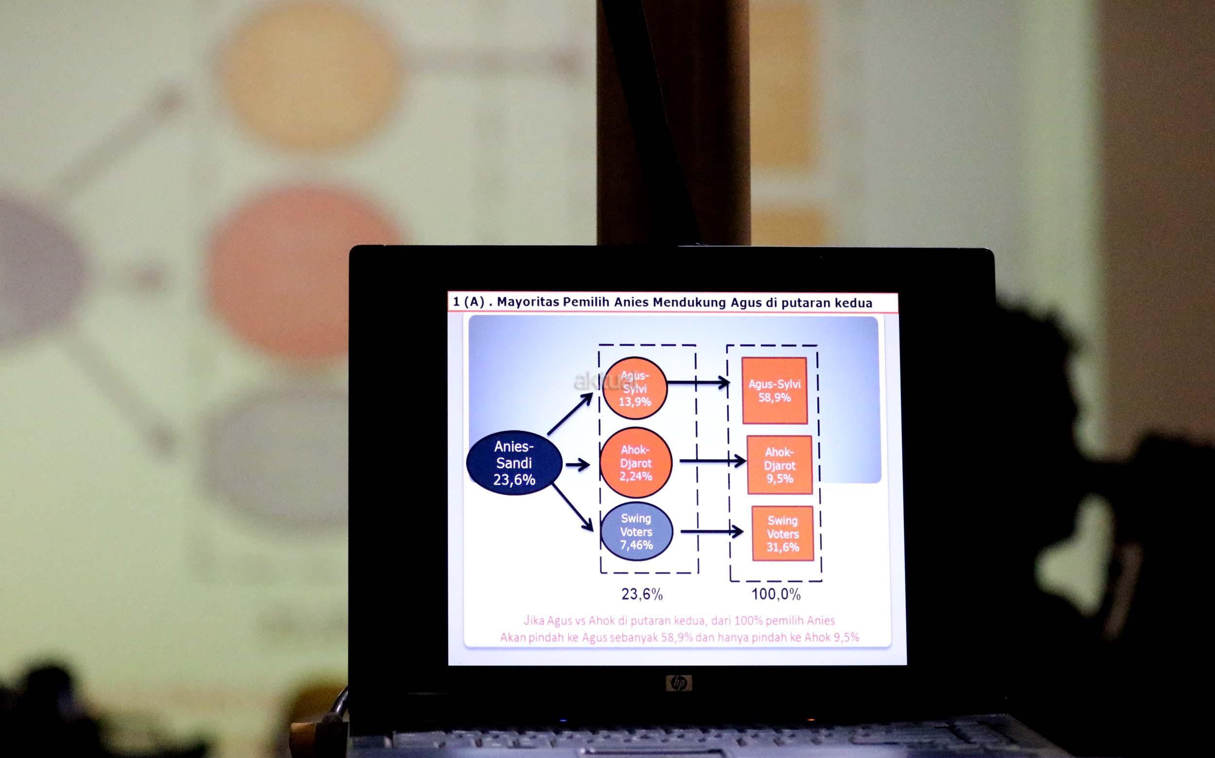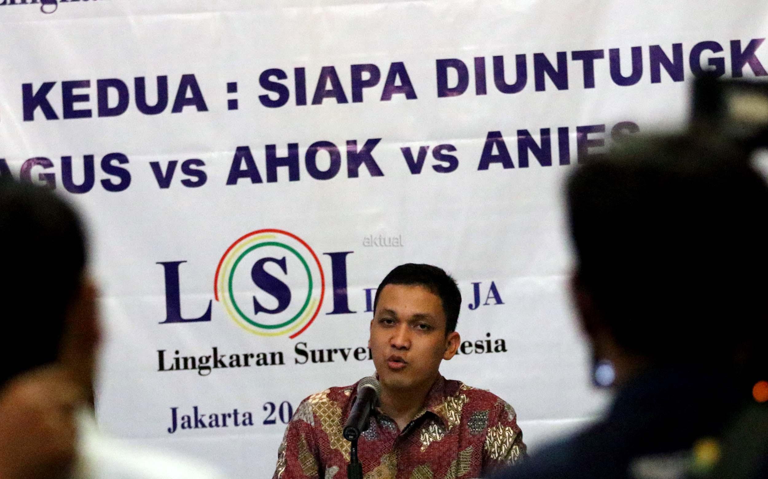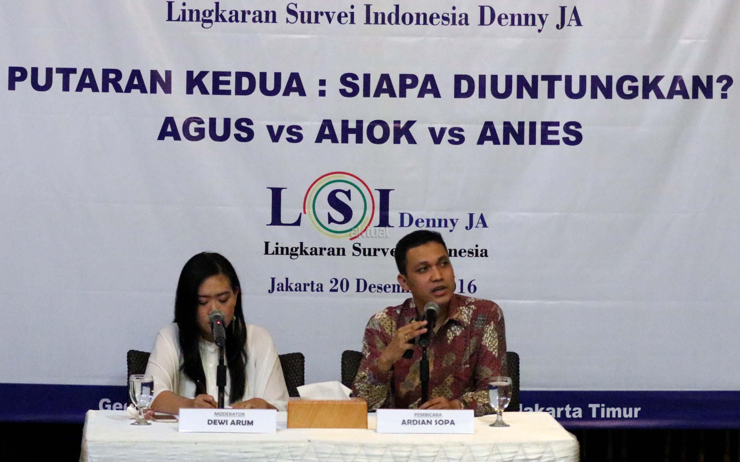Menurut hasil survei LSI, "Jika putaran kedua dilangsungkan saat survey dilakukan, dan mempertemukan pasangan Agus-Sylvi dengan Ahok-Djarot, sekitar 46,1 persen suara memilih Agus-Sylvi, Ahok -Djarot kalah telak dengan perolehan suara hanya 29,1 persen dan jika yang lolos putaran kedua Ahok vs Anies, Ahok meraih 27.6 persen, Anies 45. maka Ahok-Djarot akan kalah telak. AKTUAL/Munzir