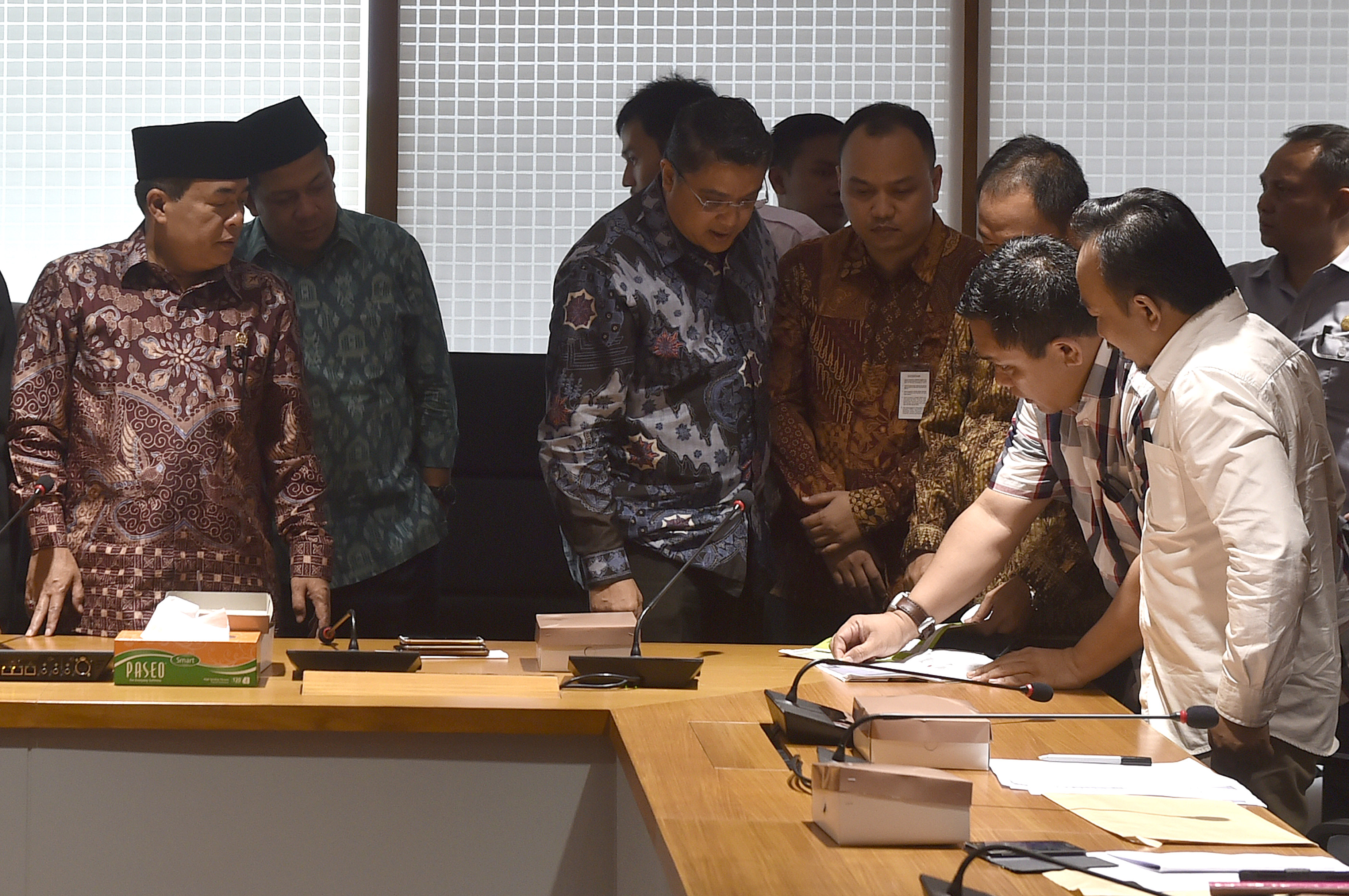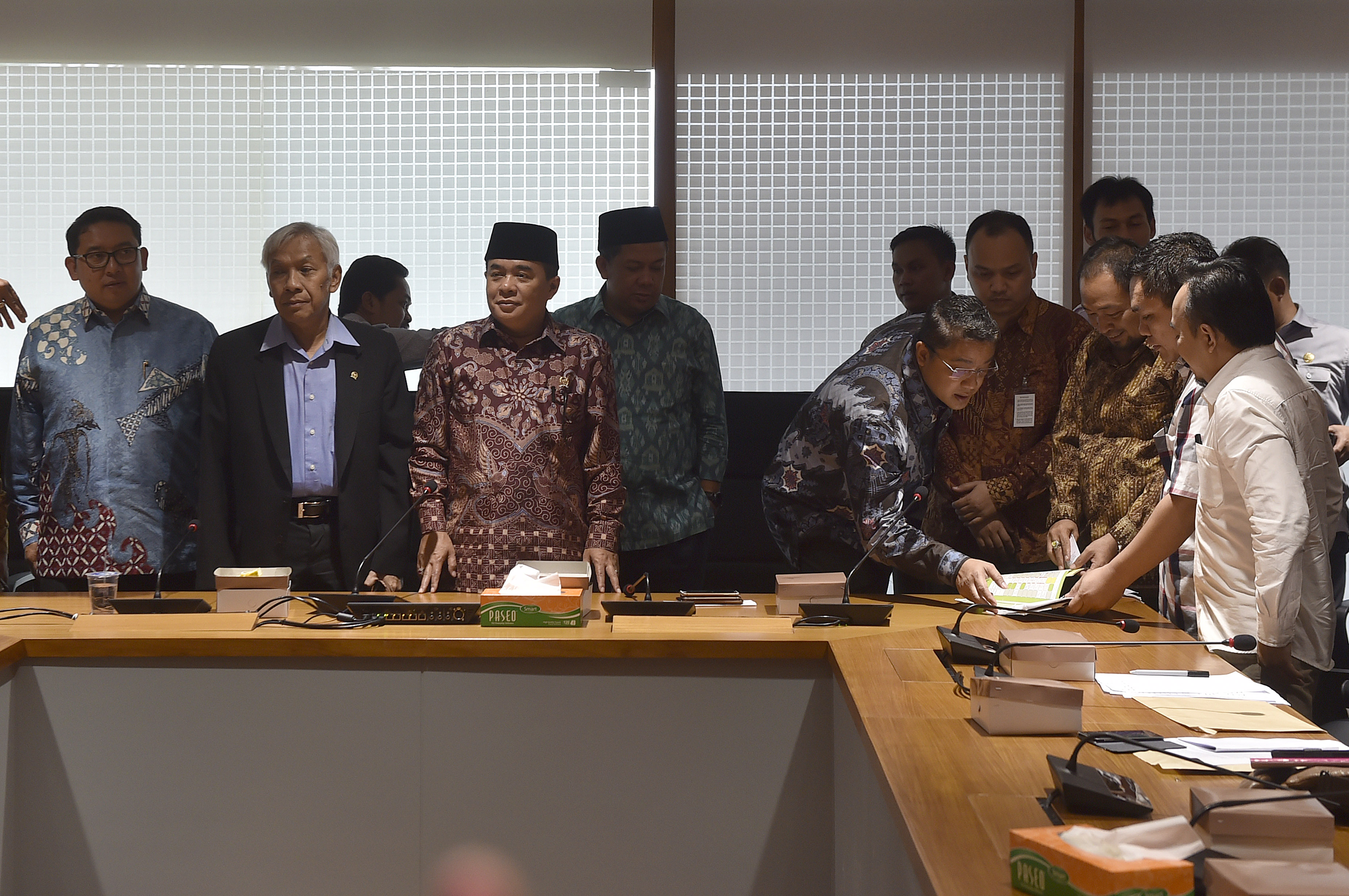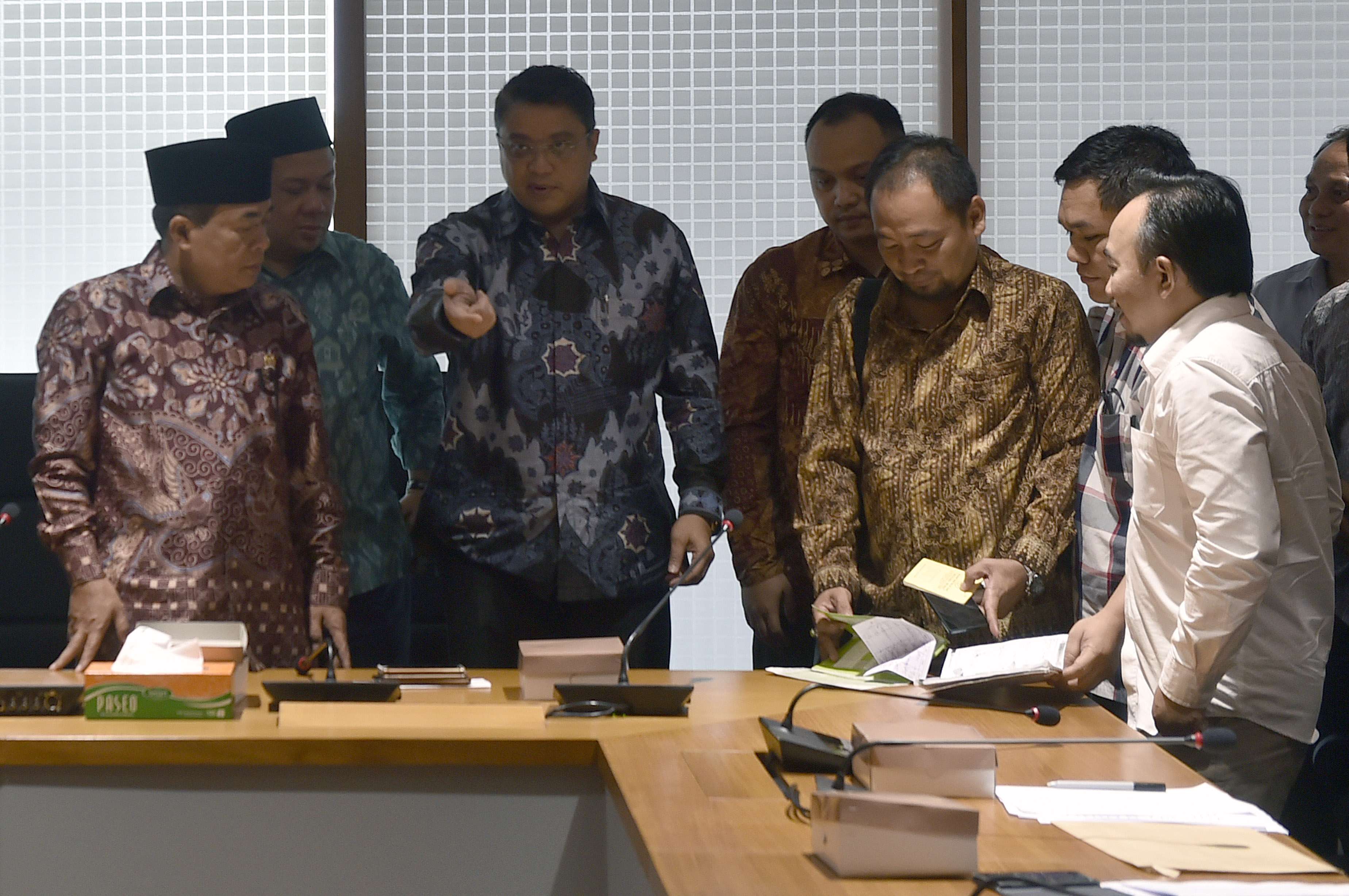 Ketua DPR Ade Komarudin (ketiga kiri) didampingi Wakil Ketua DPR Fadli Zon (kiri), Agus Hermanto (kedua kiri), Fahri Hamzah (keempat kiri), Ketua Komisi IX Dede Yusuf menerima perwakilan orang tua korban vaksin palsu dari Rumah Sakit Harapan Bunda Jakarta dan RSIA Mutiara Bunda Tangerang di Komplek Parlemen Senayan, Jakarta, Selasa (19/7). Pimpinan DPR akan membentuk Pansus Pengawasan Obat dan Vaksin Palsu, serta mendorong Kementerian Kesehatan RI untuk membuat Crisis Center terkait peredaran korban vaksin palsu. ANTARA FOTO/Puspa Perwitasari/foc/16.