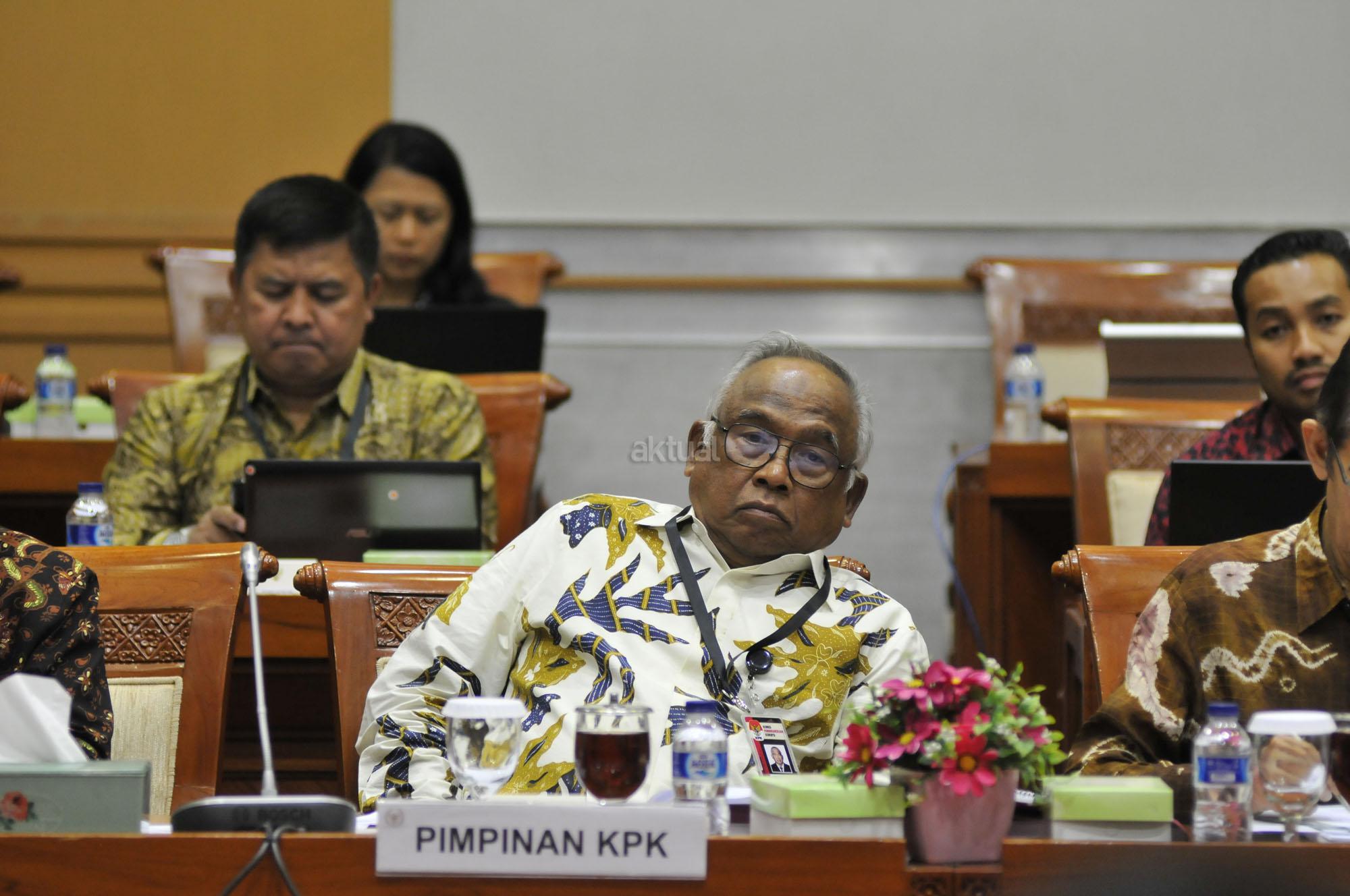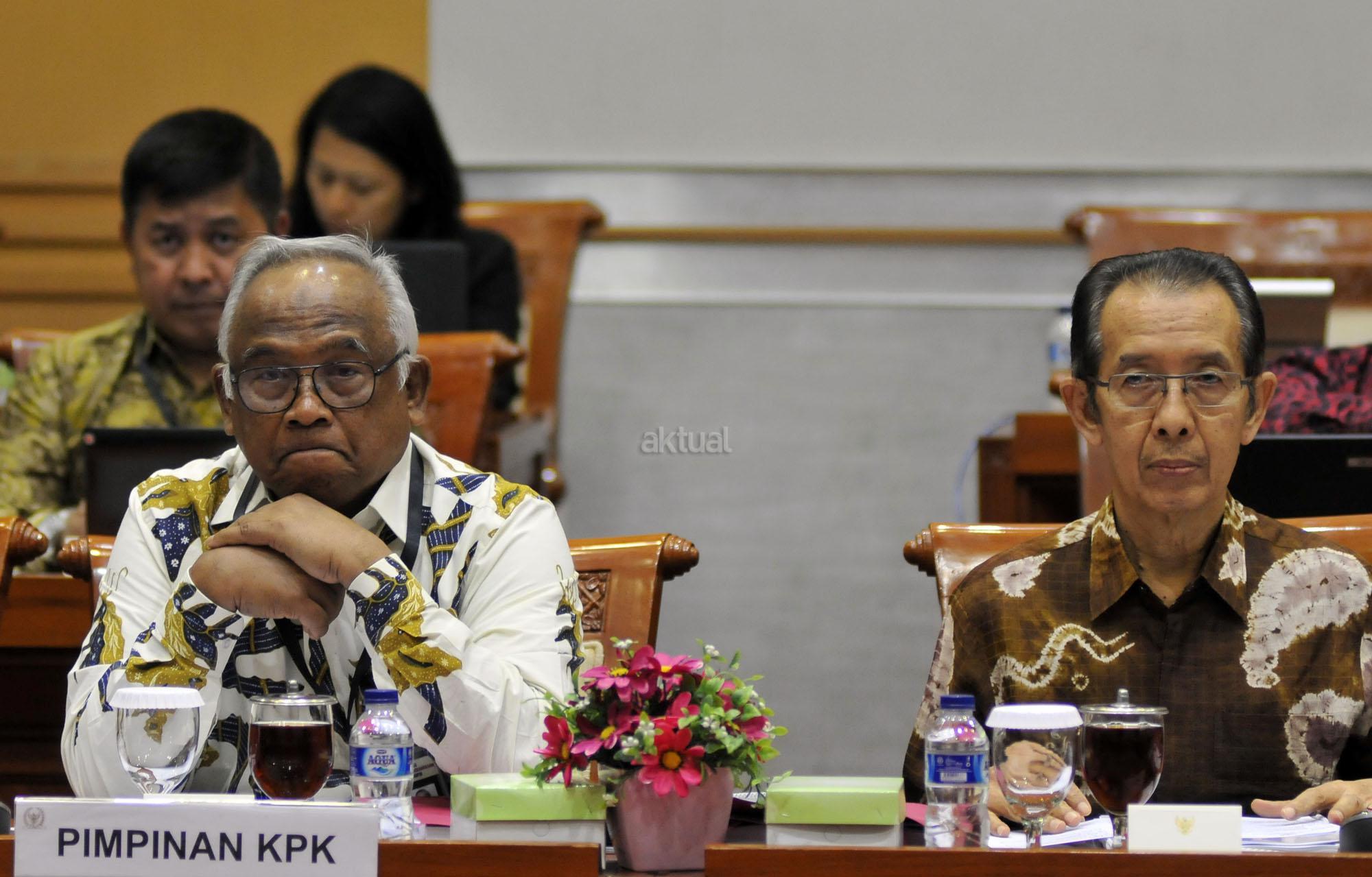 Plt Ketua KPK Taufiequrrahman Ruki (kedua kiri) bersama Wakil Ketua Zulkarnaen (kedua kanan) dan jajarannya mengikuti rapat dengar pendapat dengan Komisi III DPR di Kompleks Parlemen, Senayan, Jakarta, Kamis (19/11/2015). Rapat itu membahas tentang masukan dari KPK mengenai revisi KUHP.