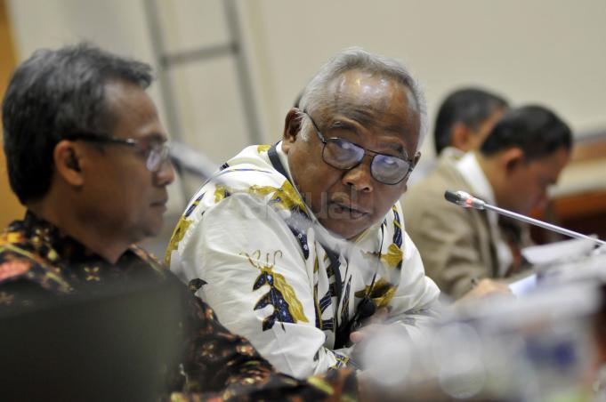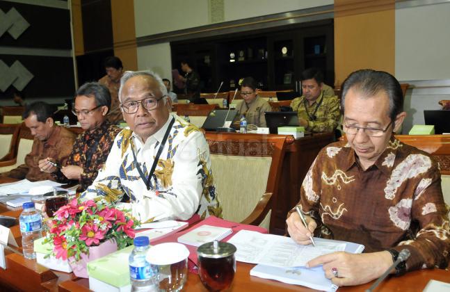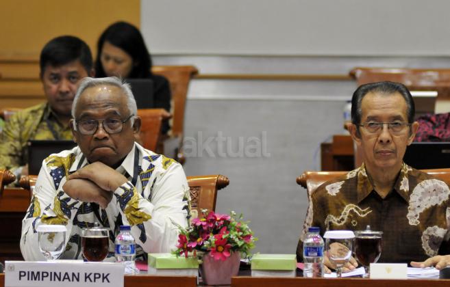 Plt Ketua KPK Taufiequrrahman Ruki (kiri) bersama Wakil Ketua Zulkarnaen (kanan) dan jajarannya mengikuti rapat dengar pendapat dengan Komisi III DPR di Kompleks Parlemen, Senayan, Jakarta, Kamis (19/11/2015). Rapat itu membahas tentang masukan dari KPK mengenai revisi KUHP.