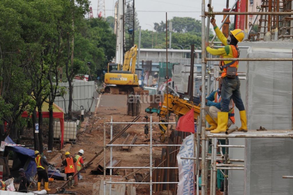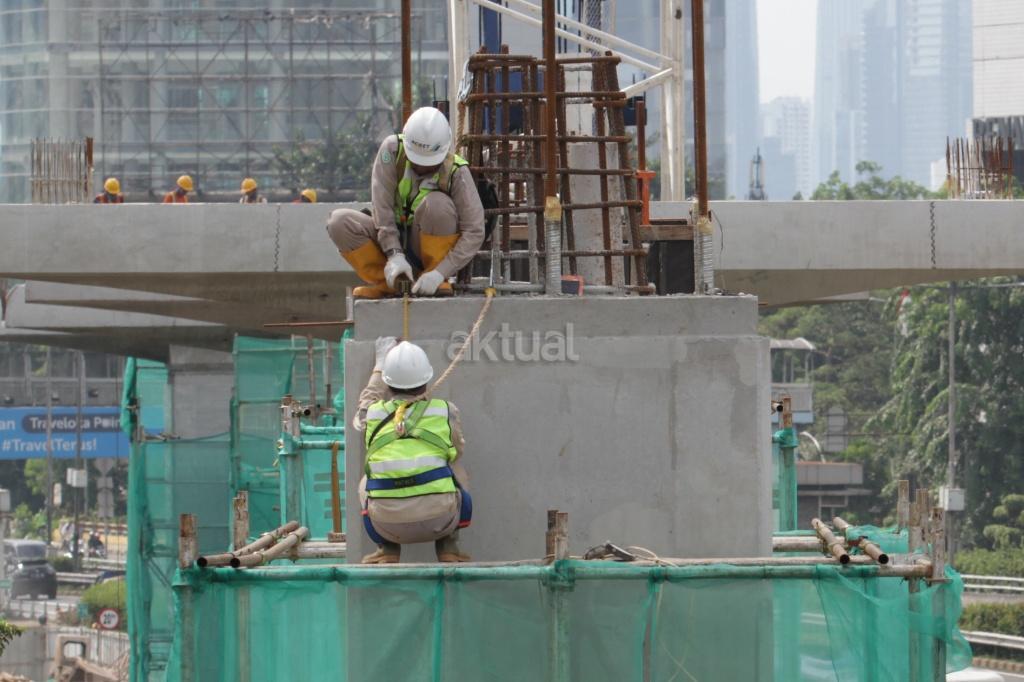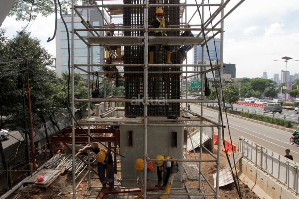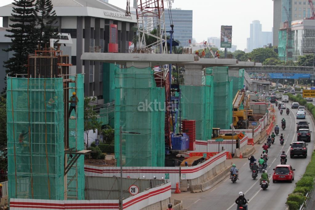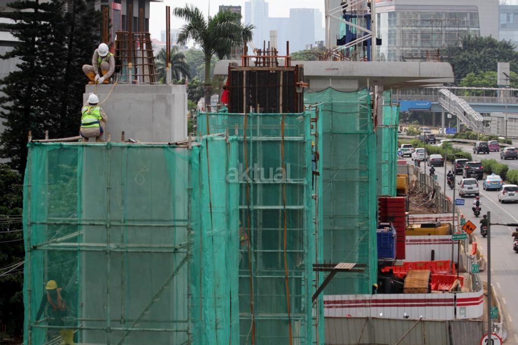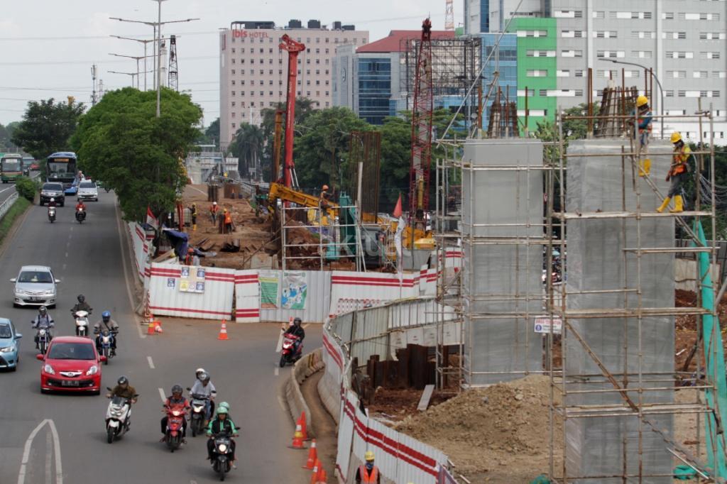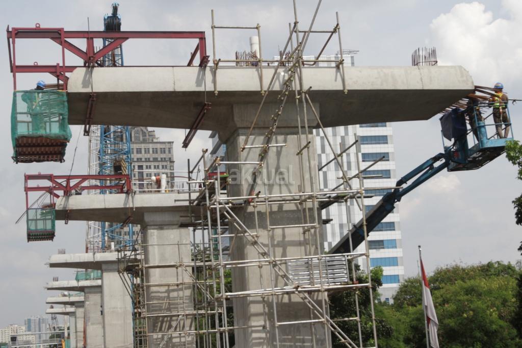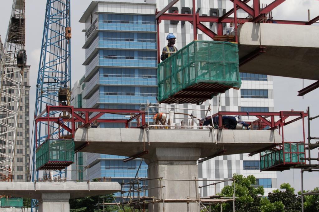 Pekerja menyelesaikan proyek Light Rail Transit (LRT) di jalan MT Haryono, Jakarta, Kamis (23/11/2017). Proyek LRT tahap I direncanakan selesai pada 2018. Mengenai pembiayaan, sejumlah bank BUMN ditugaskan mendanai pembiayaan proyek ini sebesar Rp 18 triliun. Saat ini progres pembangunan LRT Jabodebek tahap I sudah mencapai 30 persen saat ini. AKTUAL/ Tino Oktaviano