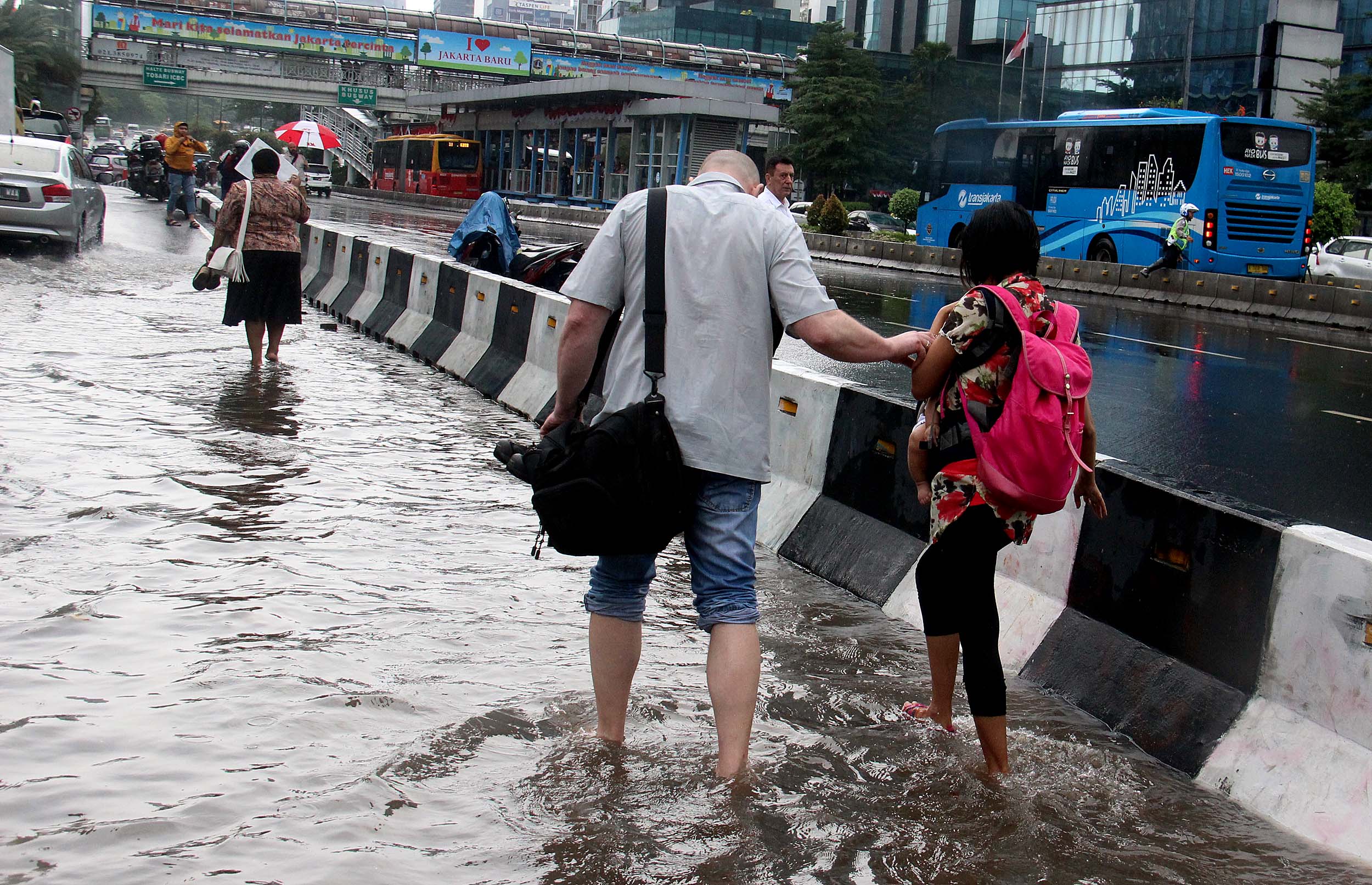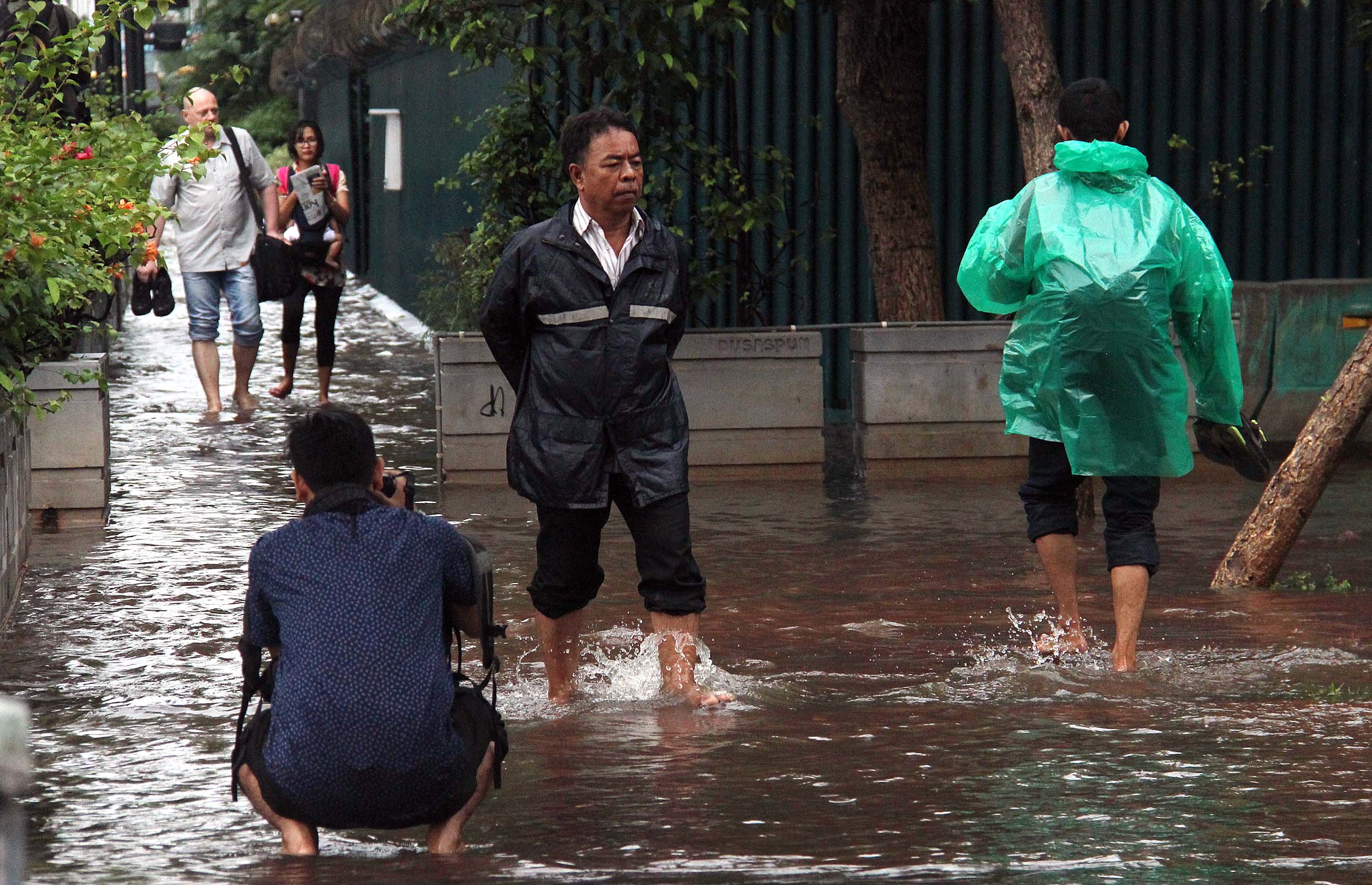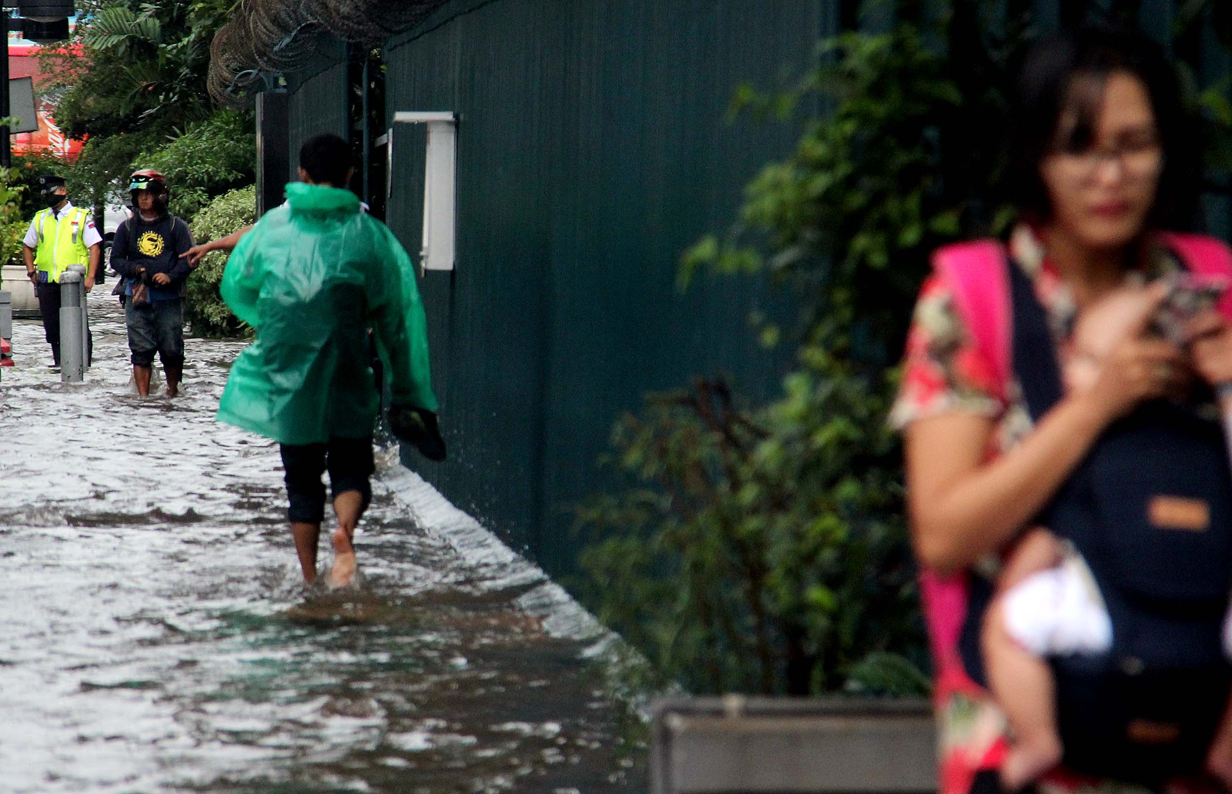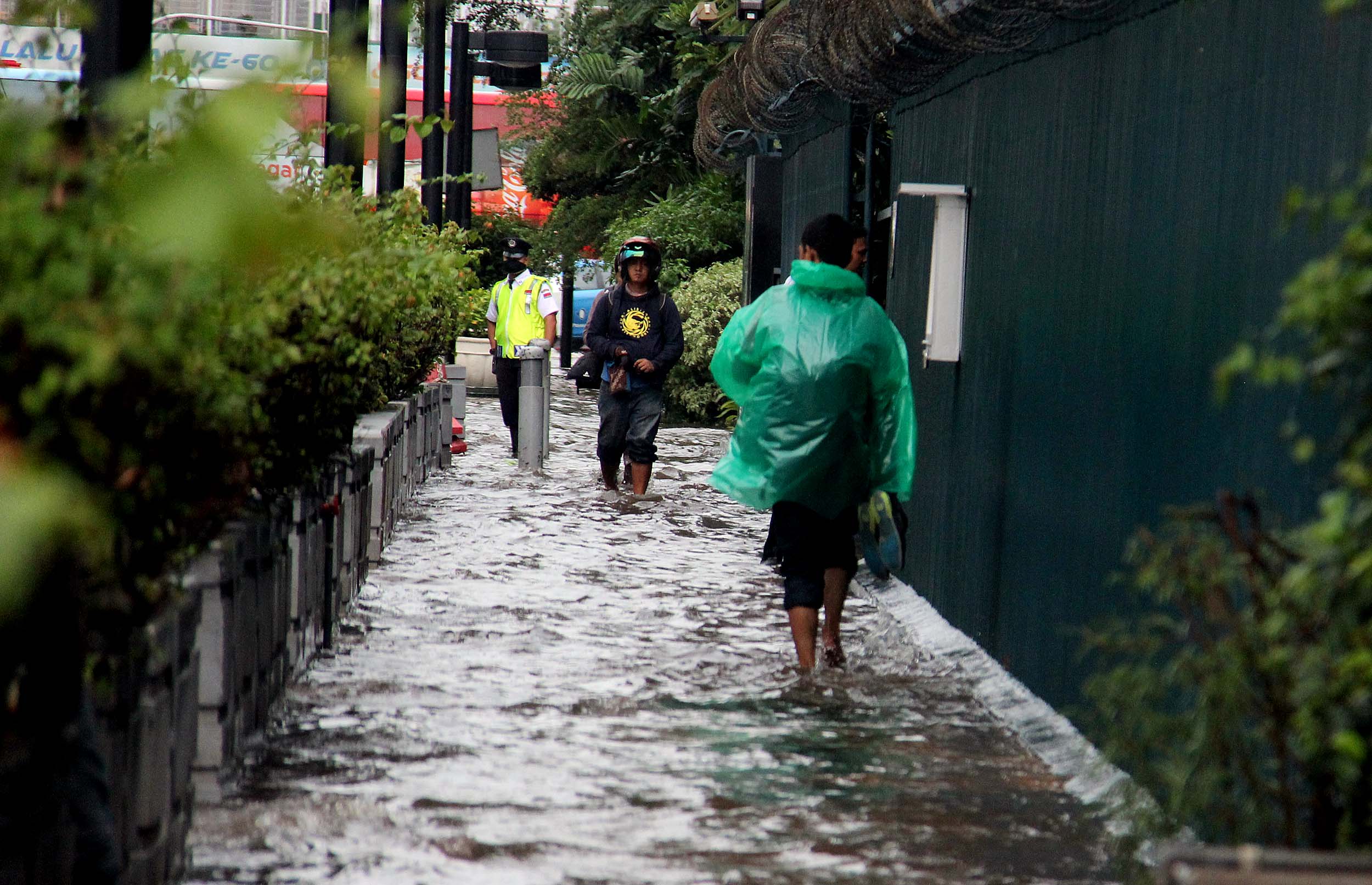 Sejumlah warga menerobos banjir yang menggenangi trotoar Kedutaan Besar Jerman Jalan. Jenderal Sudirman, Jakarta Pusat, Selasa (30/8/2016). Sebagian wilayah DKI Jakarta siang ini diguyur hujan lebat yang disertai badai. Akibatnya, sejumlah ruas jalan padat dan terjadi antrean kendaraan. Namun sekitar pukul 13.00 WIB, hujan di sebagian wilayah Ibu Kota mulai mereda.
