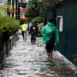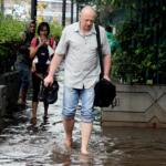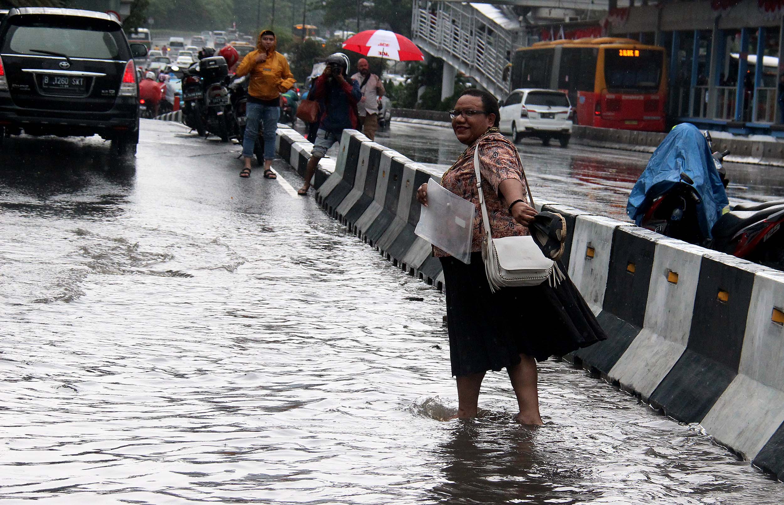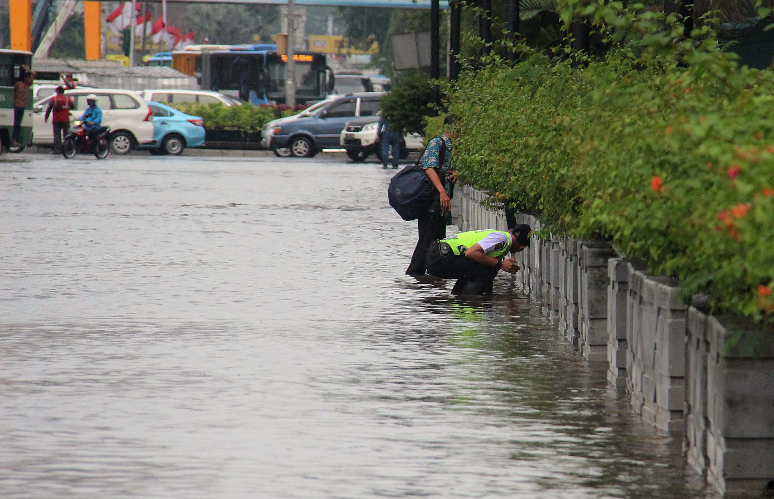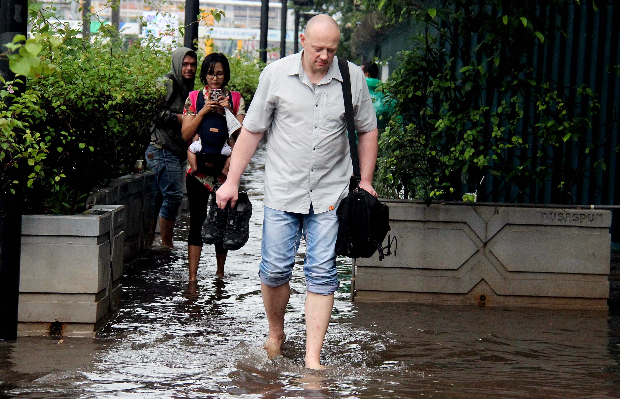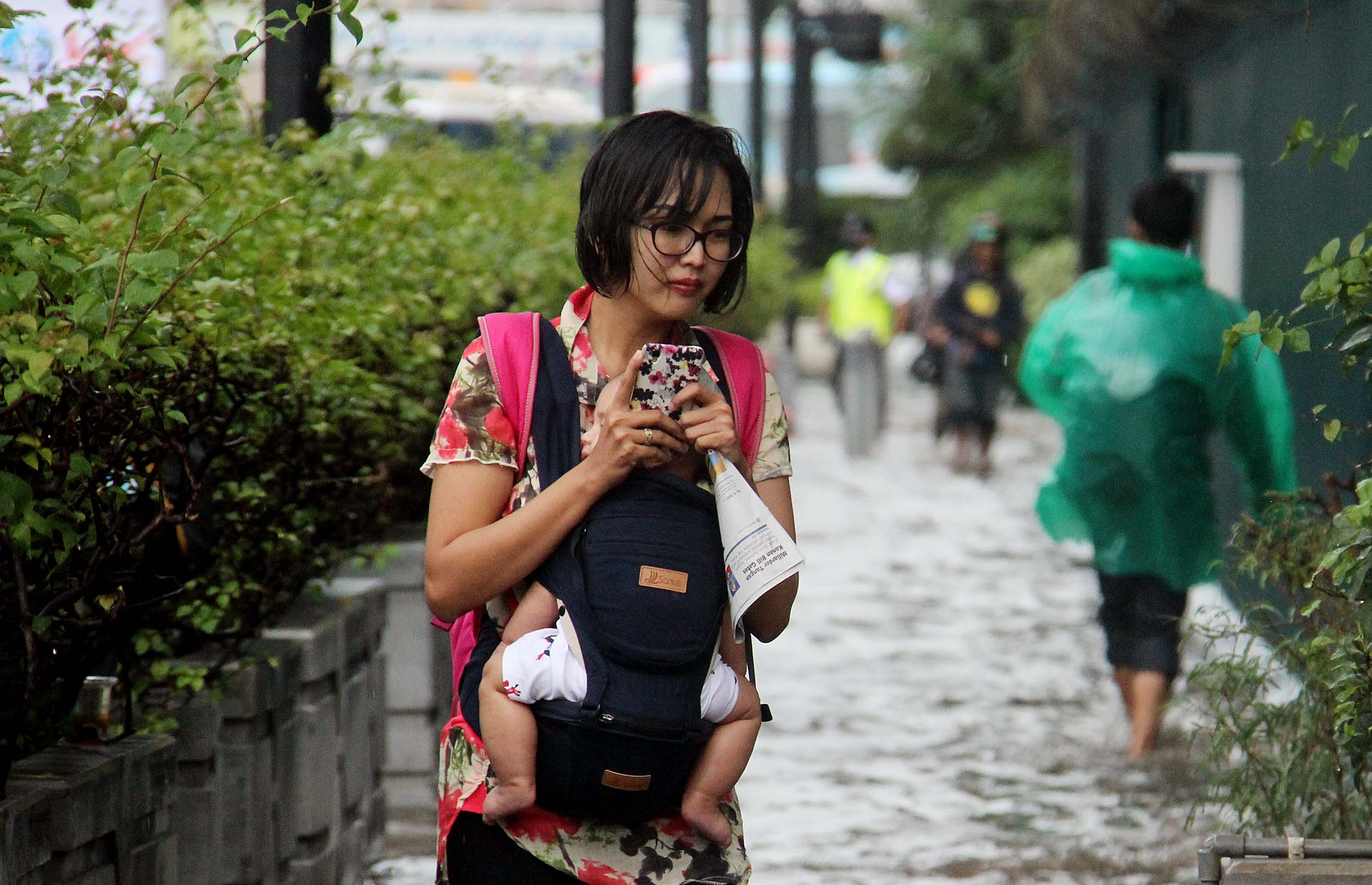 Sejumlah warga menerobos banjir yang menggenangi trotoar Kedutaan Besar Jerman Jalan. Jenderal Sudirman, Jakarta Pusat, Selasa (30/8/2016). Sebagian wilayah DKI Jakarta siang ini diguyur hujan lebat yang disertai badai. Akibatnya, sejumlah ruas jalan padat dan terjadi antrean kendaraan. Namun sekitar pukul 13.00 WIB, hujan di sebagian wilayah Ibu Kota mulai mereda.