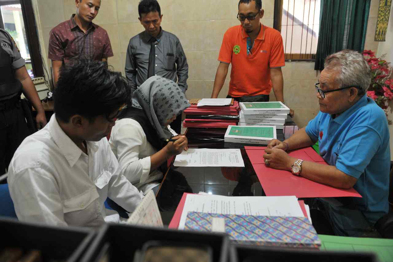 Petugas pengadilan menerima pengajuan permohonan Peninjauan Kembali (PK) pasangan suami istri terpidana mati, Heru Hendriyanto (kiri) dan Putu Anita Sukra Dewi (kedua kiri) di Pengadilan Negeri Denpasar, Jumat (29/7). Pasangan suami istri tersebut sebelumnya divonis hukuman mati oleh Pengadilan Negeri Denpasar hingga di tingkat Mahkamah Agung karena kasus pembunuhan berencana terhadap satu keluarga di Bali tahun 2012. ANTARA FOTO/Nyoman Budhiana/pd/16.
