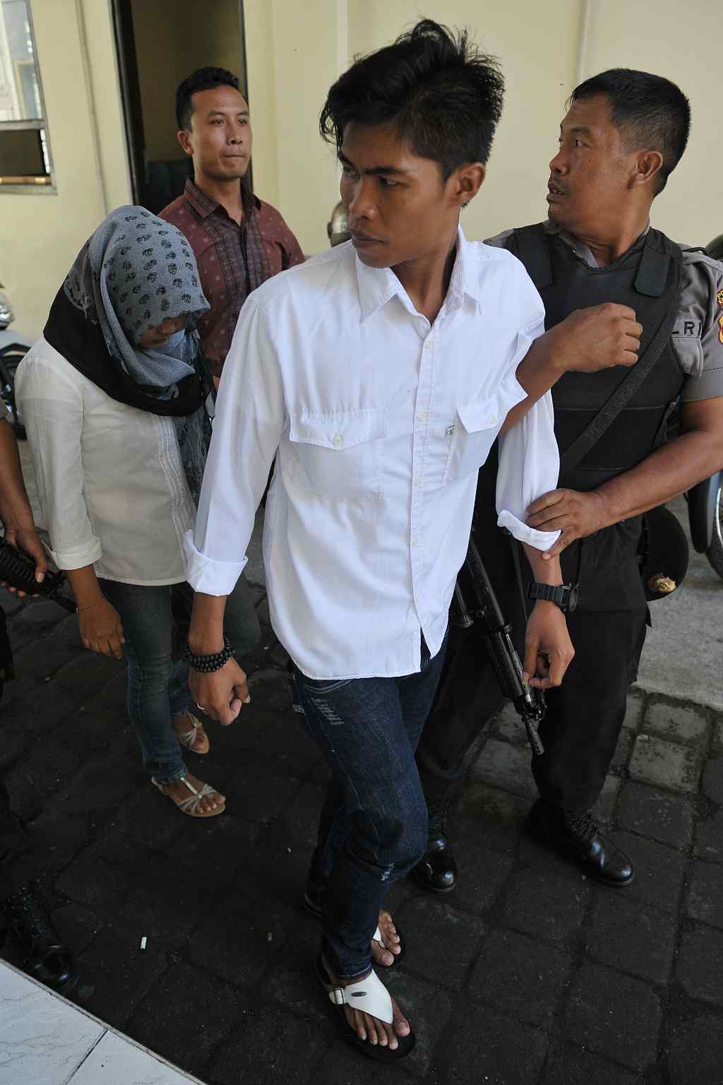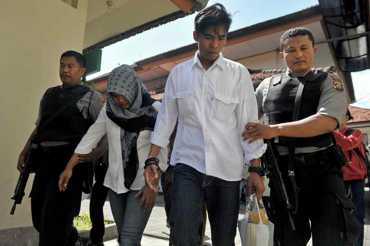 Polisi mengawal pasangan suami istri terpidana mati, Heru Hendriyanto (kedua kanan) dan Putu Anita Sukra Dewi (kiri) saat mengajukan permohonan peninjauan kembali (PK) di Pengadilan Negeri Denpasar, Jumat (29/7). Pasangan suami istri tersebut sebelumnya divonis hukuman mati oleh Pengadilan Negeri Denpasar hingga di tingkat Mahkamah Agung karena kasus pembunuhan berencana terhadap satu keluarga di Bali tahun 2012. ANTARA FOTO/Nyoman Budhiana/pd/16.