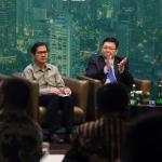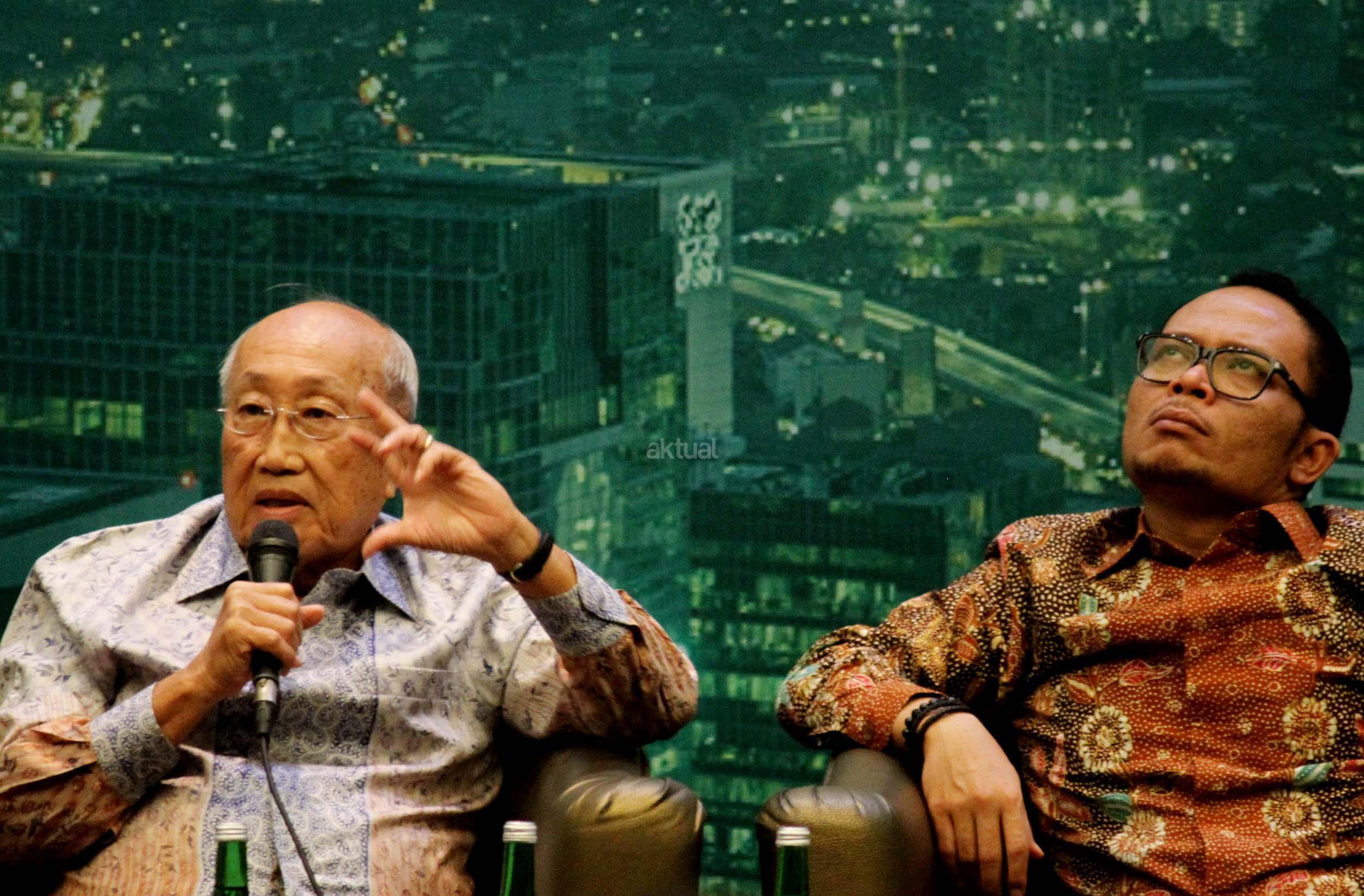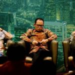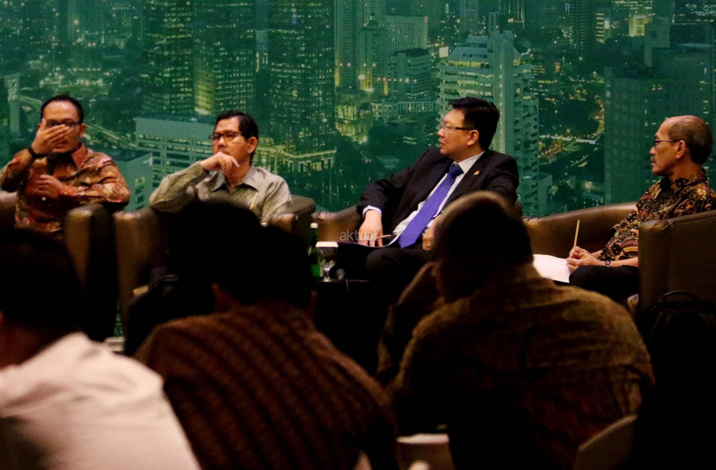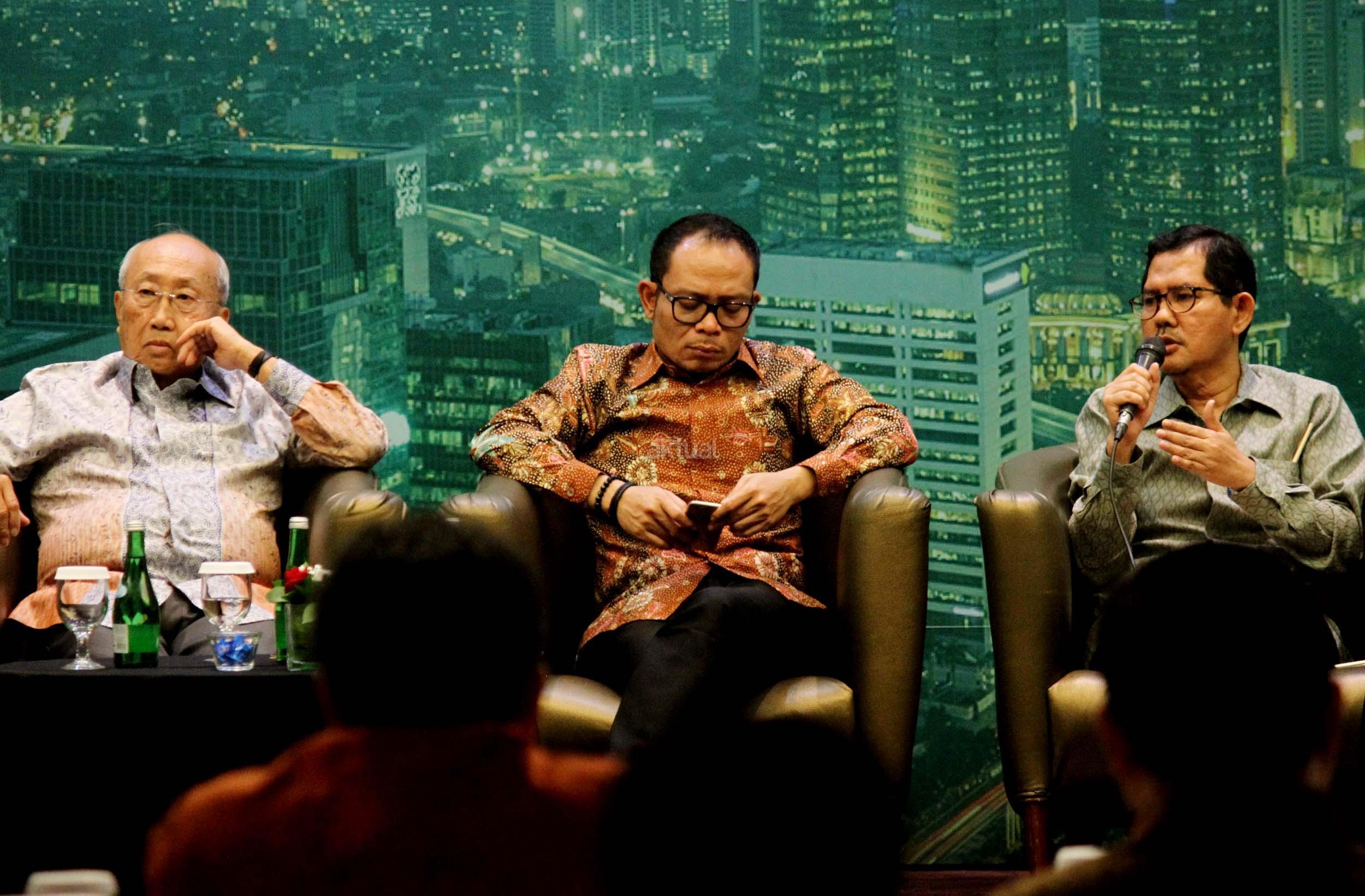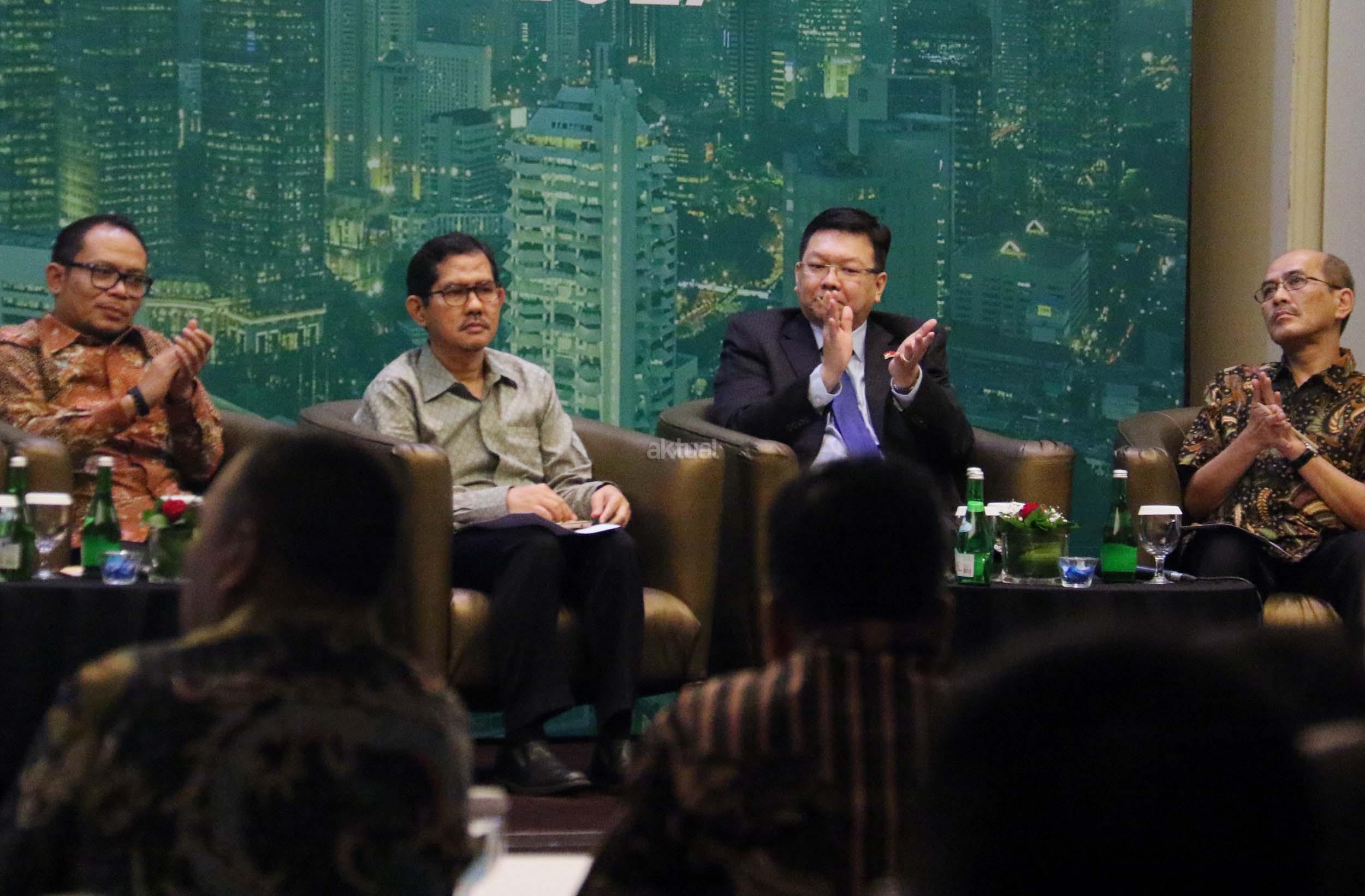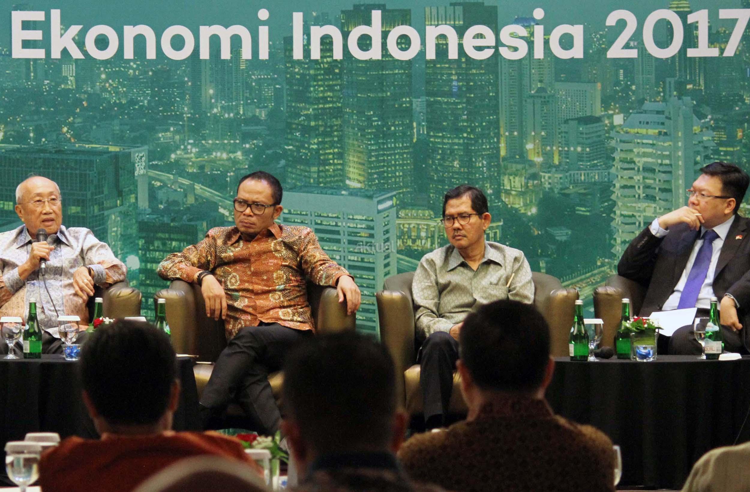 (ki-ka), Staf Ahli Wapres Sofjan Wanandi, Menaker Hanif Dhakiri, Staf Ahli Menko Perekonomian Bobby Hamzar Rafinus, Kadin Indonesia di Tiongkok, Liky Sutikno, dan pakar ekonomi Faisal Bahri hadir dalam diskusi di Jakarta, Senin (23/1/2017). Diskusi yang diselenggarakan oleh Partai Kebangkitan Bangsa (PKB) dengna tema SARA, Radikalisme dan Prospek Ekonomi Indonesia 2017.
