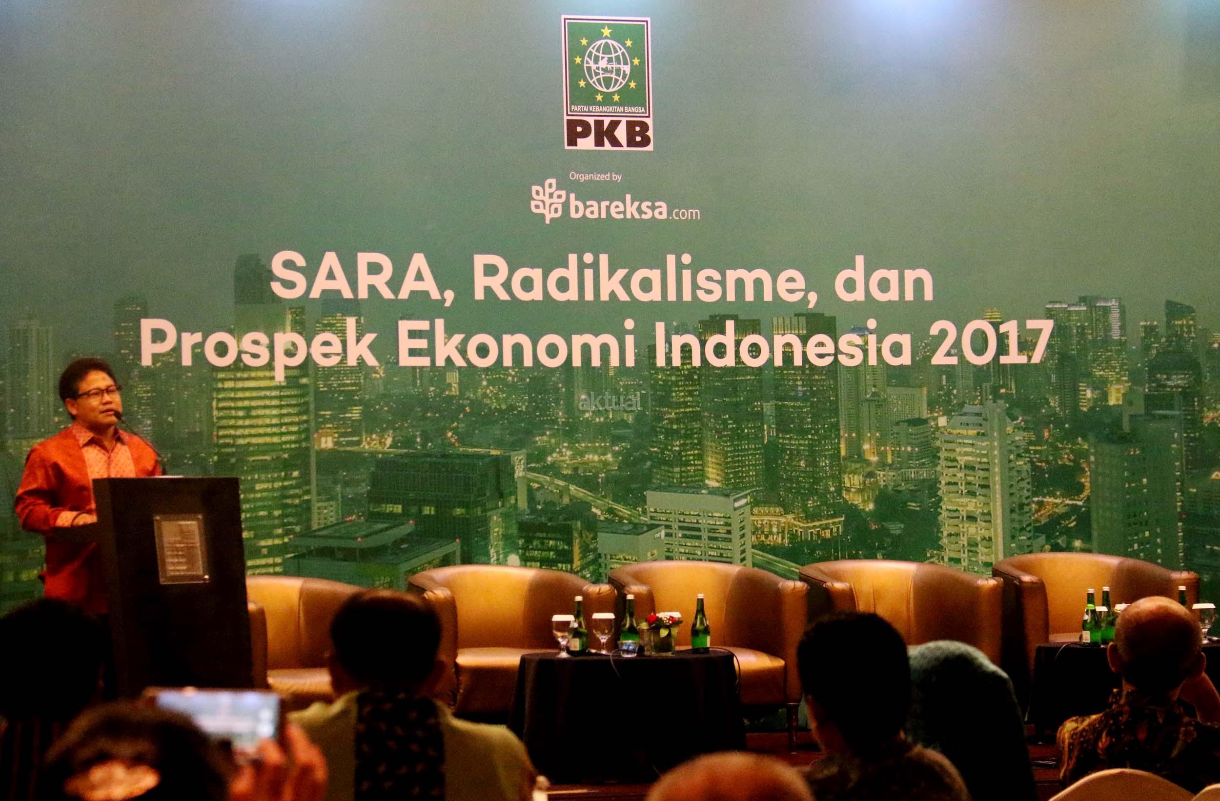 Ketua Umum DPP PKB Muhaimin Iskandar saat memberikan pidatonya dan sekaligus membuka diskusi SARA, Radikalisme dan Prospek Ekonomi Indonesia 2017, di Jakarta, Senin (23/1/2017). Diskusi yang diselenggarakan oleh Partai Kebangkitan Bangsa (PKB) dengna tema SARA, Radikalisme dan Prospek Ekonomi Indonesia 2017.