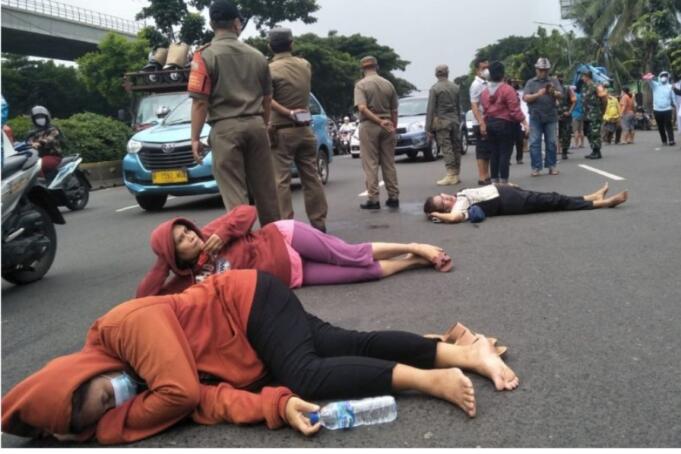 Jakarta, aktual.com – Puluhan pedagang kaki lima (PKL) yang berjualan di depan Rumah Sakit Umum Universitas Kristen Indonesia (UKI), Jakarta Timur, tiduran di jalan raya sebagai bentuk protes terhadap petugas yang melakukan penertiban.
