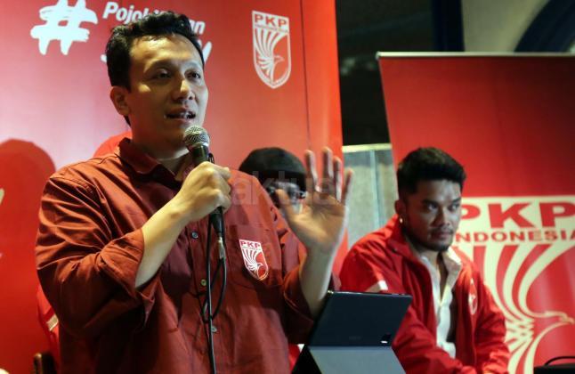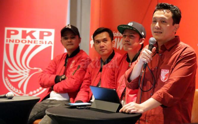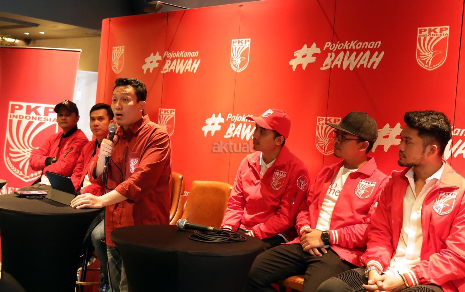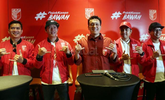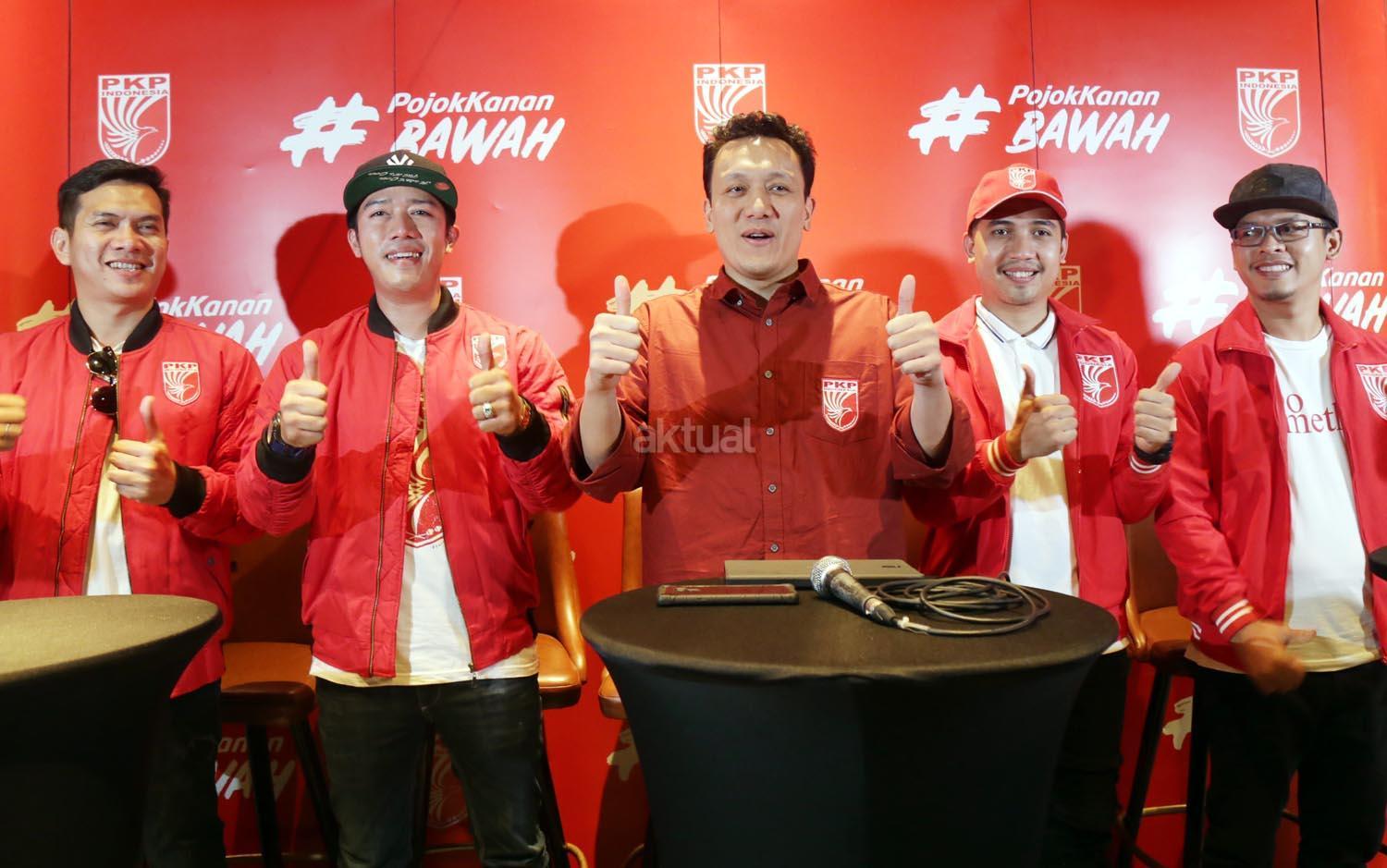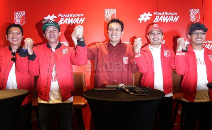 Ketua Umum PKPI Diaz Hendropriyono bersama band Repvblik saat mendeklarasikan dukungan terhadap pasangan calon presiden dan wakil presiden nomor urut 01 Joko Widodo-Ma'aruf Amin, di Libris Cafe, Jakarta, Kamis (4/4). Dalam konferensi pers tersebut, PKPI juga merilis single berjudul Jokowi Pilihan Kita yang dibawakan oleh band Repvblik. Video klip single yang tayang perdana pada konferensi pers ini turut menampilkan Diaz sebagai gitaris. Sebagai info, Repvblik sendiri telah menjadi kader PKPI semenjak Januari 2019. AKTUAL/Tino Oktaviano