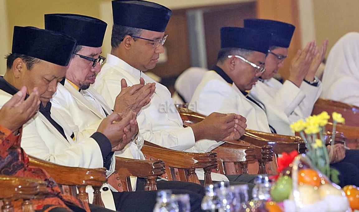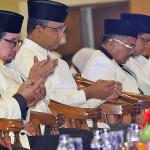 Dari kiri ke kanan, Wakil Ketua Majelis Syuro Partai Keadilan Sejahtera (PKS) Hidayat Nur Wahid, Ketua Majelis Syuro PKS Salim Segaf Al -Jufri, Calon Gubernur DKI Jakarta Anies Baswedan, Presiden PKS Mohamad Sohibul Iman dan Sekjen PKS Mustafa Kamal saat berdoa dalam acara Pembukaan Rakornas PKS 2017 di Depok, Jawa Barat, Senin (6/3). Acara Rakornas PKS 2017 akan berlangsung hingga hari Rabu (8/3) mengambil tema besar, ‘Kokoh Berkhidmat untuk Rakyat”. AKTUAL/Humas DPP PKS