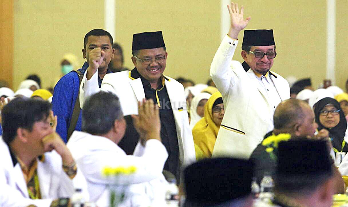 Ketua Majelis Syuro Partai Keadilan Sejahtera (PKS) Salim Segaf Al-Jufri (kanan) dan Presiden PKS Mohamad Sohibul Iman disambut peserta saat memasuki arena Pembukaan Rakornas PKS 2017 di Depok, Jawa Barat, Senin (6/3). Acara Rakornas PKS 2017 akan berlangsung hingga hari Rabu (8/3) mengambil tema besar, ‘Kokoh Berkhidmat untuk Rakyat”. AKTUAL/Humas DPP PKS