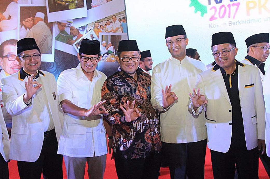 Dari kir ke kanan, Sekjen Partai Keadilan Sejahtera (PKS) Mustafa Kamal, Calon Wakil Gubernur DKI Jakarta Sandiaga Uno, Gubernur Jawa Barat Ahmad Heryawan, Presiden PKS Mohamad Sohibul Iman dan Calon Gubernur DKI Jakarta Anies Baswedan, usai seremoni Pembukaan Rakornas PKS 2017 di Depok, Jawa Barat, Senin (6/3). Acara Rakornas PKS 2017 akan berlangsung hingga hari Rabu, (08/03) mengambil tema besar, ‘Kokoh Berkhidmat untuk Rakyat”. AKTUAL/Humas DPP PKS