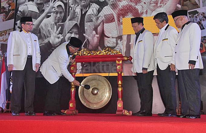 Dari kiri ke kanan, Ketua Majelis Syuro Partai Keadilan Sejahtera (PKS) Salim Segaf Al-Jufri, Presiden PKS Mohamad Sohibul Iman, Wakil Ketua Majelis Syuro Hidayat Nur Wahid, Ketua Majelis Pertimbangan Pusat PKS, Suharna Surapranata dan Ketua Dewan Syariah Surahman Hidayat saat tanda pukul gong dibukanya Pembukaan Rakornas PKS 2017 di Depok, Jawa Barat, Senin (6/3). Acara Rakornas PKS 2017 akan berlangsung hingga hari Rabu (8/3), mengambil tema besar, 'Kokoh Berkhidmat untuk Rakyat". AKTUAL/Humas DPP PKS