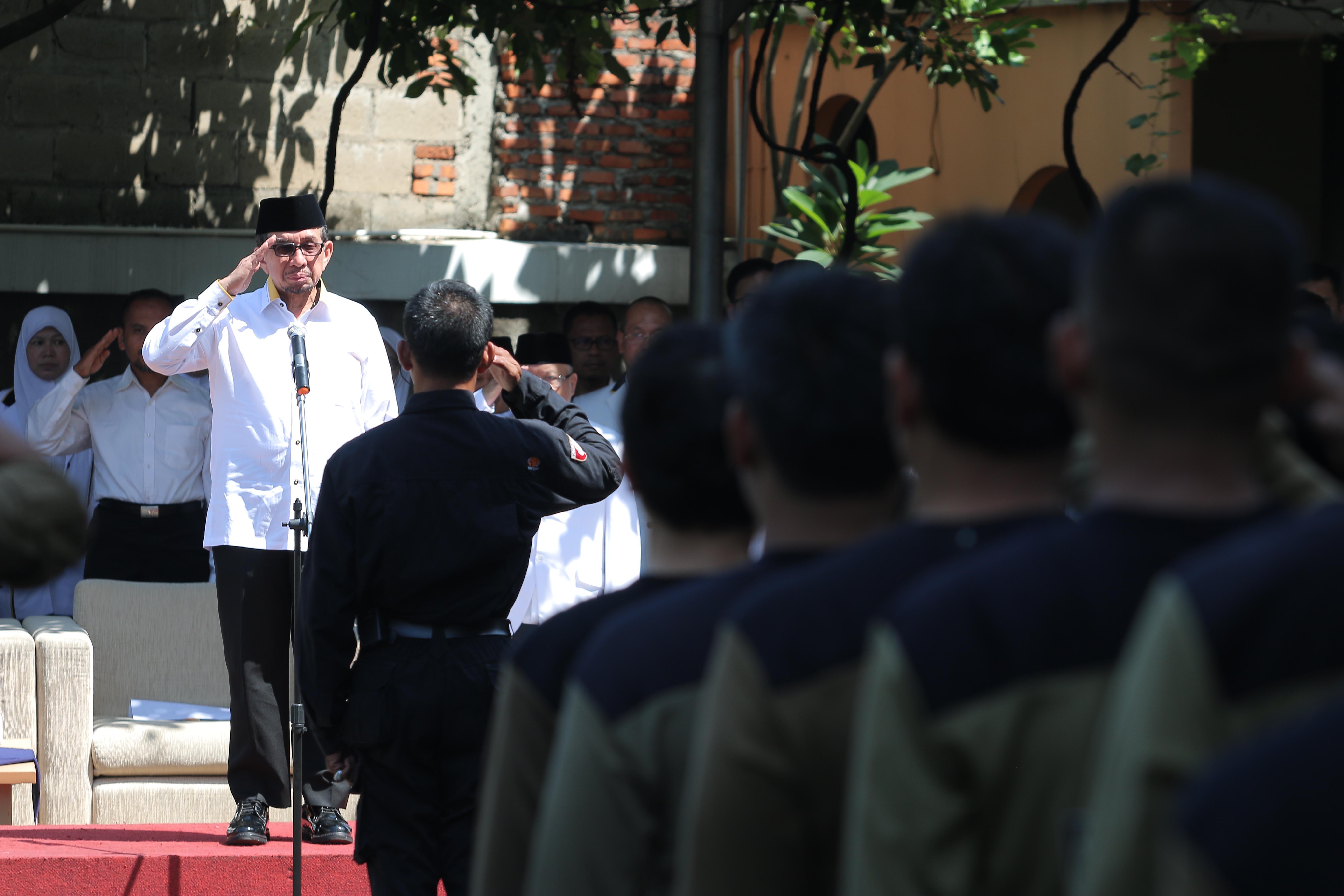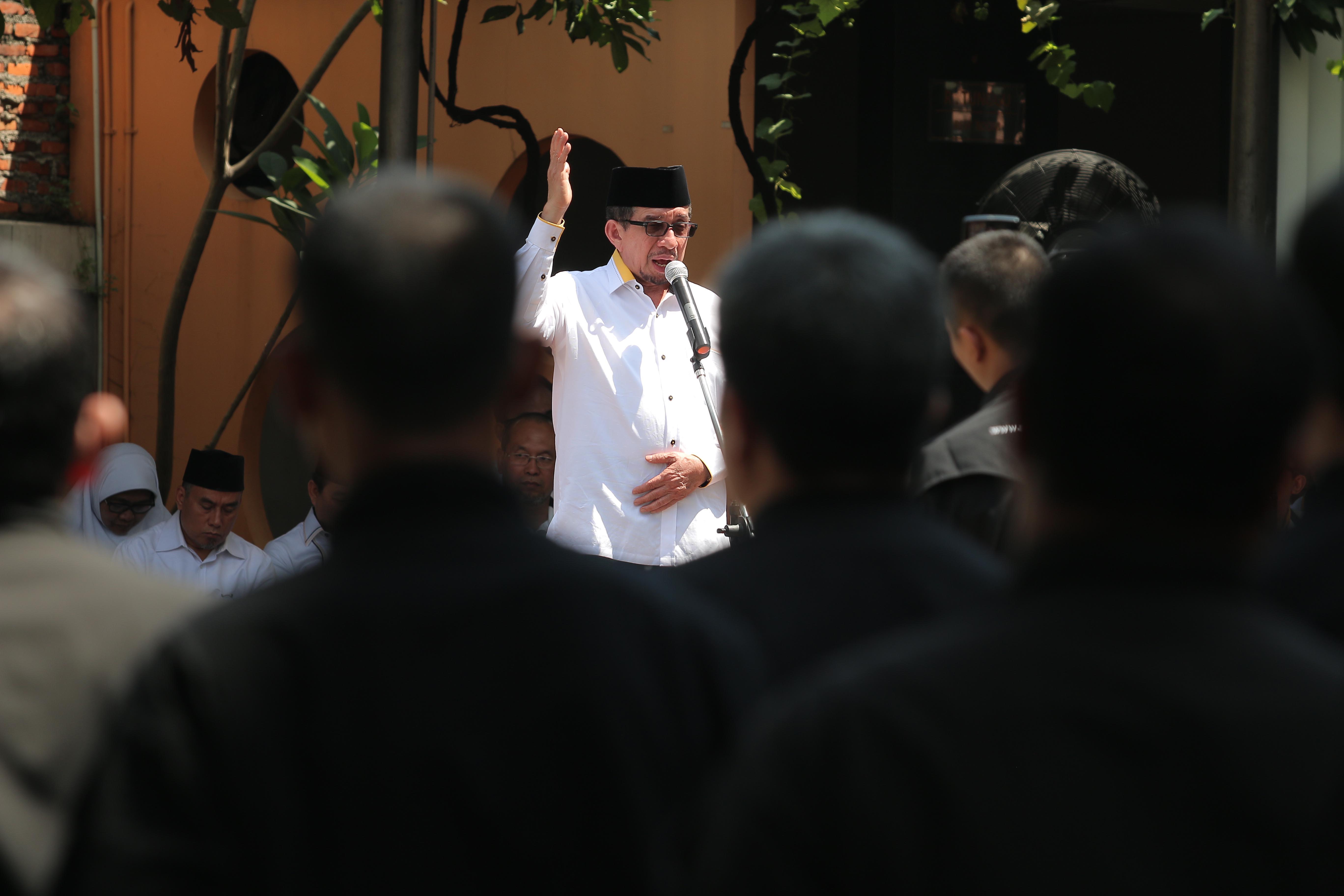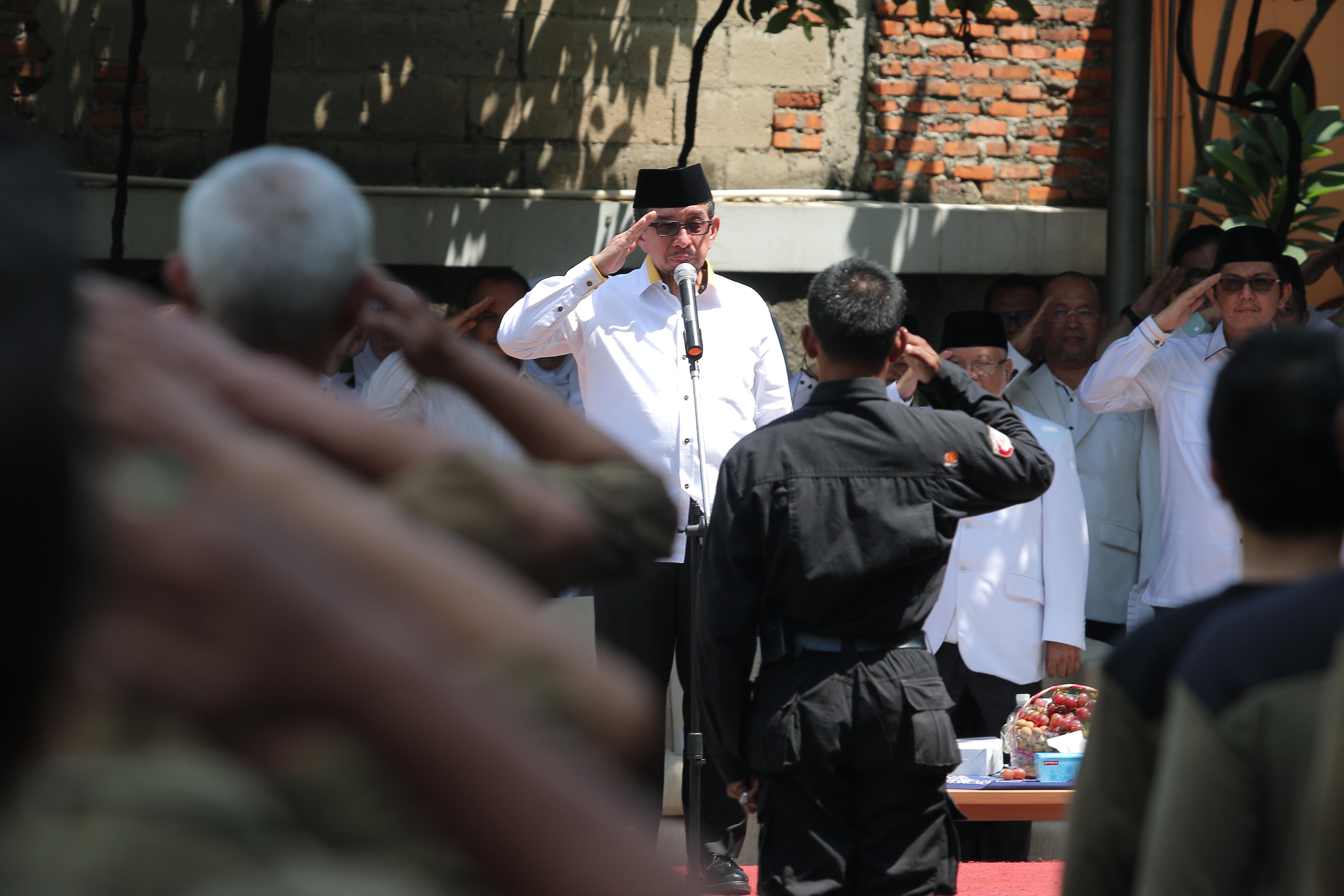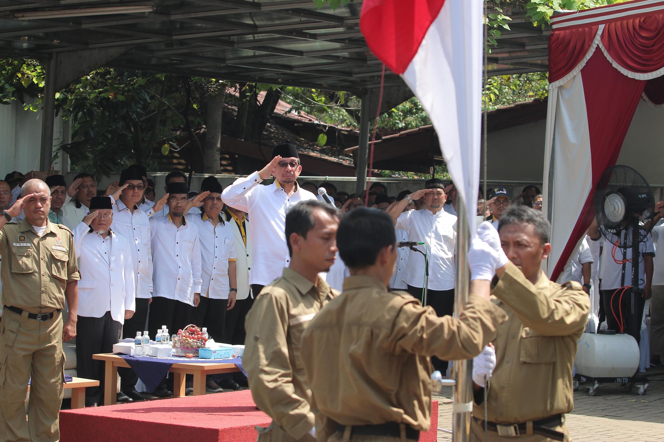 Ketua Majelis Syuro PKS Salim Segaf Al Jufri menjadi pembina upacara pada Upacara peringatan 17 Agustus di Kantor DPP PKS, Jakarta, Rabu (17/8). Dalam pesannya, Salim menyampaikan bahwa para pejuang dan syuhada telah berjuang mati-matian memerdekakan Indonesia tanpa pamrih dengan berharap meraih ridho Allah SWT. AKTUAL/HANDOUT