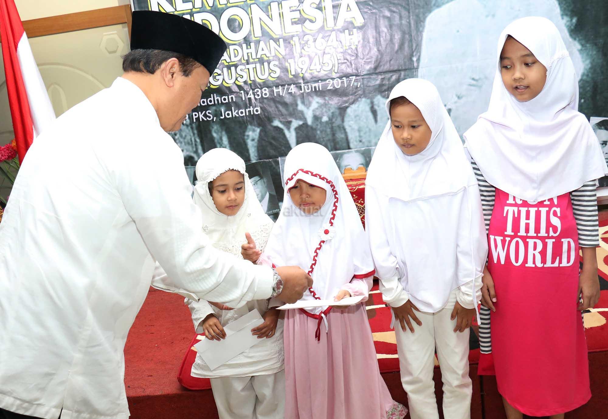 Ketua Majelis Syuro PKS Hidayat Nur Wahid memberikan santunan kepada anak yatim saat acara Tasyakuran 74 Tahun Hijriah Proklamasi Kemerdekaan RI di Aula MD Building, Jakarta Selatan, Minggu (4/6/2017). Acara ini dihadiri oleh Presiden PKS M. Sohibul Iman, Sekjen DPP PKS Mustafa Kamal, Wasekjen DPP PKS Abdul Hakim, Ketua Fraksi PKS DPR RI Jazuli Juawaini, Kabid Humas DPP PKS Ledia Hanifah, Kabid PKK DPP PKS Wirianingsih, Wakil Ketua Komisi VIII DPR-RI Iskan Qolba Lubis, Ketua Badan Perencanaan DPP PKS Bukhori Yusuf, Legiun Veteran Republik Indonesia (LVRI) dan beberapa anak yatim. AKTUAL/HO