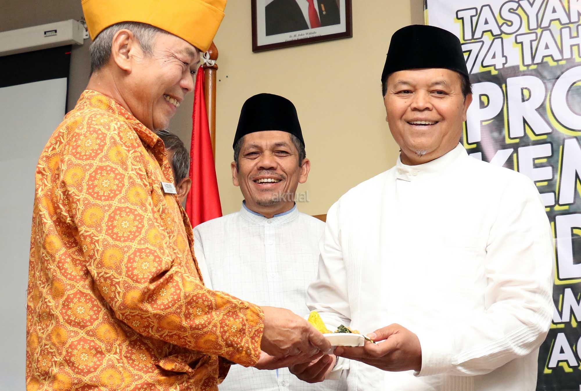 Ketua Majelis Syuro PKS Hidayat Nur Wahid memberikan cindera mata kepada perwakilan Legiun Veteran Republik Indonesia (LVRI) saat acara Tasyakuran 74 Tahun Hijriah Proklamasi Kemerdekaan RI di Aula MD Building, Jakarta Selatan, Minggu (4/6/2017). Acara ini dihadiri oleh Presiden PKS M. Sohibul Iman, Sekjen DPP PKS Mustafa Kamal, Wasekjen DPP PKS Abdul Hakim, Ketua Fraksi PKS DPR RI Jazuli Juawaini, Kabid Humas DPP PKS Ledia Hanifah, Kabid PKK DPP PKS Wirianingsih, Wakil Ketua Komisi VIII DPR-RI Iskan Qolba Lubis, Ketua Badan Perencanaan DPP PKS Bukhori Yusuf, Legiun Veteran Republik Indonesia (LVRI) dan beberapa anak yatim. AKTUAL/HO